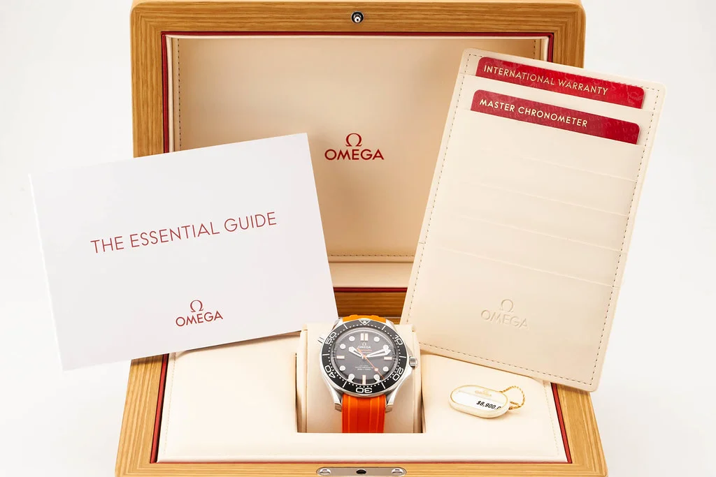Up for sale is a brand new Omega Seamaster 300 42mm Black & Orange Dial on Orange Rubber Strap, reference # 210.32.42.20.01.006. It comes complete with all boxes, papers, booklet, hang tag and Omega Warranty Card dated November 2025.