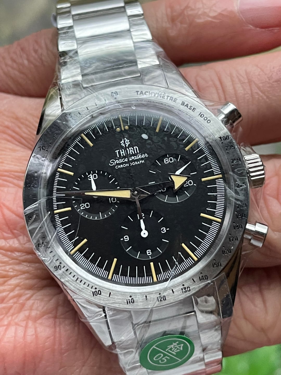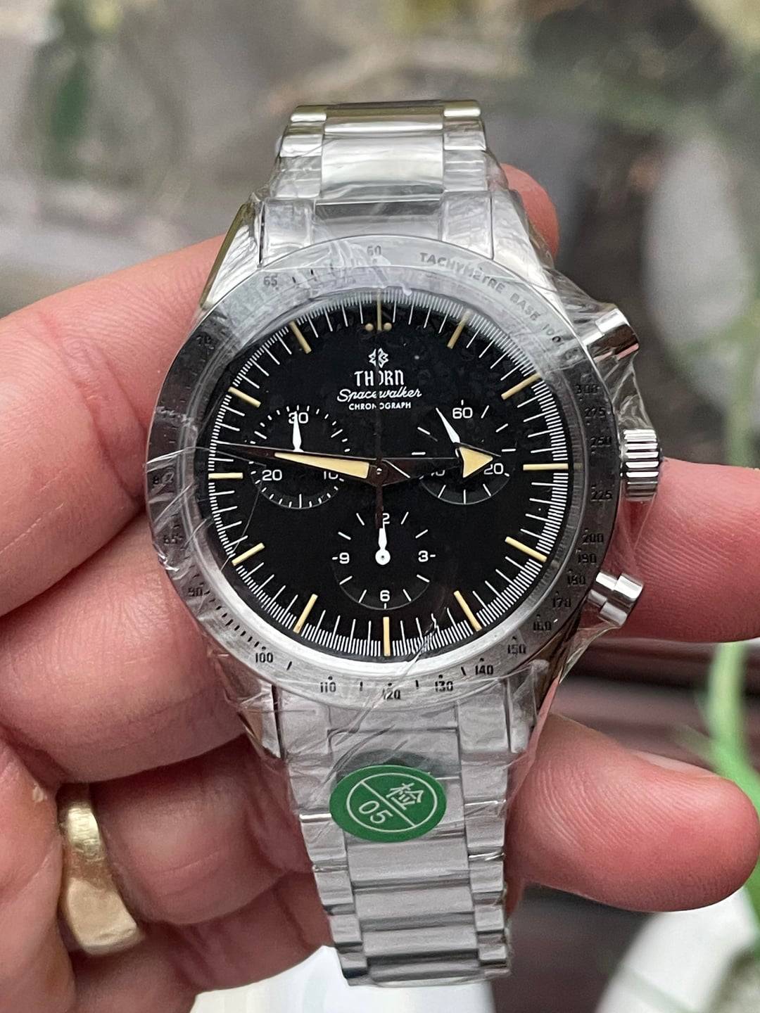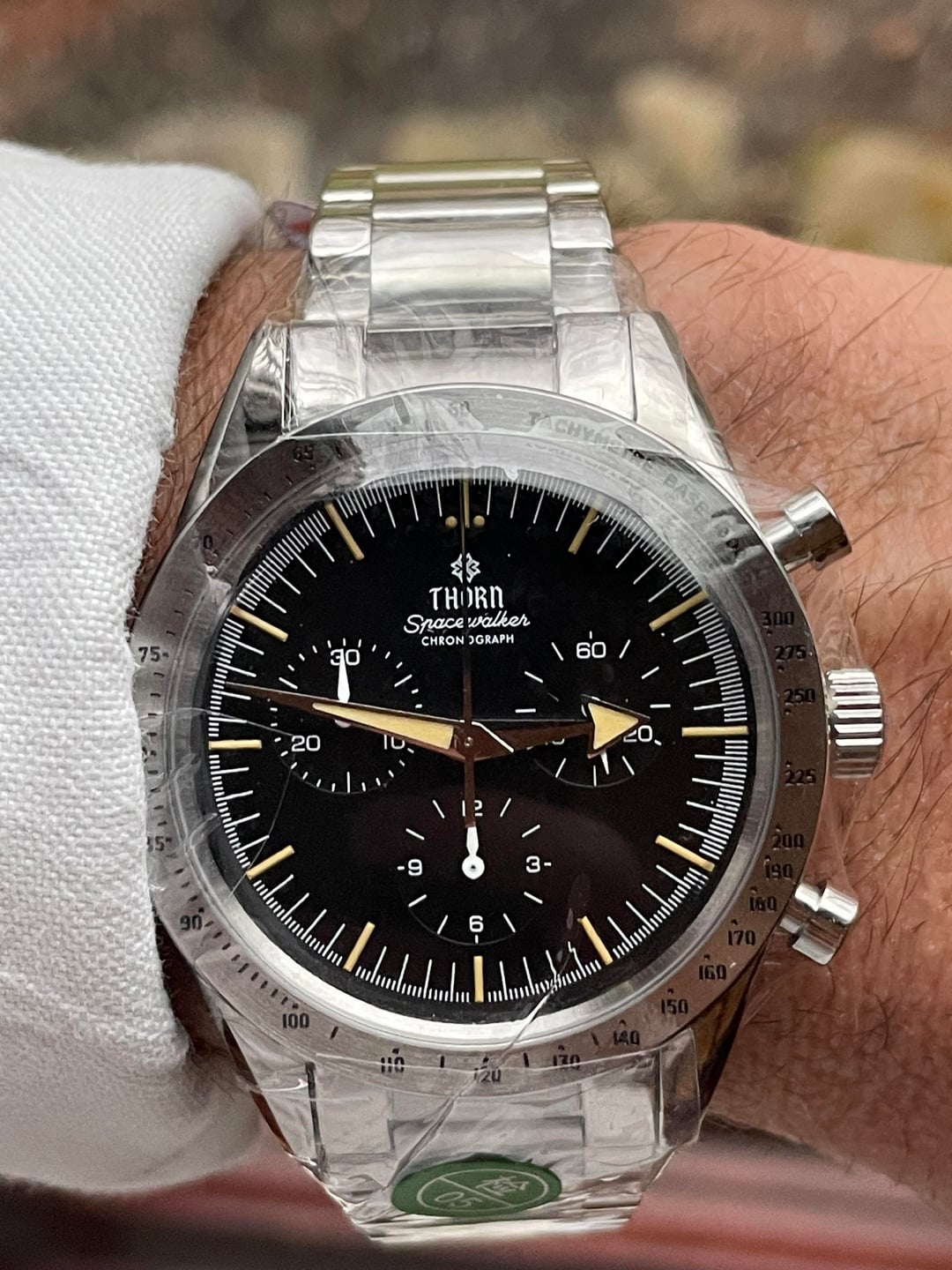 New in plastic Thorn Spacewalker Chronograph. Never worn quartz chrono Omega Broad Arrow homage. Shipping from Ohio for $185. Quartz movement