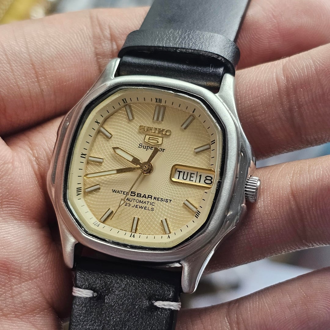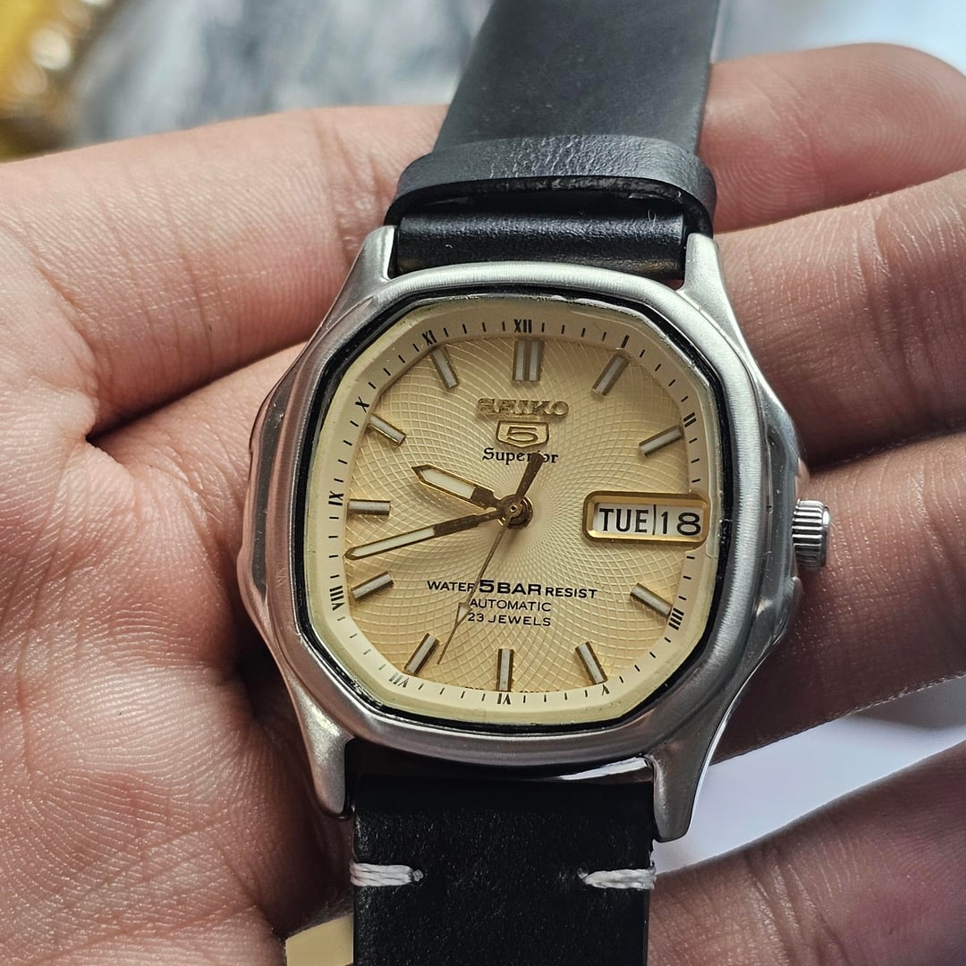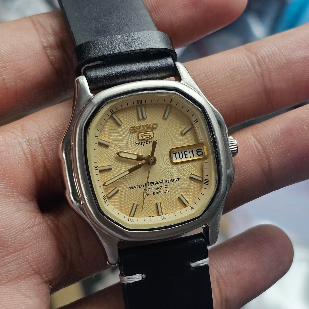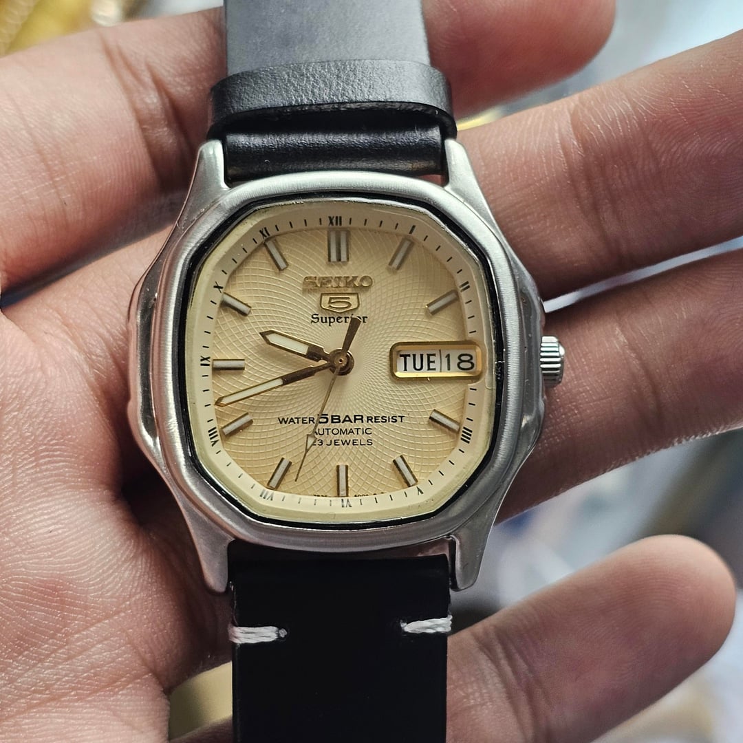 Hello! r/watchexchange, up for sale is a Seiko 5 Superior with an khaki coloured whirlpool dial. This is an automatic watch from the 90s that was mostly made available in the South East Asian & Japanese market as an upgraded version of the Seiko 5. It features a coveted whirlpool dial and a unique TV case shape. Condition: • Watch has just been recently serviced, runs perfectly well. . Case is in broadly okay condition with minimal scratches at the front. There is some damage to the back of the lugs, and in some portions of the case • Case was previously polished to remove a gold finish. In my opinion this is an aesthetic improvement, with it giving the watch a new lease of life after the gold plating faded over time in South East Asia's tropical climate. I would personally rate the polishing job as being fairly well done • Watch comes with a replacement box and a replacement strap. No papers Timestamp: https://drive.google.com/file/d/1URC4yTWt3_8fjwW5lB-rUJ4vqfPf4-eq/view?usp=drivesdk Pricing, Payment & Shipping Price: 290 USD Shipped via DHL express Payment Method: I heavily prefer WISE payment because it has substantially better rates but will take PayPal F&F or G&S with 4.4% Paid by buyer. No trades. Wiling to answer questions and hear offers