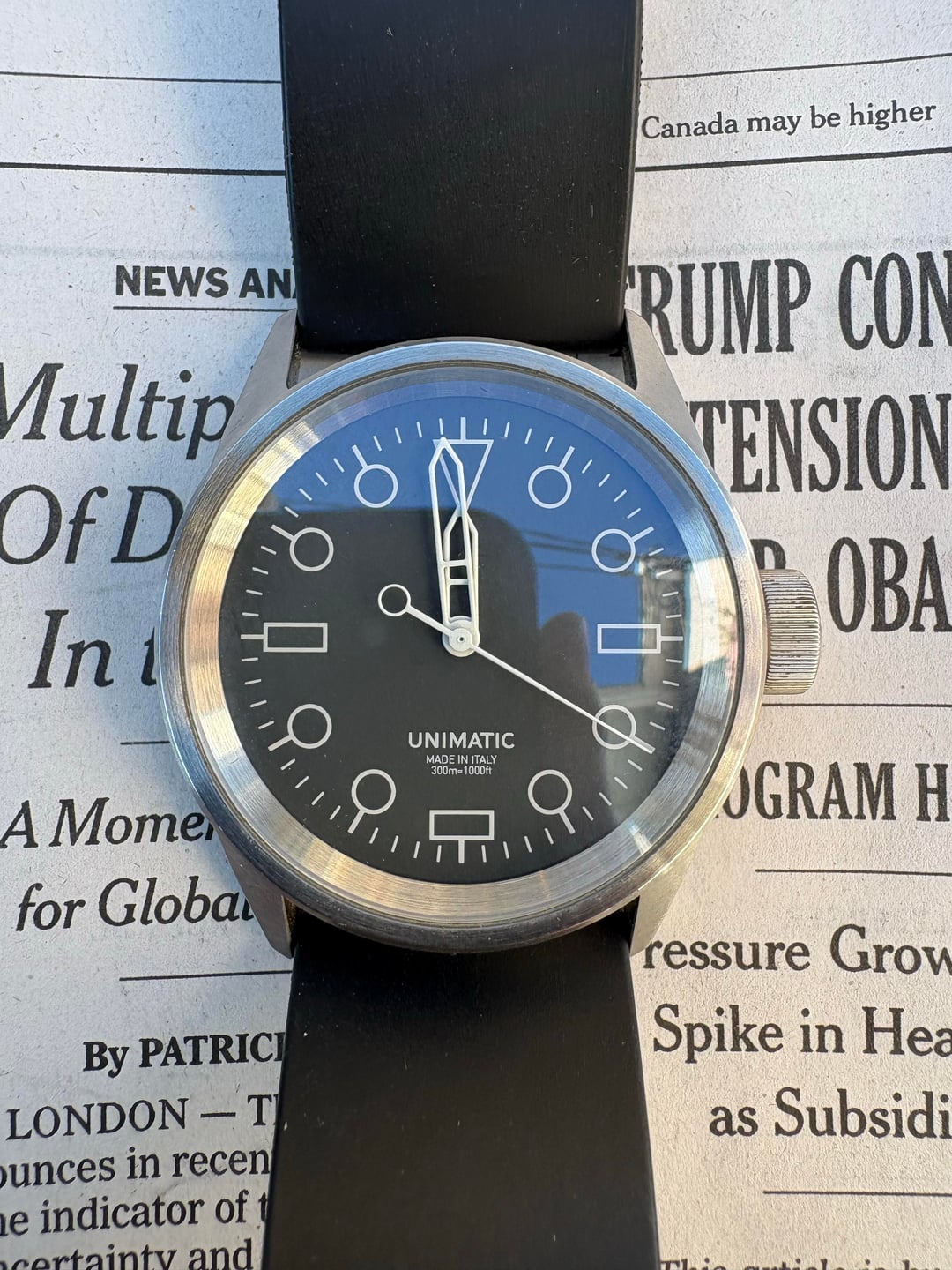 UNIMATIC U5S-A Modello Cinque Limited Edition 36mm Automatic SW200-1 Full Kit - a truly unique piece with the their iconic tool-watch aesthetic in a compact, highly wearable 36mm case. Love this piece, but I unfortunately need to consolidate for my grail. Limited Edition: This is one of only 300 pieces ever produced. #074 / 300 is individually numbered on the warranty card and caseback. Condition: Mint / Near-Mint. Worn only a few times, with the case and crystal flawless. It is running perfectly. Complete Set: The watch comes as a true Full Kit, including the original tough case, all manuals, both original straps, and the uniquely ID-sealed warranty card (as pictured). Key Specifications • Reference: Modello Cinque U5S-A • Movement: Swiss Automatic Sellita SW200-1 b (28,800 VPH, 41-Hour Power Reserve) • Case Diameter: 36 mm (Smallest, most comfortable size from Unimatic) • Lug-to-Lug: 43.7 mm • Water Resistance: 300 Meters (30 ATM) (Secured by a screw-down crown) • Crystal: Double Domed Sapphire with interior AR coating. • Dial: High-Contrast Black/Dark Gray with a minimalist, legible aesthetic. Included Full Kit (See Photo) • UNIMATIC Modello Cinque U5S-A Watch • Original UNIMATIC "Tough Case" • Original \*\*Warranty Card\*\* (ID #074/300) • Original Black Tapered TPU Rubber Strap (Attached) • Original Black Calf Leather Strap (Still sealed in plastic) Asking 750USD shipped, CONUS only please. Happy to do a video call and answer any questions, thanks! Video here: [https://jmp.sh/NKDsxX9P](https://jmp.sh/NKDsxX9P)