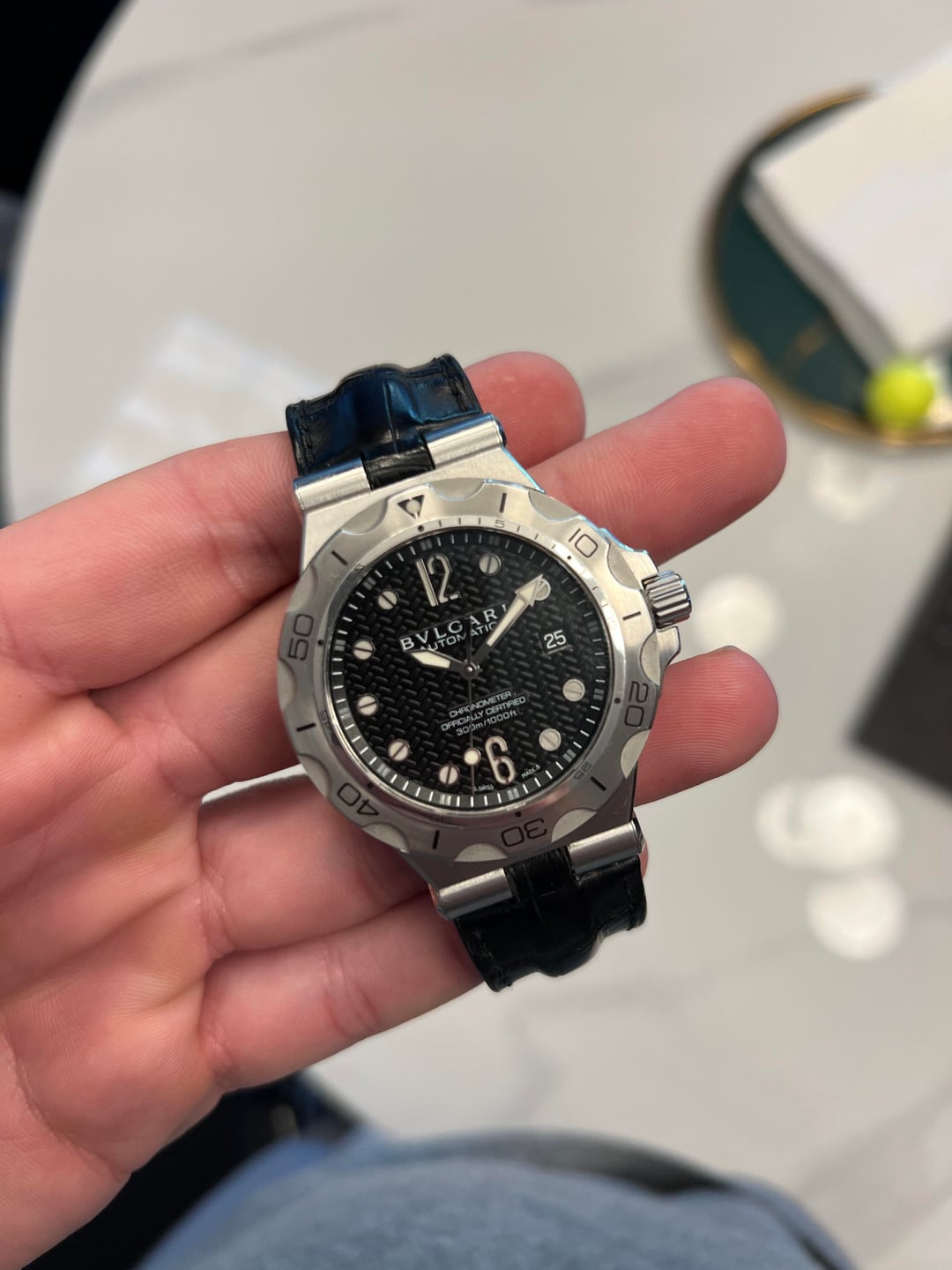 Putting up for sale my Bulgari Diagono Scuba, reference DP42SSD. This is the full size 42 mm stainless steel model that hits a really nice balance between Italian design and proper Swiss dive watch credentials. It runs the chronometer grade ETA 2892-A2 automatic movement and wears like a modern sports watch without being over the top. The dial is a deep matte black with a cross hatch texture, applied indices, a framed date at 3, and the classic engraved Bulgari bezel. On the wrist it feels equal parts dive watch and design piece. Condition Excellent overall. Case shows only light wear from careful use, nothing sharp or distracting. Crystal is clean. Dial and hands are perfect. The factory black alligator strap is still supple and in good shape, with the signed deployant clasp working as it should. No box or papers. Specs Reference: DP42SSD Case: 42 mm stainless steel Movement: Automatic ETA 2892 A2 chronometer (COSC) Crystal: Sapphire Water resistance: 300 m Strap: Factory black alligator with signed deployant clasp Price: $1,499 USD, insured shipping within the U.S. included Payment: Zelle, bank wire, or PayPal F&F. PayPal G&S available at +3 percent. Happy to provide references on request. I am a long time collector and seller with positive history on r/Watchexchange, Watchuseek, and eBay. DM with any questions or if you want additional photos.