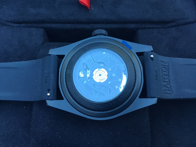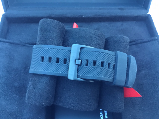 It comes on a Hybrid leather and rubber strap with exclusive stitching and folding clasp in black PVD-treated steel. Additional black and blue striped nato strap. *THIS IS SITTING ON AN AWESOME RUBBER STRAP, AND ORIGINAL OEM STRAPS HAVE NOT BEEN TOUCHED