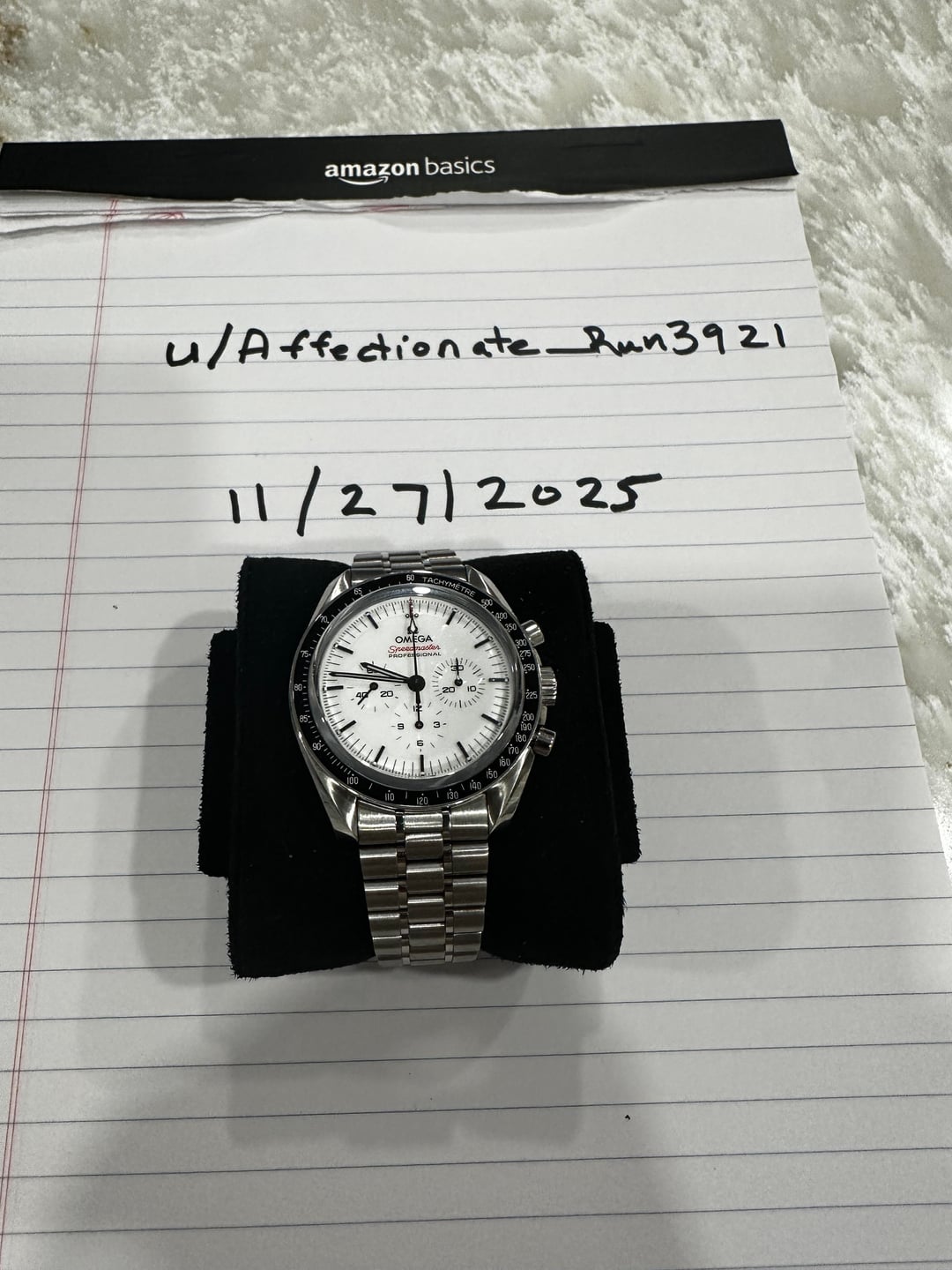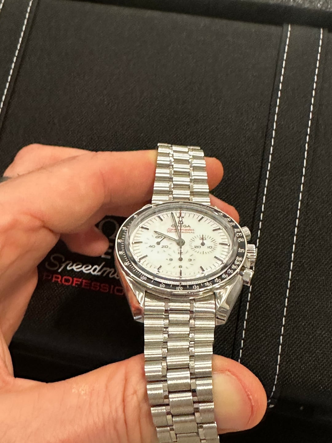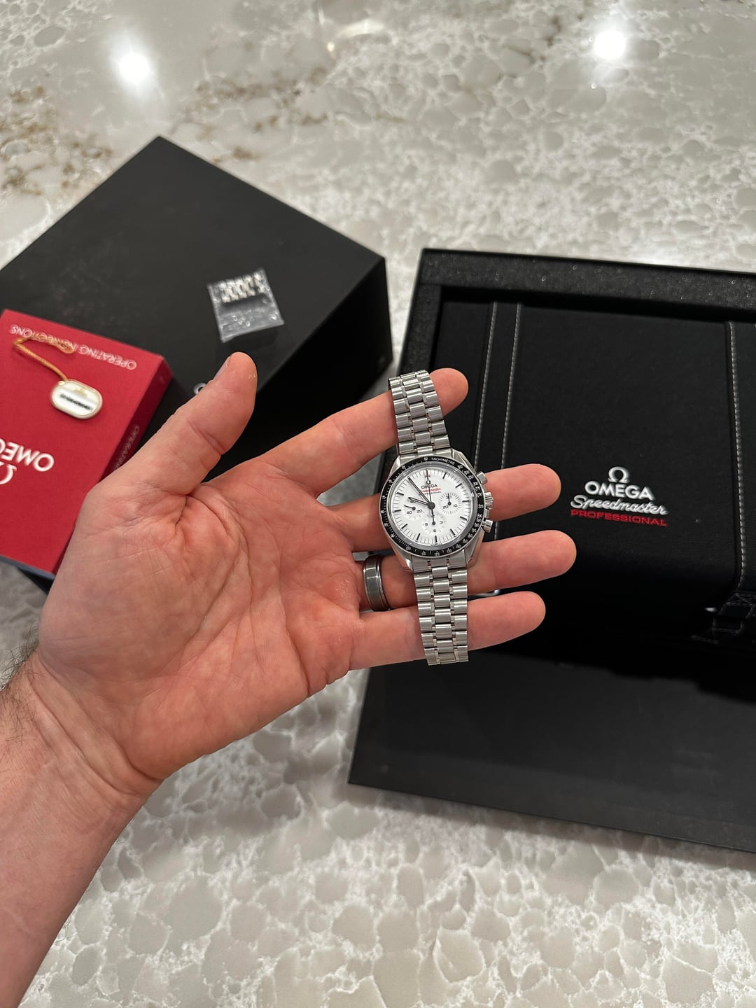 Omega Speedmaster White Moonwatch 310.30.42.50.04.001 $7900 shipped. Zelle or bank wire only. This is my own watch. I’m not a watch reseller or dealer. Warranty card dated is 9/20/2025. [Video link here.](https://imgur.com/a/f8qvfZj) Please read this entire description. I’ve tried to answer all likely questions but let me know if you have any more. I bought it grey unworn 2 weeks ago. Been waiting for 3 years now on my Panda Daytona and wanted a white chrono to hold me over. Talked with AD last week and he indicated I’m up very soon. The speedy is beautiful, but it’s not the Daytona I want, and I didn’t realize I’m not a speedy guy until I had this on my wrist. I wore it twice. This is essentially a brand new watch. Everything you see in the video link is included - exactly the same as what comes with the watch from the Omega boutique if you walked in and bought one. Outer black box, inner box, instruction booklet, moonwatch booklet, travel case, polishing cloth, pictogram, chronometer and warranty card dated 9/20/2025, full links, and serialized hangtag. As you can see, I still have the sticker for the sapphire case back. (I took it off when I wore it, but put it back on for the pictures and will ship it to the buyer. You cannot find a nicer one of these at a better price. I had looked for a while and this was a unique deal so I impulse bought it, like we watch people sometimes do! I wore it on a rubber strap once (which I’m keeping, it’s off one of my other 20mm pieces), and I also wore it once on the bracelet. I changed the strap myself and put the faintest of a tool mark on the underside of the lugs in doing so. I have to look close at the inside back of the lugs with a flashlight and a magnifying glass to see it (that’s how I noticed it). I can’t get those slight marks to show up in a photograph (see close up) but am honest and want to mention it here. What forms of payment are acceptable? Zelle. Nothing else. I’m happy to do a video call if you want (but not today on Thanksgiving). Price is next day shipped and insured for purchase price. I’m in the Jacksonville FL area if anyone happens to be local. This is a beautiful and highly desired piece. Please let me know if any questions I failed to answer here.