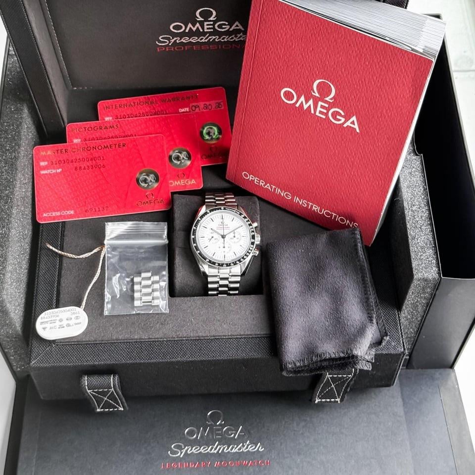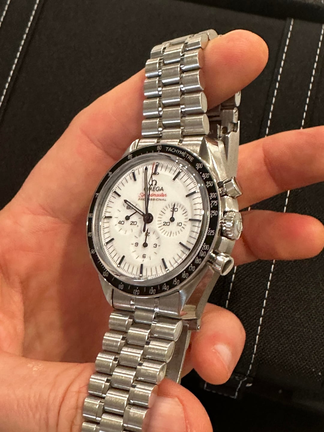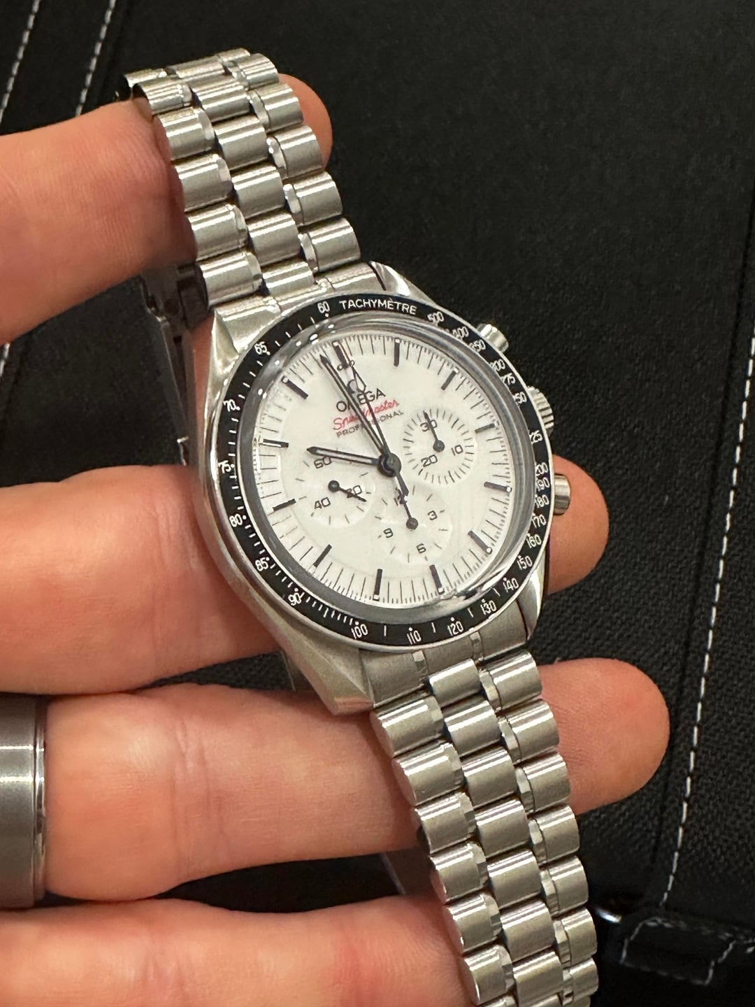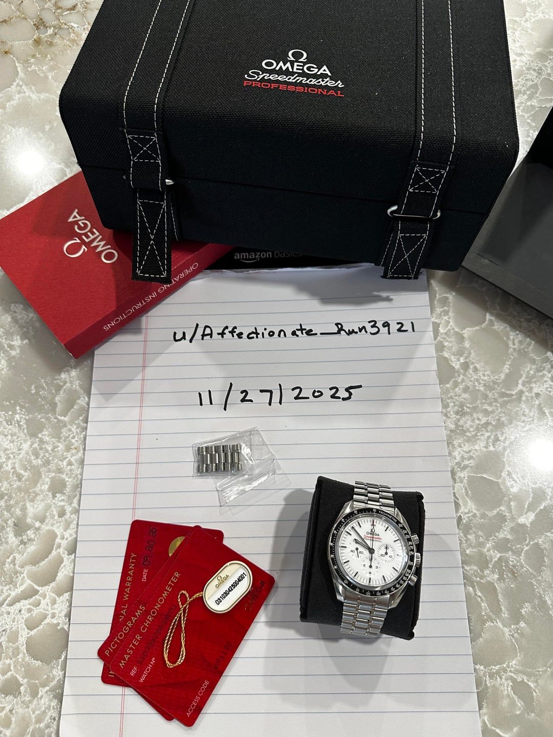Omega Speedmaster White Moonwatch 310.30.42.50.04.001 $7900 shipped. Zelle or bank wire only. This is my own watch. I’m not a watch reseller or dealer. Warranty card dated is 9/20/2025. [Video link here.](https://imgur.com/a/f8qvfZj) Please read this entire description. I’ve tried to answer all likely questions but let me know if you have any more. I bought it grey unworn 2 weeks ago. Been waiting for 3 years now on my Panda Daytona and wanted a white chrono to hold me over. Talked with AD last week and he indicated I’m up very soon. The speedy is beautiful, but it’s not the Daytona I want, and I didn’t realize I’m not a speedy guy until I had this on my wrist. I wore it twice. This is essentially a brand new watch. Everything you see in the video link is included - exactly the same as what comes with the watch from the Omega boutique if you walked in and bought one. Outer black box, inner box, instruction booklet, moonwatch booklet, travel case, polishing cloth, pictogram, chronometer and warranty card dated 9/20/2025, full links, and serialized hangtag. As you can see, I still have the sticker for the sapphire case back. (I took it off when I wore it, but put it back on for the pictures and will ship it to the buyer. You cannot find a nicer one of these at a better price. I had looked for a while and this was a unique deal so I impulse bought it, like we watch people sometimes do! I wore it on a rubber strap once (which I’m keeping, it’s off one of my other 20mm pieces), and I also wore it once on the bracelet. I changed the strap myself and put the faintest of a tool mark on the underside of the lugs in doing so. I have to look close at the inside back of the lugs with a flashlight and a magnifying glass to see it (that’s how I noticed it). I can’t get those slight marks to show up in a photograph (see close up) but am honest and want to mention it here. What forms of payment are acceptable? Zelle. Nothing else. I’m happy to do a video call if you want (but not today on Thanksgiving). Price is next day shipped and insured for purchase price. I’m in the Jacksonville FL area if anyone happens to be local. This is a beautiful and highly desired piece. Please let me know if any questions I failed to answer here.
