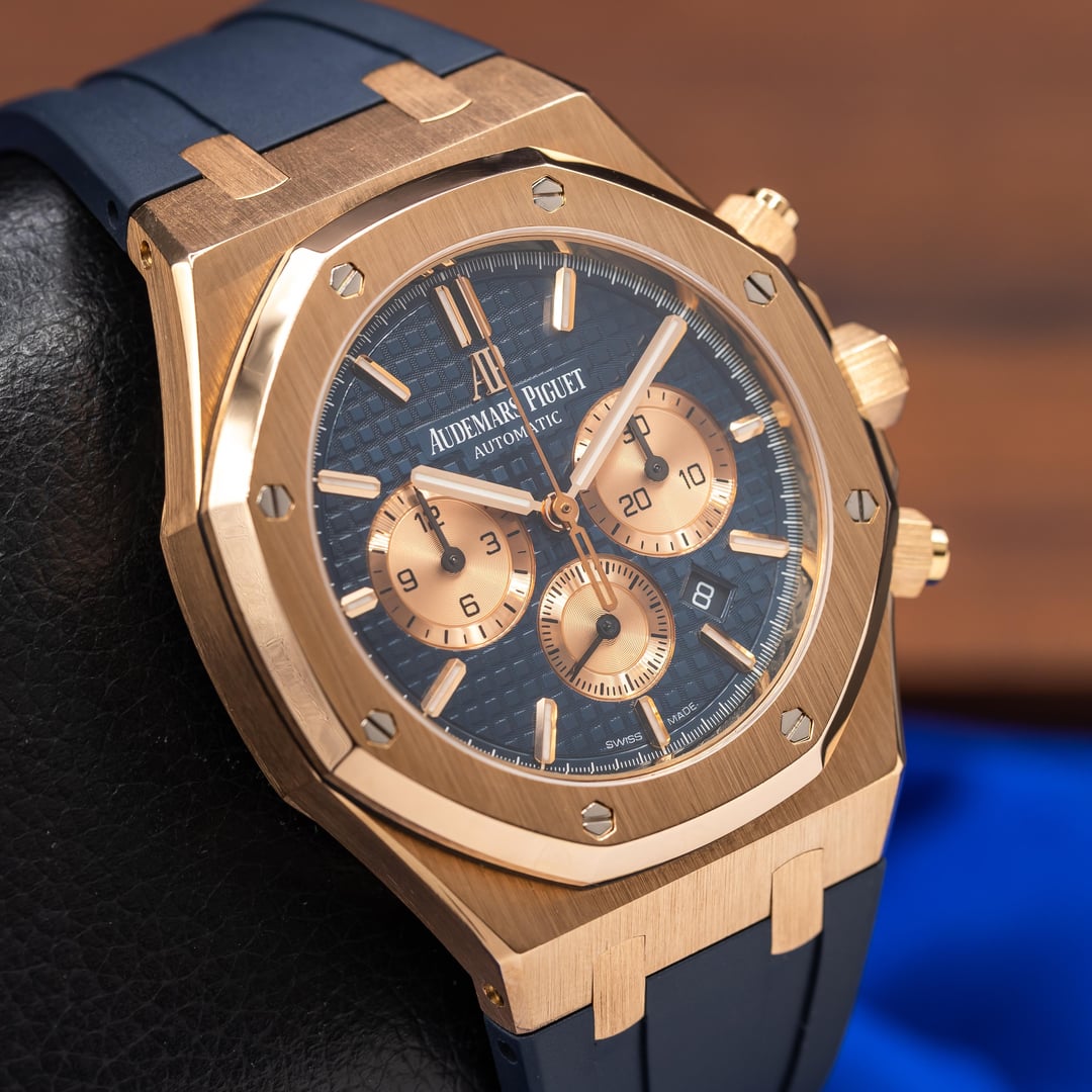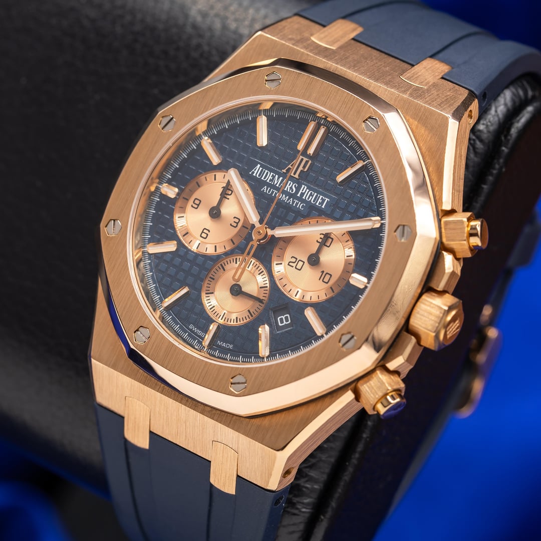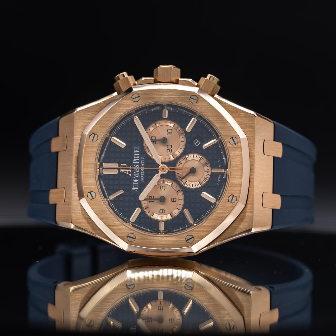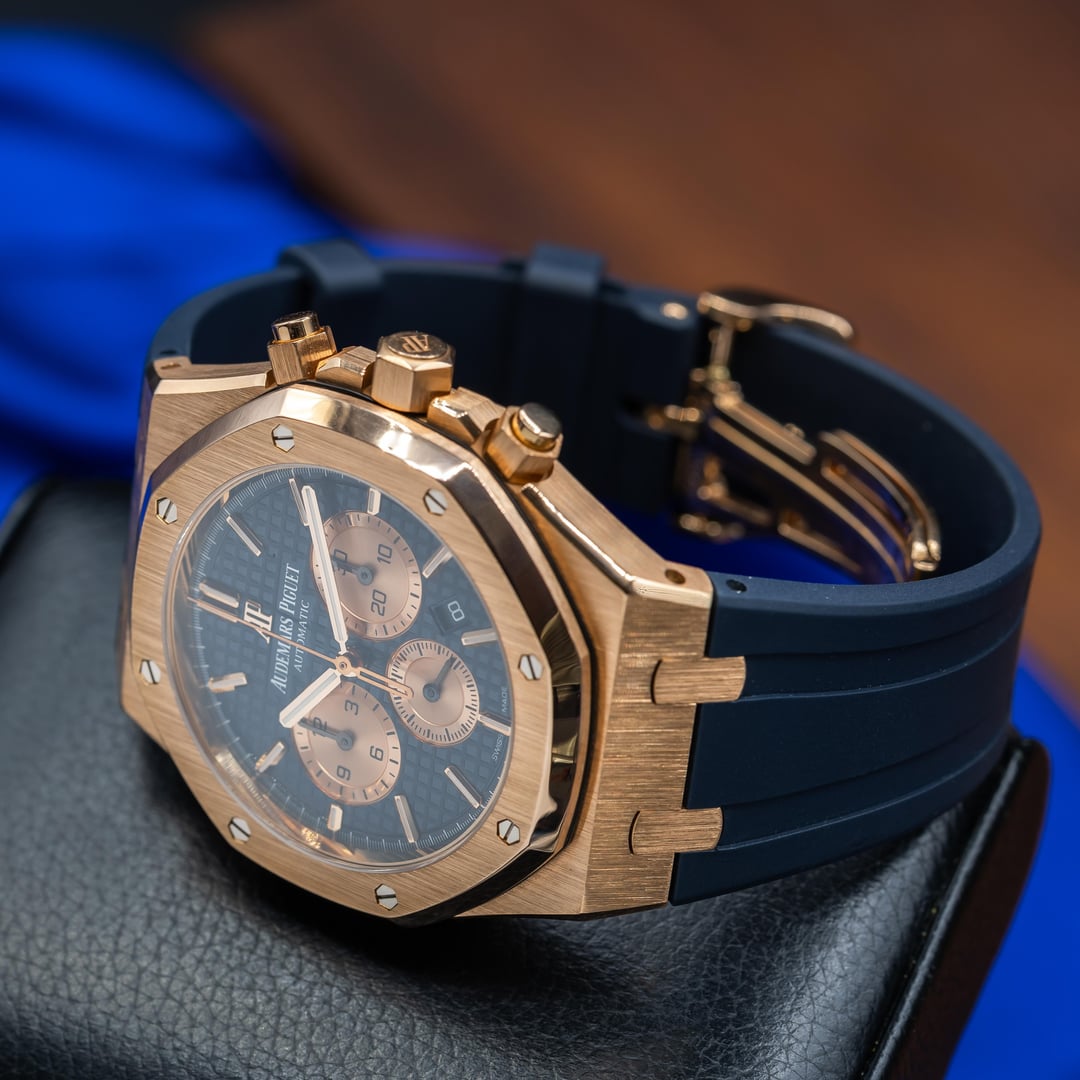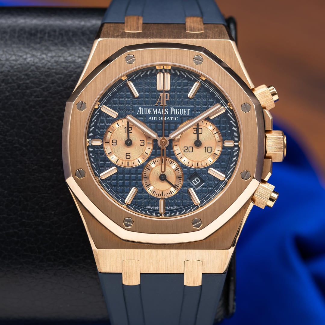 AUDEMARS PIGUET Royal Oak Rose Gold Blue Dial Chronograph 26331OR.OO.D315CR.01 Price: $56,900 One of the most sought-after Royal Oak chronographs, the 26331OR pairs a solid 18k rose gold case with a deep blue Grande Tapisserie dial and a matching blue leather strap. Its 41mm size hits the sweet spot between sport and elegance, and the rose gold bezel adds unmistakable wrist presence. This is a favorite among collectors looking for a statement piece that still maintains everyday wearability. This watch is in excellent condition. Please review the pictures closely for accuracy. The photos are taken with a high-powered macro lens and may show imperfections not typically seen with the human eye. Includes: \- Double Box \- Warranty Card (2018) \- Booklets We deal with absolute transparency and welcome any communication regarding the watch. The watch ships overnight priority FedEx fully insured within 2 business days of purchase. Charlotte, NC