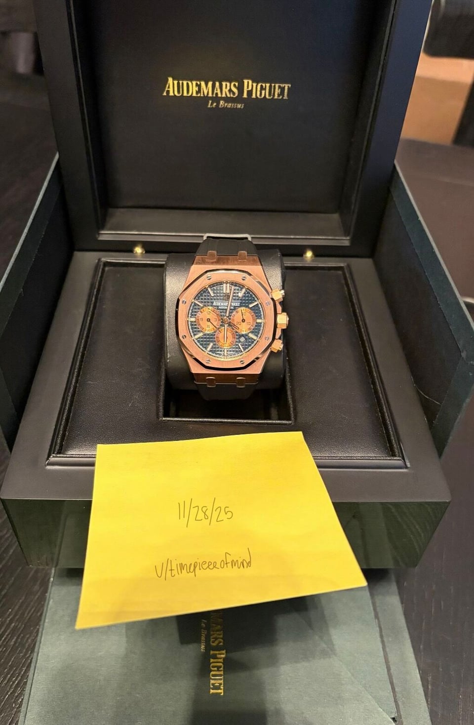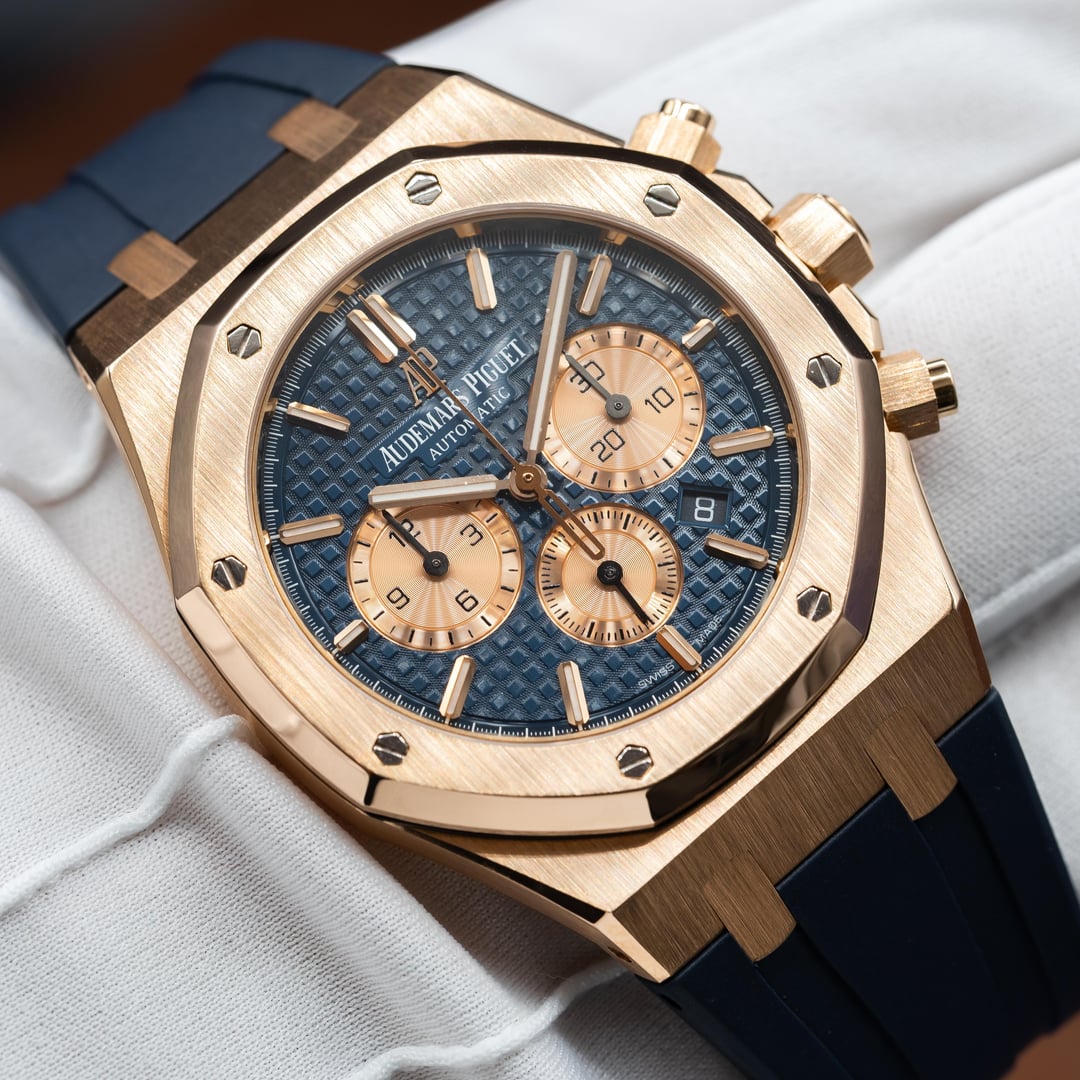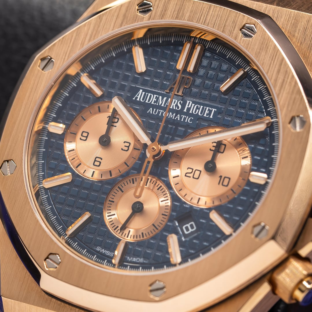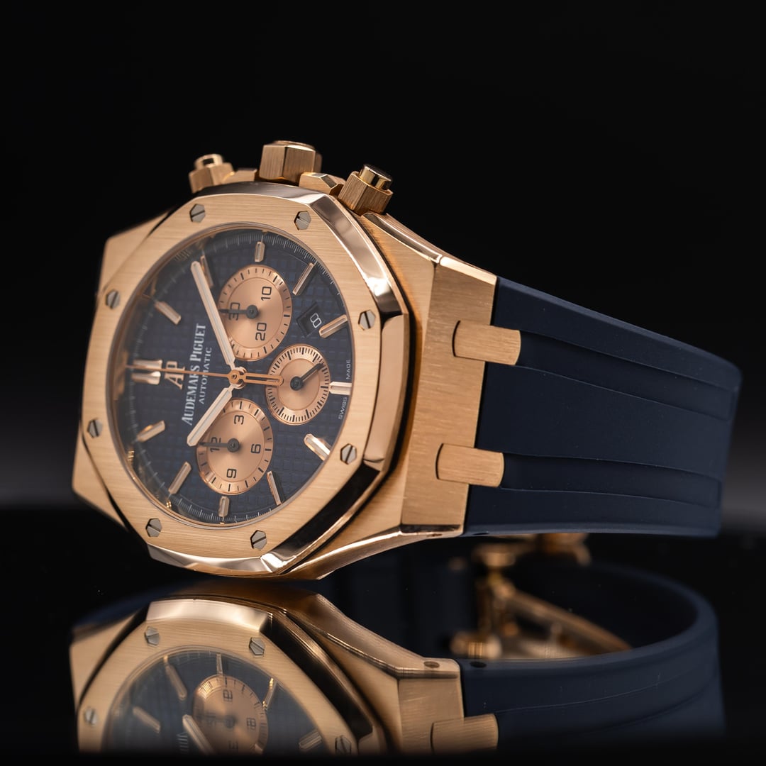 AUDEMARS PIGUET Royal Oak Rose Gold Blue Dial Chronograph 26331OR.OO.D315CR.01 Price: $56,900 One of the most sought-after Royal Oak chronographs, the 26331OR pairs a solid 18k rose gold case with a deep blue Grande Tapisserie dial and a matching blue leather strap. Its 41mm size hits the sweet spot between sport and elegance, and the rose gold bezel adds unmistakable wrist presence. This is a favorite among collectors looking for a statement piece that still maintains everyday wearability. This watch is in excellent condition. Please review the pictures closely for accuracy. The photos are taken with a high-powered macro lens and may show imperfections not typically seen with the human eye. Includes: \- Double Box \- Warranty Card (2018) \- Booklets We deal with absolute transparency and welcome any communication regarding the watch. The watch ships overnight priority FedEx fully insured within 2 business days of purchase. Charlotte, NC