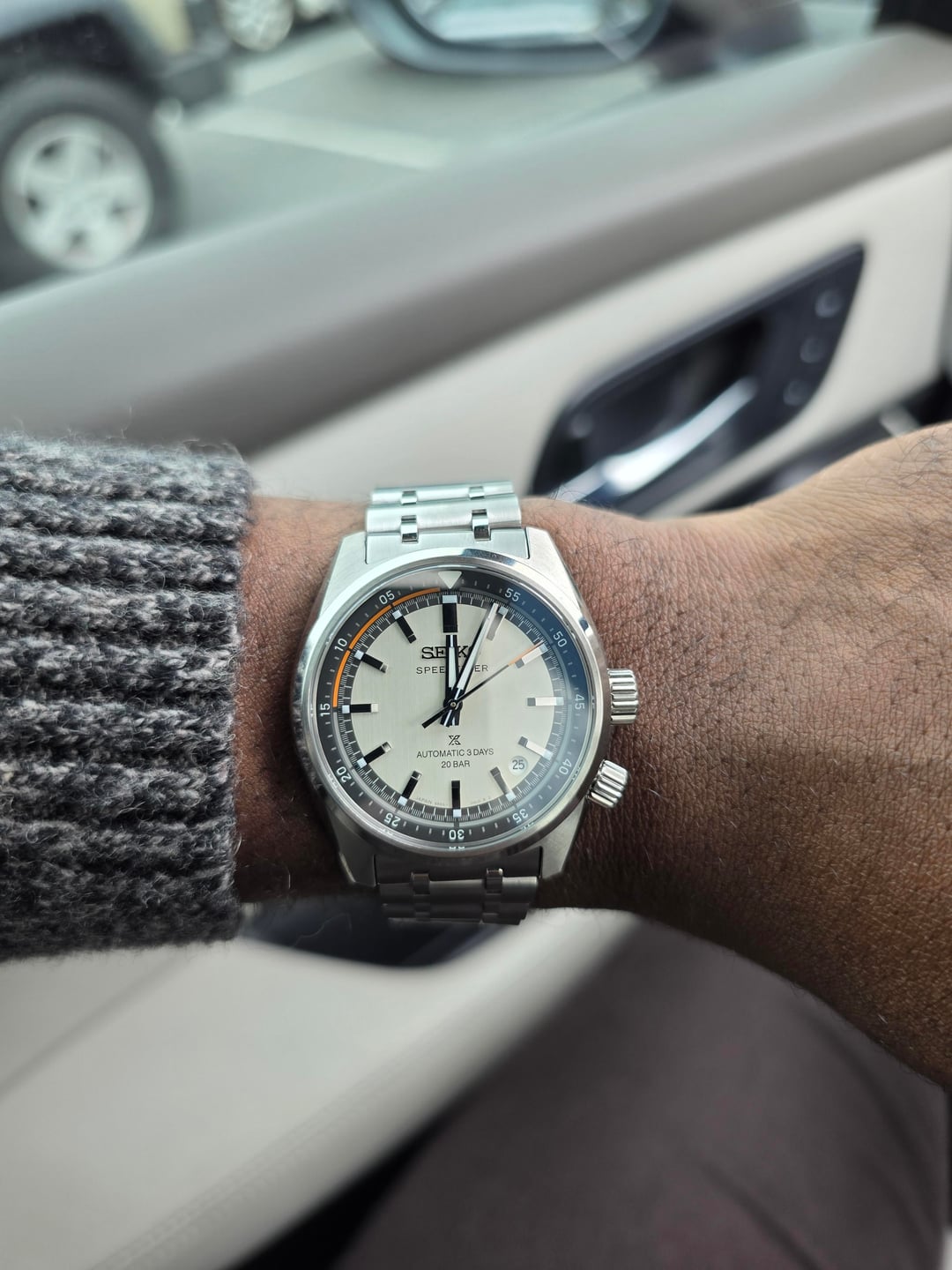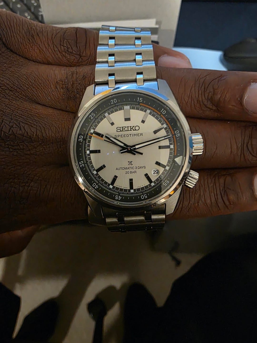 Letting go of my Seiko SPB513, part of the recently released Speedtimer mechanical line. Condition: Flawless. Sized and worn once. Dial: Beautiful cream/white tone that hits differently in various light. Bracelet: One of the best Seiko has put out in this price range — solid, tight, and extremely comfortable. Movement: Running within spec with new 6R55 movement. Retail: ~$995. Price: $850 shipped (CONUS). Primarily looking to sell, but I’ll entertain trade-down offers + cash for a clean daily-wear 3-hander on a great bracelet. Feel free to reach out with any questions or reasonable offers.