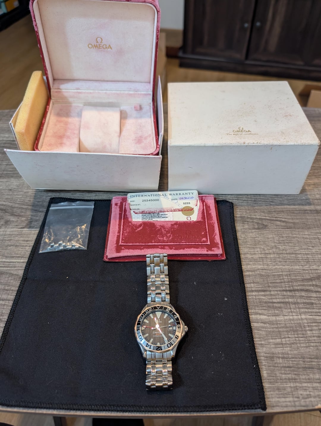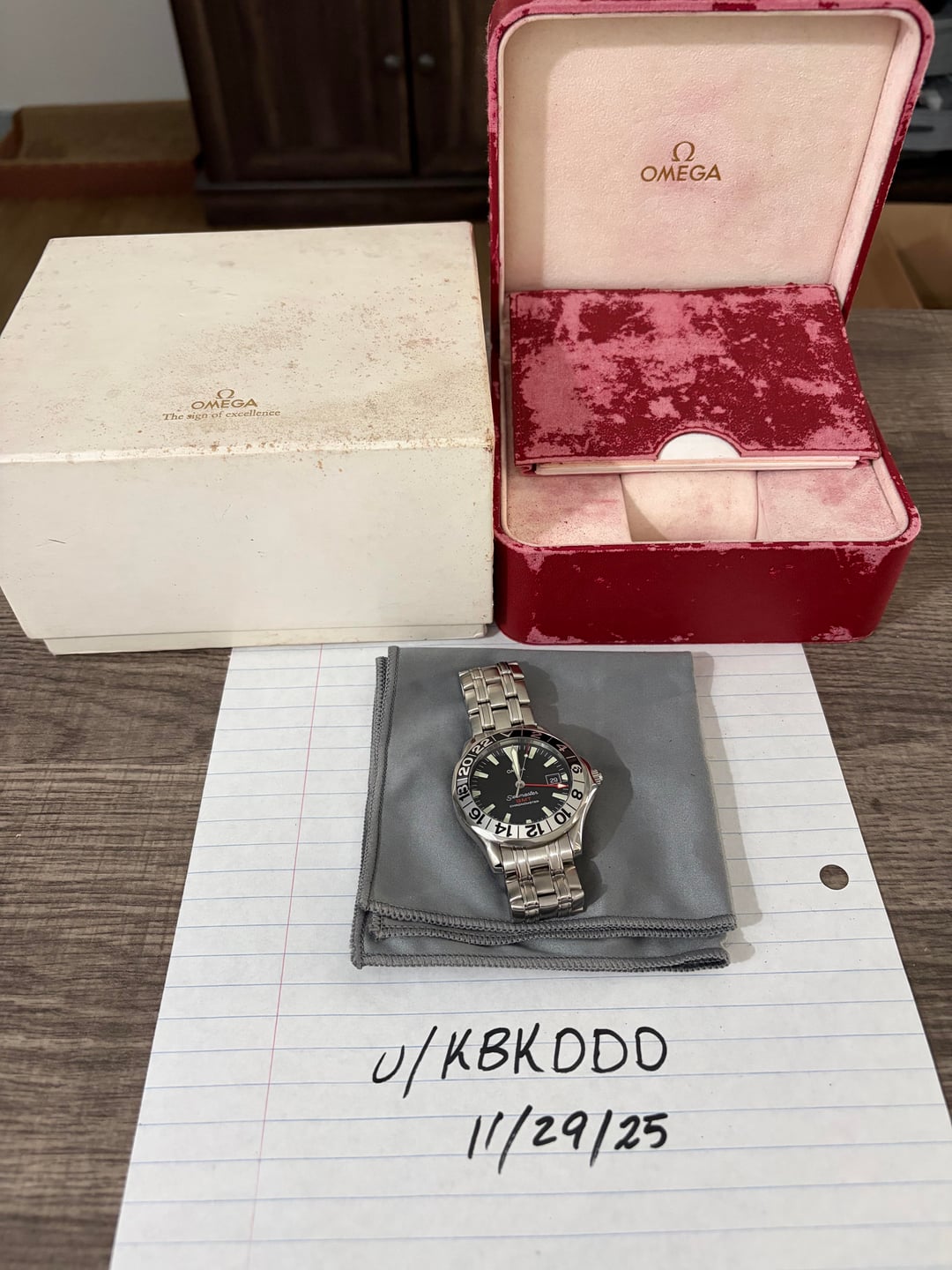 Looking to part with my beautiful Seamaster GMT 50th Anniversary (probably one of Omega’s better pieces). In great condition, bezel is free from fading or scratching and rotates with great feedback, only signs of wear are minimally on the bracelet and behind the lugs due to bracelet to strap changes. Bracelet doesn’t fit my 7.25” wrist but does come with an extra half link but no pin to actually use the half link. Comes with red leather box (in poor but serviceable condition as per usual) and a warranty card dated early 2002. I am not the original owner so I don’t know its service history prior to my ownership. I don’t own a timegrapher so I can’t speak to deviations or amplitude but the watch has given me no issues with timekeeping. Asking $2700 shipped via FedEx fully insured. Accepting PayPal, Zelle, Venmo Not looking for trades. CONUS shipping only!