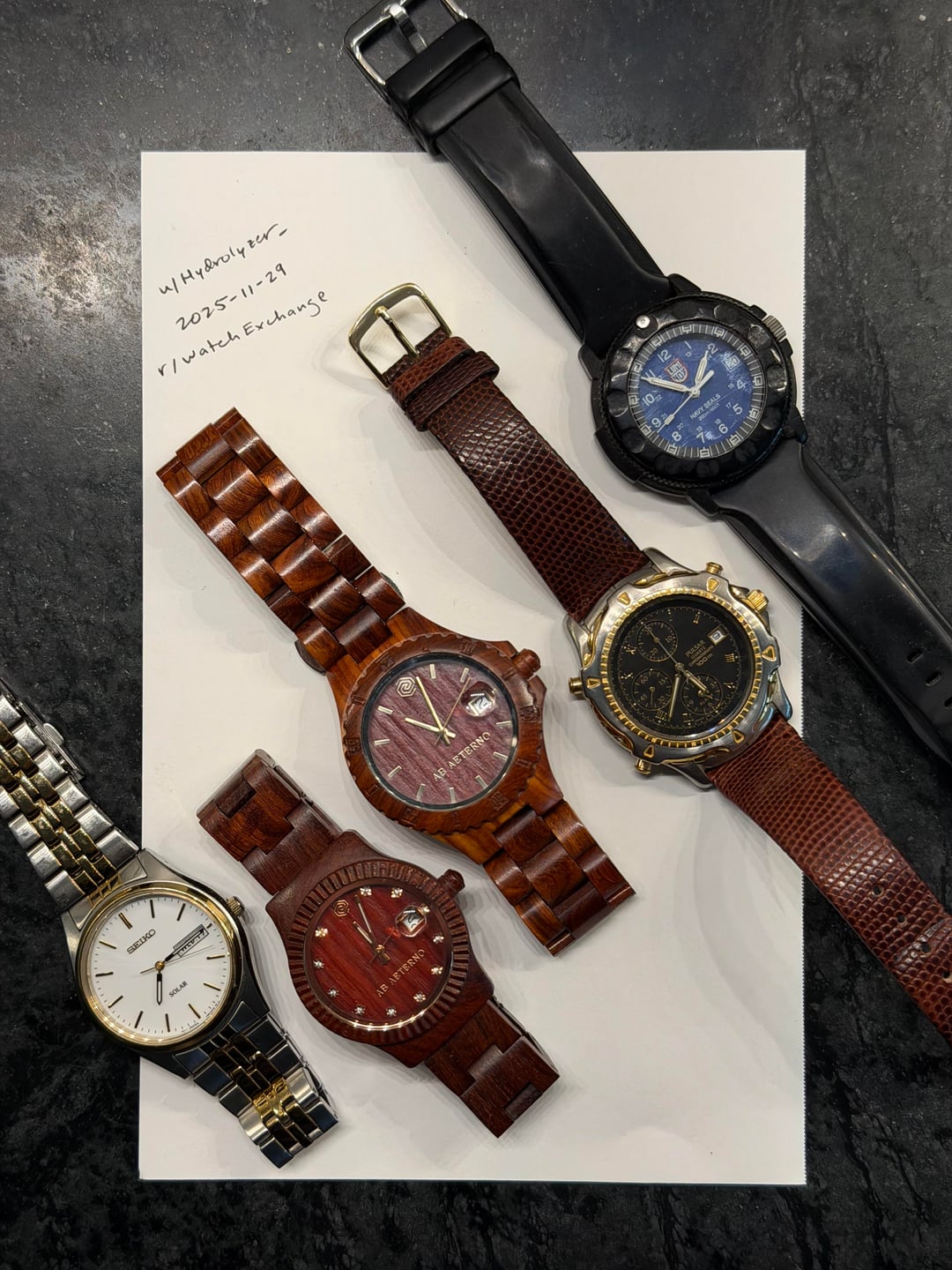 Selling my parents watches they are no longer using. From Left to Right: \[$60 OBO\] Seiko V158-0AA0 (Solar Dress Watch). Works, good condition. \[$10 OBO\] AB Aeterno Wooden Watch Men's (Red Dial) — not running (dead batt) \[$10 OBO\] AB Aeterno Wooden Watch Women's (Red Dial) — not running (dead batt) \[$20 OBO\] Pulsar (“Seiko-derived”) Quartz Chronograph Y182-6A40 — not running (dead batt) \[$40 OBO\] Luminox 200m Diver (“Navy SEAL”-type). Working, very worn bezel letters, bezel action still good. Thanks! Edit: I'd sell all 5 for $100 + shipping.