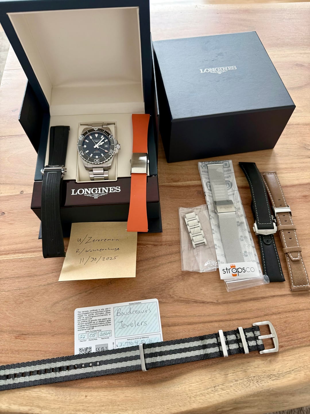 Hello [r/watchexchange](/r/watchexchange/), for sale here is my Longines Hydroconquest GMT. This is the 41mm version L3.790.4.56.6 . OEM listing: [https://www.longines.com/en-us/p/watch-hydroconquest-gmt-l3-790-4-56-6](https://www.longines.com/en-us/p/watch-hydroconquest-gmt-l3-790-4-56-6) Included: Watch, full links, original box, and all original materials. Also included is an OEM Longines black rubber strap, a Longines style leather strap with deployment clasp, an orange cut to size strap with deployment clasp (cut to fit approx 6.75”), a Strapsco mesh bracelet, NATO black and grey Bond strap, and a black sailcloth strap with deployant clasp. Condition: Excellent - no marks on glass, no notable marks on the case. Some light wear on the clasp (photo attached). This watch was worn with care. Willing to do a FaceTime call to show the watch. Photos & timestamp above. Price: $1850 OBO including insured shipping. Not currently interested in trades. Payment: Venmo, Zelle, or wire preferred. PayPal G&S accepted with 3% fee.