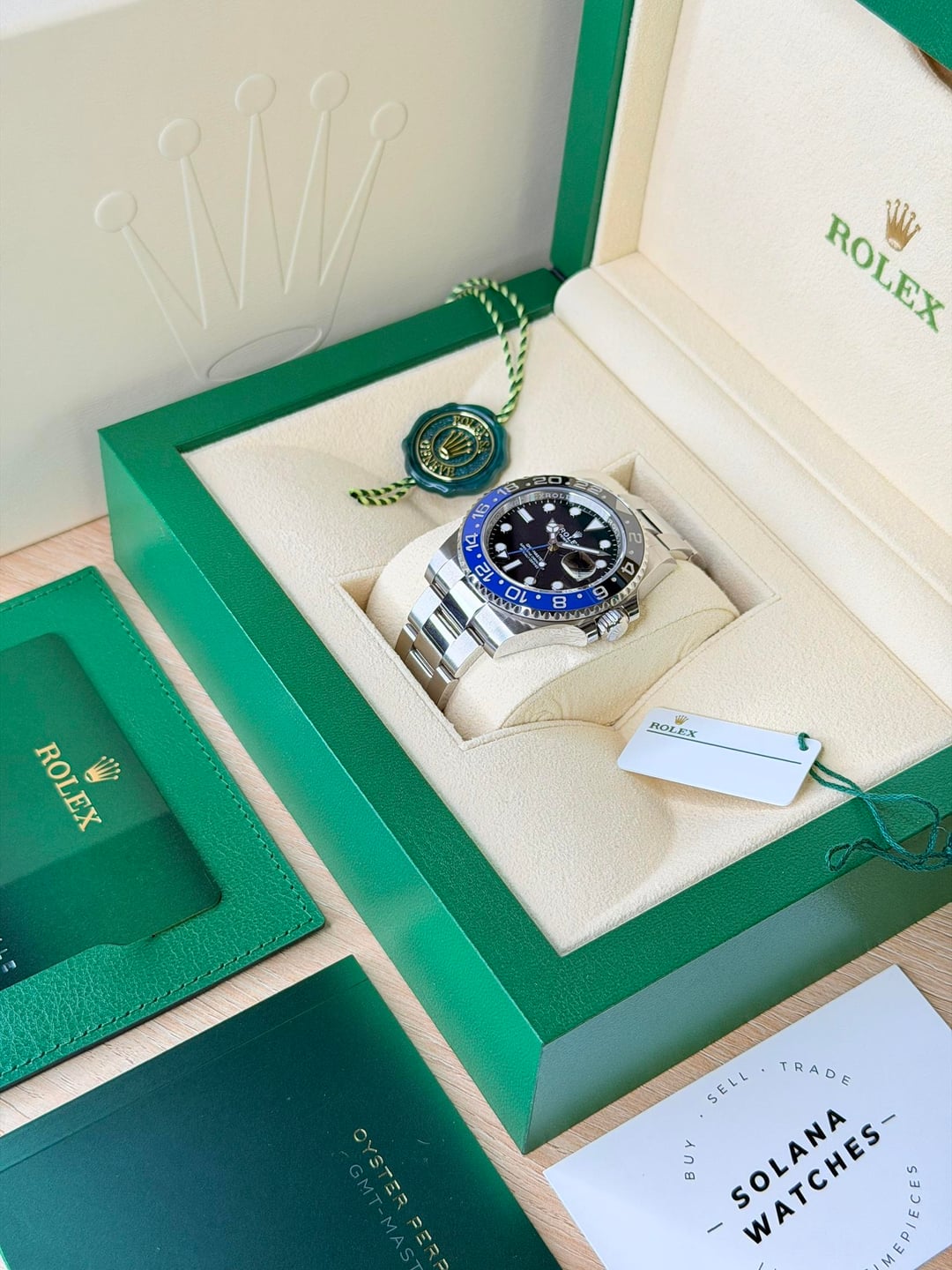 Selling this beautiful 40mm Rolex GMT Master II reference 126710BLNR /126710, aka the Batman. **This Batman is in like-new, unpolished condition**. **It** **comes as a full set**, including the Rolex green box, outer box, manual, warranty booklet, leather wallet, the serialized hangtag, the green hangtag, and warranty card dated late 2023. **Photos:** * [Album](https://imgur.com/a/zVHhKw6) * [Timestamp](https://i.imgur.com/tNyaOuh.jpeg) * [More on my Instagram @SolanaWatches](https://www.instagram.com/solanawatches/) **Price is $16,300 delivered **in the US. **I am a full-time watch dealer, and I have completed many transactions here. **I can provide additional references upon request. **Feel free to contact me** via PM here so we can exchange numbers and get on the phone or do a video call. You can also [find me on Instagram @SolanaWatches](https://www.instagram.com/solanawatches/). _Private showroom located in San Diego, CA. Reach out to schedule an appointment._ _All my watches are guaranteed 100% authentic, and I will stand by their authenticity. _ _California buyers without a seller’s permit are subject to sales tax._