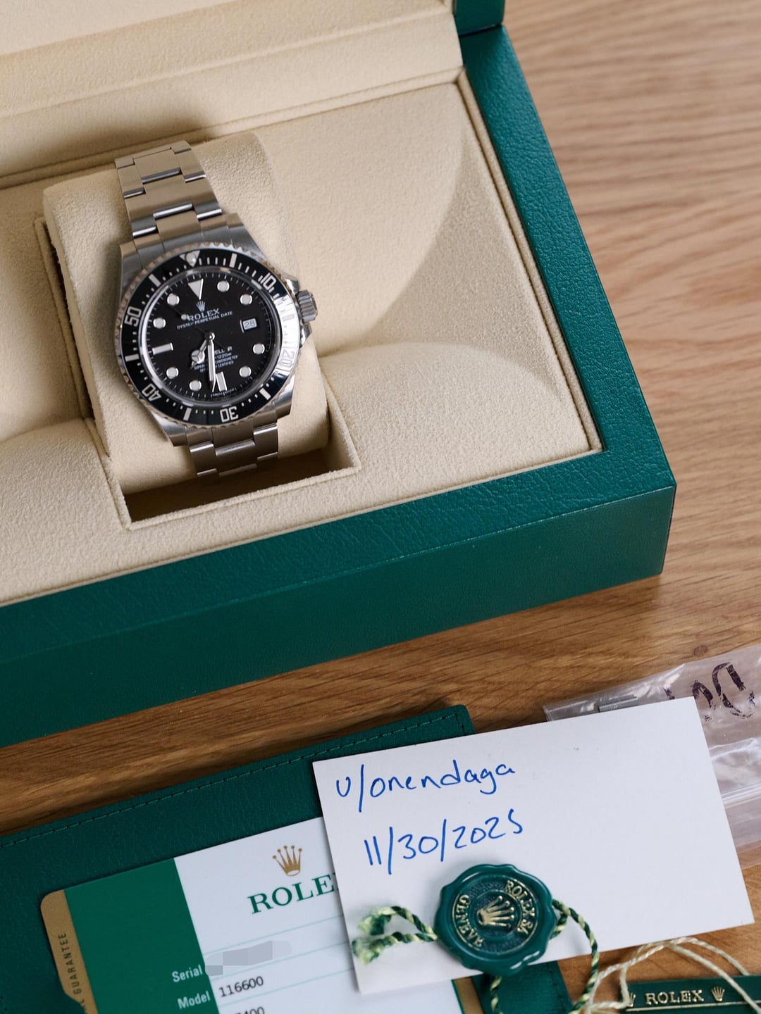 Up for sale is my 116600 Sea-Dweller, also known as the SD4K, also known as the last “real” Sea-Dweller. At 40mm the watch is extremely wearable compared to its 43mm contemporary. It has what I consider the perfect bezel-to-dial ratio. It’s laughable to say that any steel Rolex is “rare” but the 116600 is as close to rare as any, according to the Nicholas Foulkes Submariner book fewer than 30,000 units were ever produced for this watch making it much, much, much more rare than a garden variety Submariner. Purchased NOS from a trusted dealer last year the watch is in worn condition. The watch has never been polished and includes everything: beige outer box, green inner box, card, hangtags, and original links. Please let me know if you have any questions or would like to check out additional pictures. I’m selling to fund another irresponsible purchase, night vision. Asking $12.4k. Payment via wire, shipped via FedEx with signature within CONUS free. Timestamp: [https://imgur.com/a/69upyn7](https://imgur.com/a/69upyn7) Pictures: [https://imgur.com/a/9wAuRHi](https://imgur.com/a/9wAuRHi)