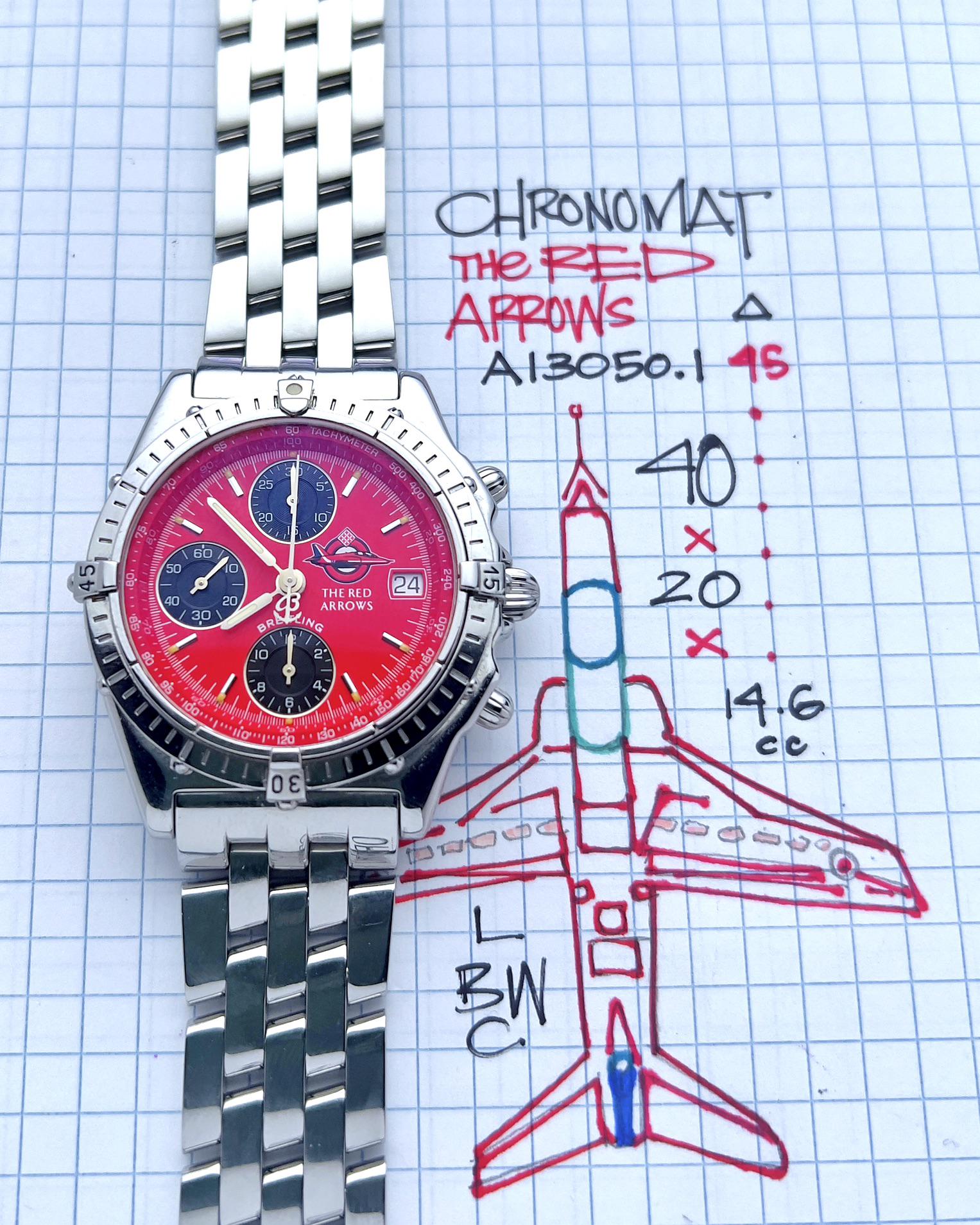 Breitling Chronomat The Red Arrows A13050.1 Limited Edition The Chronomat line is both classic and iconic. Here we have it in a vibrant “The Red Ones” special edition which is a tribute to a 30 year partnership with the Royal Air Force. The Valjoux ETA 7750 automatic movement was serviced and pressure tested in October of 2025 and running like an ace. Bracelet appears fully linked but pm or email if your wrist is 7.75 and bigger to double check Timestamp ix Timegrapher and videos: https://drive.google.com/drive/folders/1KPBmi3HJrfrfHNrIqxIvmtukqgg_d7ST * cool aftermarket pelican style case and independent service papers from October 2025. It was pressure tested but we do not guarantee that it is waterproof * video is the best way to view the watch if in-person test drive is not available. Due to the different characteristic of the cameras and gadgets used, the color of the watch you purchase may not be the same as shown on this website or on our Instagram. * will consider trades that make sense but please consider time, shipping, and trade value—not market. * local special: can possibly accommodate at ButterScotch in Downtown Long Beach by appointment * All sales final unless the watch is misrepresented or lost in transit (always fully insured) * Link to [feedback here](https://www.reddit.com/r/WatchExchangeFeedback/search?q=soycowboy&restrict_sr=1&sort=new) & [watchcharts here](https://watchcharts.com/repcheck/user/soycowboy?source=reddit&type=feedback) * Asking a *negotiable* **$2950** via bank wire, Zelle, venmo, or possibly Appleay with super strong references or if I know you. Price includes fully insured Fedex shipping in the USA— hand delivery in Long Beach with drinks or coffee on me ;). Cheers, Stephen