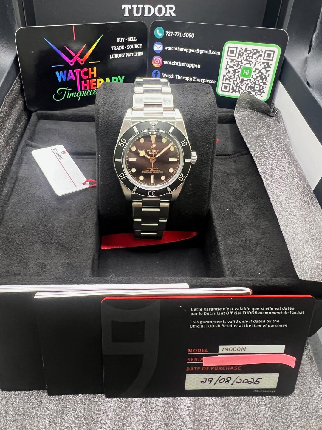 **F/S: New Tudor Black Bay 54 37mm 8/25 Ref. 79000N** **Admin/Mods this is a different watch than the one listed 2 days ago- pulled it for some damage- see dates on warranty cards Old-8/30/25 New 8/29/25 TY!** **Shipping from Florida.** **Specs:** \* Beautiful black domed dial \* Self-winding \* Size 37 SS case w/SS bezel and aluminum bezel \* Three-link SS bracelet \* 200M Water Resistance \* 70-hour power reserve \* MT5400 (COSC) movement **Includes**: Warranty card 8/25, double boxed, tag and booklets. **Condition:** 10/10, unworn stickers **Price: $3,400.00**[ **+**]() **Insured shipping to your local FedEx for pick-up in Con US**. I am also open to a face-to-face public transaction in or around the Tampa Florida Region, within reason. I have many strong and viable references within Reddit and from Buy/Sell/Trade Watch Facebook groups. Always willing to jump on a call or meeting link to show you the watch. Thank you and please reach out if you have any questions or concerns. Florida residents may be subject to sales tax w/o a valid reseller cert. ***No Trades, TY*** **Location**: Tampa Florida **Payment:** Zelle or Wire Timestamp: [https://imgur.com/a/rWTYd5p](https://imgur.com/a/rWTYd5p) FB: Watch Therapy Timepieces IG: [@watchtherapy4u](https://www.reddit.com/u/watchtherapy4u/)
