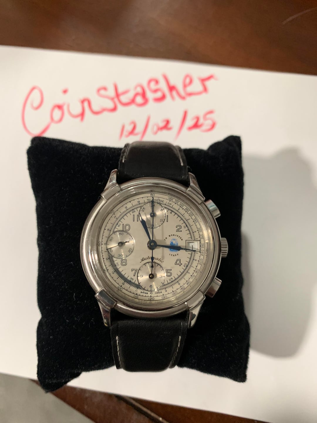Vintage Swiss Valjoux 7750 Chronograph – $600 Selling my vintage Swiss automatic chronograph powered by the legendary Valjoux 7750 movement. Runs great, keeps time well, and the chronograph functions reset perfectly. Features: Swiss Valjoux 7750 automatic movement Triple-register chronograph Day/Date display Silver dial with telemeter & tachymeter scales Stainless steel case & black leather strap (SS bracelet not included) Vintage look with tons of character Condition: Good vintage condition. Dial and hands look great. No mechanical issues. $600