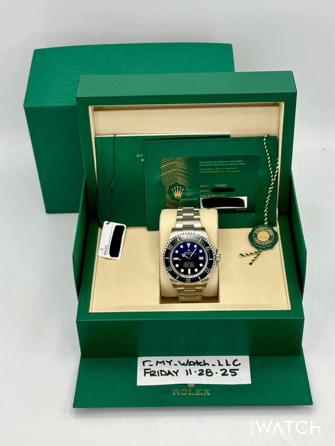 🔵**2025 Rolex Deepsea "James Cameron" 44mm 136660 Oystersteel with a Cerachrom Bezel insert in Black Ceramic Oyster Bracelet Blue Dial** 🔵**TRADE or SELL us your luxury watch, all brands considered. Message me details.** **Includes the following:** **✔️BRAND NEW 2025 UPDATED ROLEX BOX (Double Boxed)** **✔️Box and Papers - Yes** **✔️Warranty card dated July 2025** **✔️5 year manufacturer warranty** **✔️Manual and Warranty booklets** **✔️Green and White Hang Tags included** **✔️Size: 8.25inch wrist (Full Links)** **✔️Watch is in excellent overall condition. Please see photos for details.** **✔️**[**Trades**](https://mywatchllc.com/pages/sell-rolex-watch) **welcome** Business Name: **My Watch LLC** LOCATION: Oak Park, Michigan ✔️[MyWatchLLC.com](http://mywatchllc.com/) for current inventory ✔️Google Business Listing [https://g.co/kgs/Cmd6FPW](https://g.co/kgs/Cmd6FPW) ✔️Business Hours M-F 9-6 ✔️Facetime/Video chat/calls welcome to view the watch interested. ✔️Contact: 248-422-0909 via text or call for quickest response. 🟢TERMS: Visit [MyWatchLLC.Com](http://mywatchllc.com/) for payments accepted 🟢REFERENCES/REVIEWS: We are well reviewed on all platforms from google, trust pilot, rolexforums, additionally we have 300+ reference in multiple FaceBook watch groups, reference checks welcome. 🟢SHIPPING: If you are not local, we offer Fully Insured FedEx overnight shipping in the USA for a fee. International shipping available. [https://mywatchllc.com/products/2025-rolex-deepsea-james-cameron-44mm-136660-blue-dial](https://mywatchllc.com/products/2025-rolex-deepsea-james-cameron-44mm-136660-blue-dial)