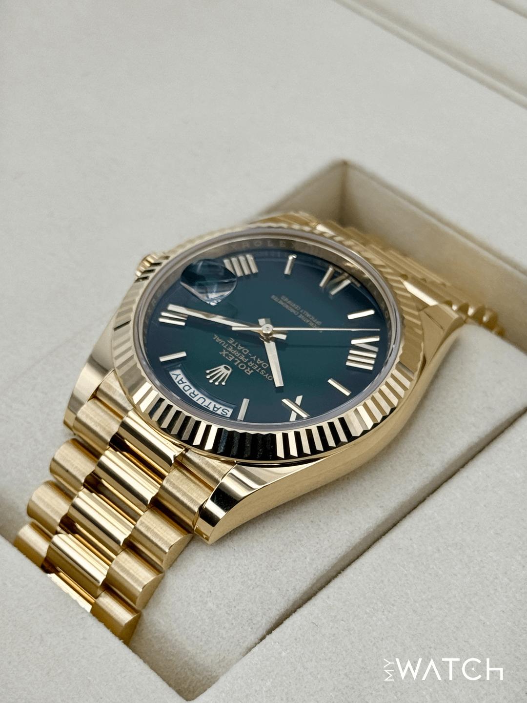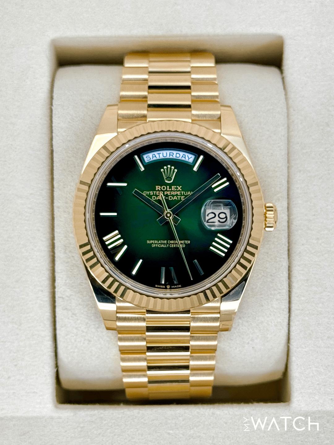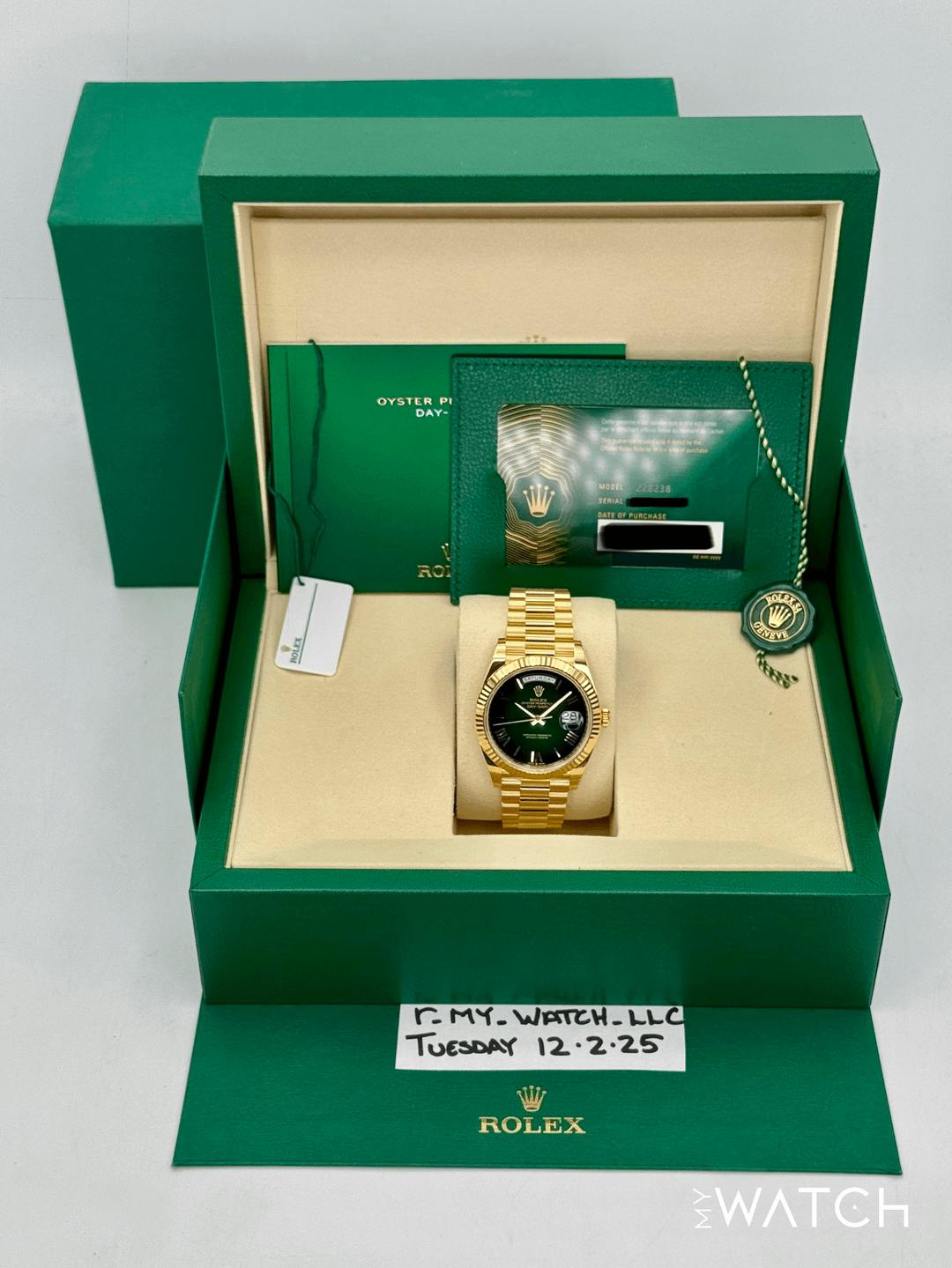 🔵**NEW 2025 Rolex Day-Date 40mm 228238 Presidential 18kt Yellow Gold Green Ombre Dial** 🔵**TRADE or SELL us your luxury watch, all brands considered. Message me details.** **Includes the following:** **✔️BRAND NEW 2025 UPDATED ROLEX BOX (Double Boxed)** **✔️Box and Papers - Yes** **✔️Warranty card dated November 2025** **✔️5 year manufacturer warranty** **✔️Manual and Warranty booklets** **✔️Green and White Hang Tags included** **✔️Material:18kt Yellow Gold** **✔️Size: 7.75inch wrist (Full Links)** **✔️Watch is BRAND NEW/UNWORN** **✔️**[**Trades**](https://mywatchllc.com/pages/sell-rolex-watch) **welcome** Business Name: **My Watch LLC** LOCATION: Oak Park, Michigan ✔️[MyWatchLLC.com](http://mywatchllc.com/) for current inventory ✔️Google Business Listing [https://g.co/kgs/Cmd6FPW](https://g.co/kgs/Cmd6FPW) ✔️Business Hours M-F 9-6 ✔️Facetime/Video chat/calls welcome to view the watch interested. ✔️Contact: 248-422-0909 via text or call for quickest response. 🟢TERMS: Visit [MyWatchLLC.Com](http://mywatchllc.com/) for payments accepted 🟢REFERENCES/REVIEWS: We are well reviewed on all platforms from google, trust pilot, rolexforums, additionally we have 300+ reference in multiple FaceBook watch groups, reference checks welcome. 🟢SHIPPING: If you are not local, we offer Fully Insured FedEx overnight shipping in the USA for a fee. International shipping available. [https://mywatchllc.com/products/new-2025-rolex-day-date-40mm-228238-presidential-green-ombre-dial](https://mywatchllc.com/products/new-2025-rolex-day-date-40mm-228238-presidential-green-ombre-dial)
