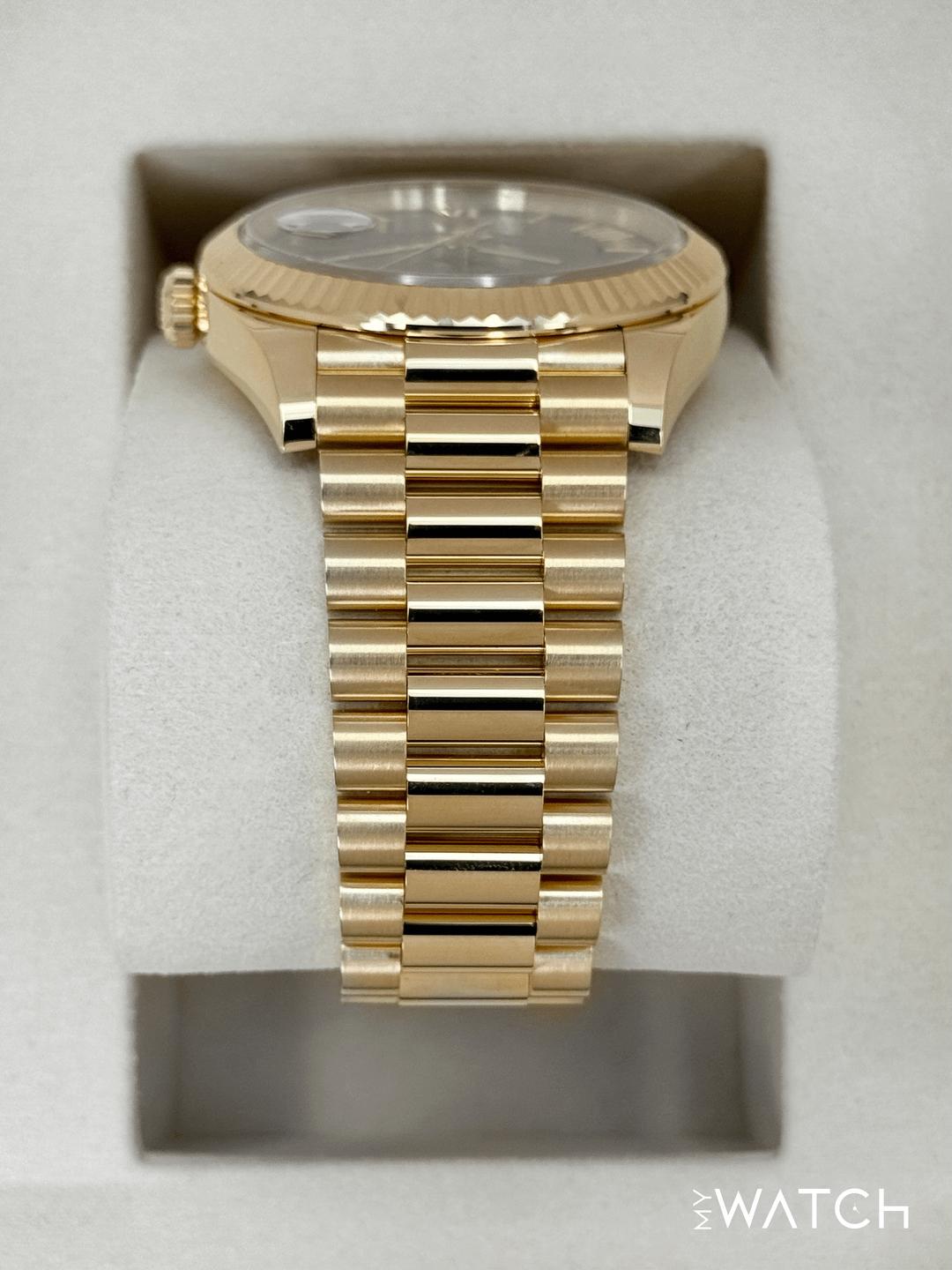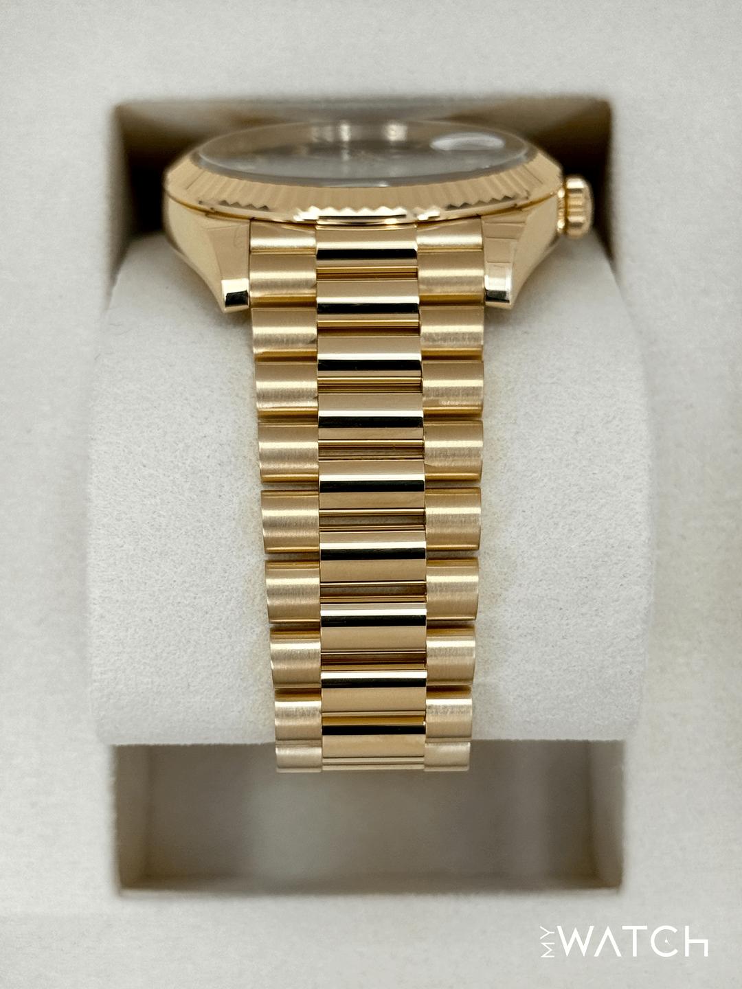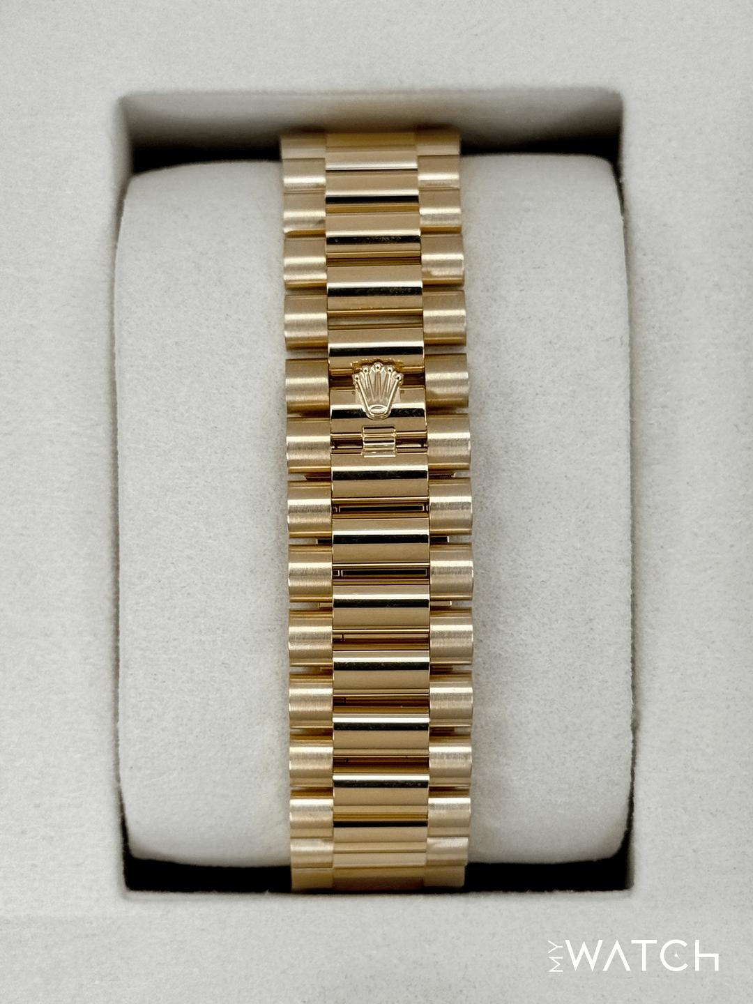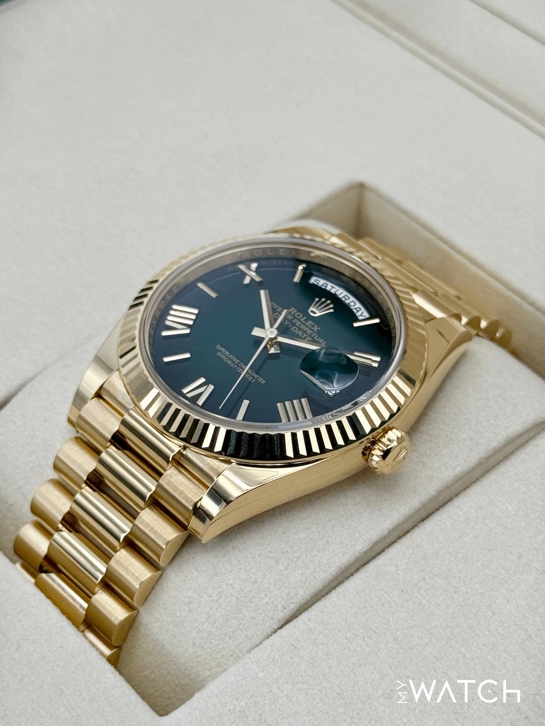 🔵**NEW 2025 Rolex Day-Date 40mm 228238 Presidential 18kt Yellow Gold Green Ombre Dial** 🔵**TRADE or SELL us your luxury watch, all brands considered. Message me details.** **Includes the following:** **✔️BRAND NEW 2025 UPDATED ROLEX BOX (Double Boxed)** **✔️Box and Papers - Yes** **✔️Warranty card dated November 2025** **✔️5 year manufacturer warranty** **✔️Manual and Warranty booklets** **✔️Green and White Hang Tags included** **✔️Material:18kt Yellow Gold** **✔️Size: 7.75inch wrist (Full Links)** **✔️Watch is BRAND NEW/UNWORN** **✔️**[**Trades**](https://mywatchllc.com/pages/sell-rolex-watch) **welcome** Business Name: **My Watch LLC** LOCATION: Oak Park, Michigan ✔️[MyWatchLLC.com](http://mywatchllc.com/) for current inventory ✔️Google Business Listing [https://g.co/kgs/Cmd6FPW](https://g.co/kgs/Cmd6FPW) ✔️Business Hours M-F 9-6 ✔️Facetime/Video chat/calls welcome to view the watch interested. ✔️Contact: 248-422-0909 via text or call for quickest response. 🟢TERMS: Visit [MyWatchLLC.Com](http://mywatchllc.com/) for payments accepted 🟢REFERENCES/REVIEWS: We are well reviewed on all platforms from google, trust pilot, rolexforums, additionally we have 300+ reference in multiple FaceBook watch groups, reference checks welcome. 🟢SHIPPING: If you are not local, we offer Fully Insured FedEx overnight shipping in the USA for a fee. International shipping available. [https://mywatchllc.com/products/new-2025-rolex-day-date-40mm-228238-presidential-green-ombre-dial](https://mywatchllc.com/products/new-2025-rolex-day-date-40mm-228238-presidential-green-ombre-dial)