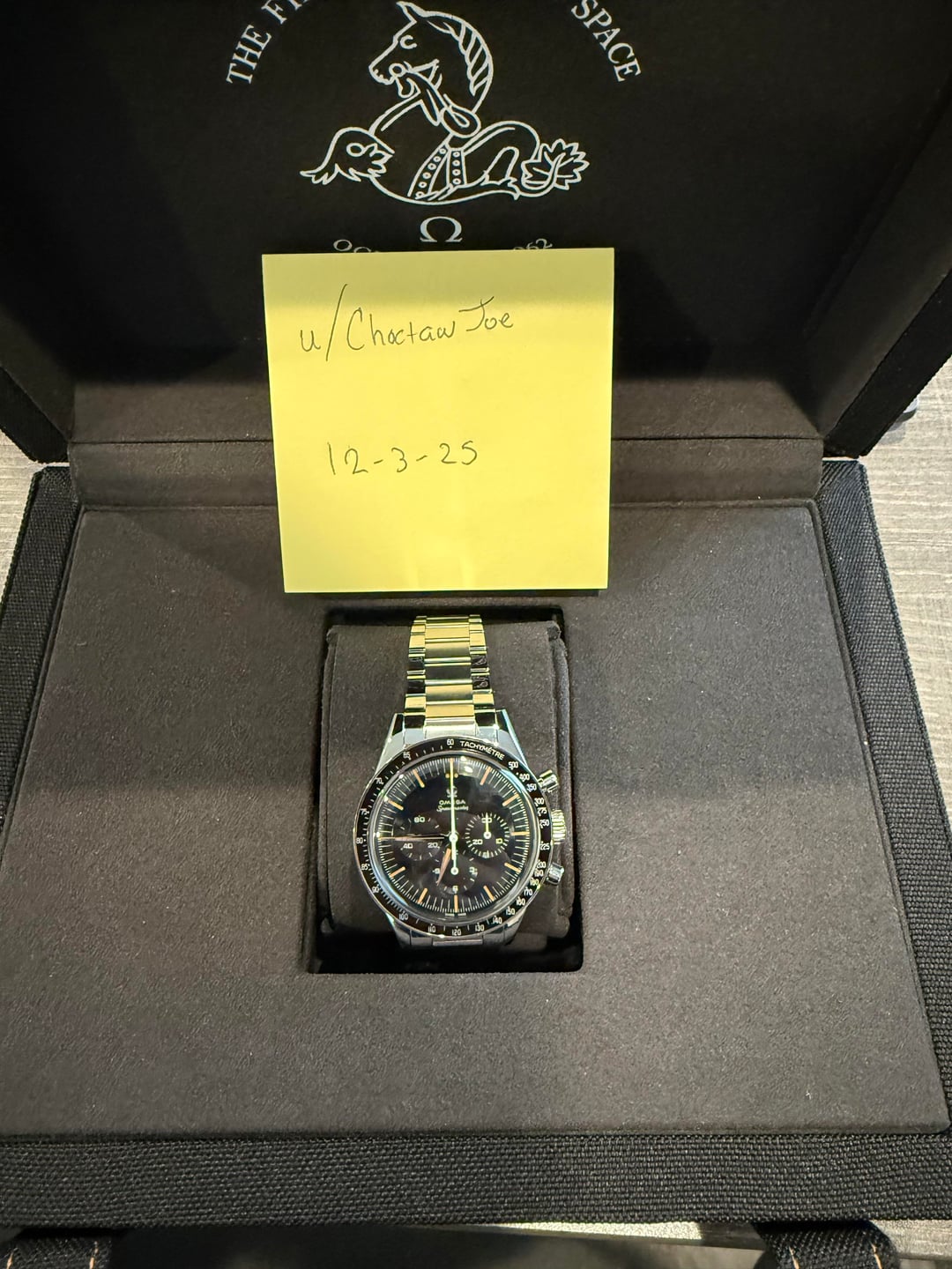 Hello, Reddit! Omega Speedmaster Anniversary Series – FOIS (First Omega In Space) Reference: 310.30.40.50.06.001 Case Diameter: 39.7 mm This is the Anniversary edition of the modern FOIS, a tribute to the first Omega worn beyond Earth’s atmosphere. It’s powered by the Master Chronometer–certified 3861 movement—the same engine inside the current Moonwatch Professional. One of the standout design cues is the contrast between the time-keeping hands and the chronograph hands, each set differentiated by unique shapes and tones. The lume is excellent, making it a legitimately useful piece after dark. Included with the watch: outer box inner presentation box manual all three cards Omega branded warranty card booklet Cleaning cloth and Omega microfiber bag spare links Warranty card dated 2024 Condition is very good overall, showing light signs of wear on the case back, lugs, and bracelet. Asking $6,950. PayPal and wire accepted. Also happy to meet in person and do a cash deal if you prefer that. I'm happy to do a Facetime and show the watch. I'll also make sure you have my name and contact information. My business is listed all over Google so I'm easy to track down. Original retail was $8,900. Feel free to reach out with any questions or for additional photos.
