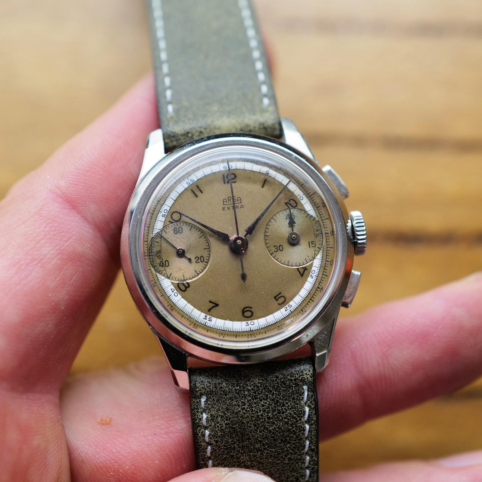 ARSA (Auguste Reymond SA) was founded in 1898 and continues to produce watches today under the name Auguste Reymond. Brand: Arsa Model: Chronograph Case: Stainless steel Size: 34mm Lug to lug: 38mm Strap: Leather Box/papers: No Location: Los Angeles Price: $999 or best offer PICTURES/TIMESTAMP: [https://imgur.com/a/LPAPcWA](https://imgur.com/a/LPAPcWA) CONDITION & SERVICING \-The beautiful golden colored dial is in very good condition. \-The purple hands are showing patina. \-The case is in very good condition. \-Service history is unknown.