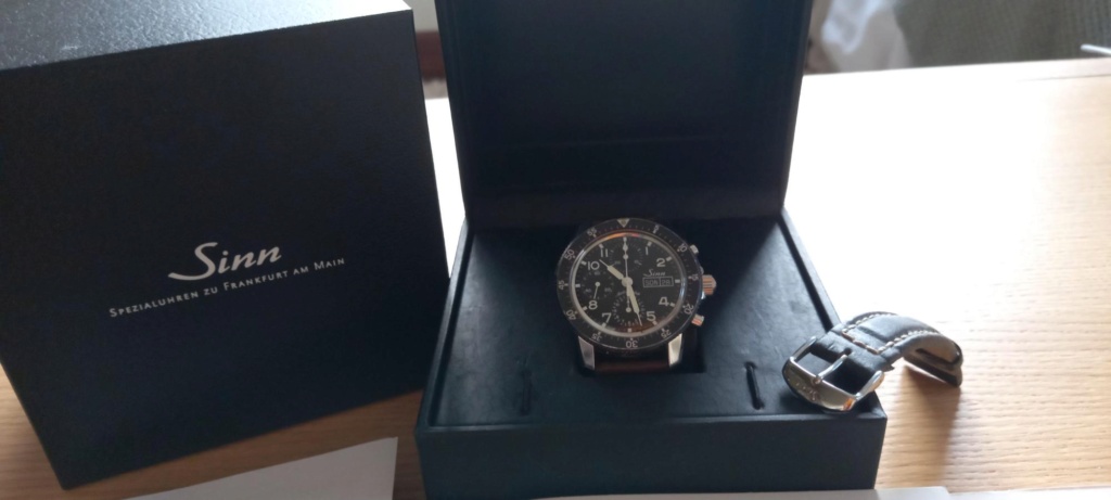 Elle vient avec sa boîte, sa sur-boîte, son mode d'emploi en allemand et sa carte de garantie de l'époque. Le bracelet d'origine en cuir noir avec coutures blanches qui est dégradé viendra avec la montre avec sa boucle Sinn en excellent état. La montre est montée sur un bracelet cuir rallye commandé chez Esprit-Nato.com en 2022; j'y commanderai un bracelet du même type neuf d'une valeur de 55€TTC, couleur au choix, pour la vente.