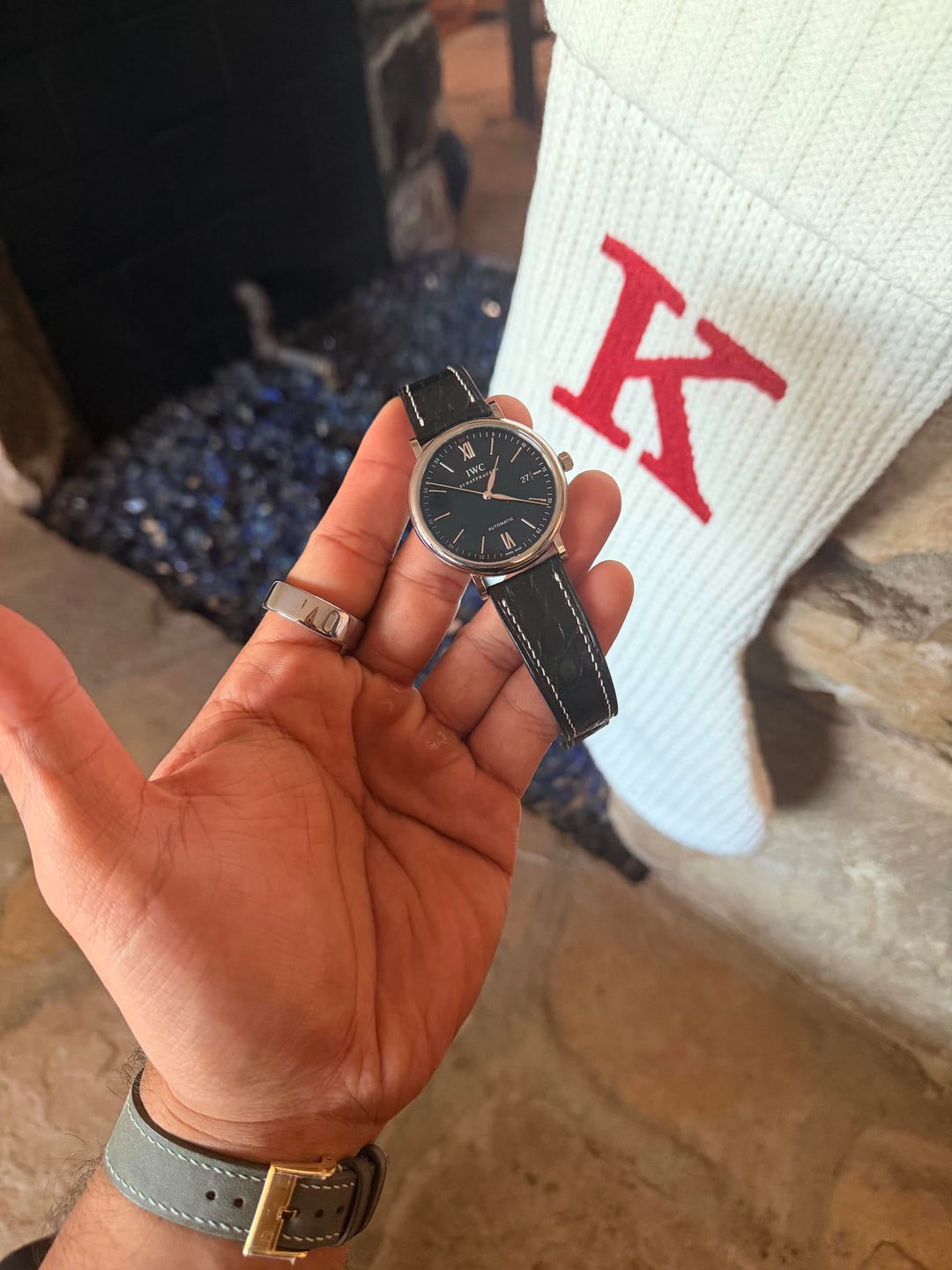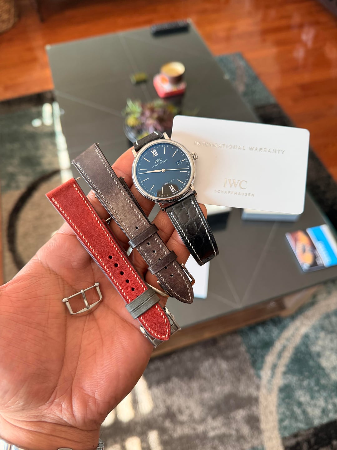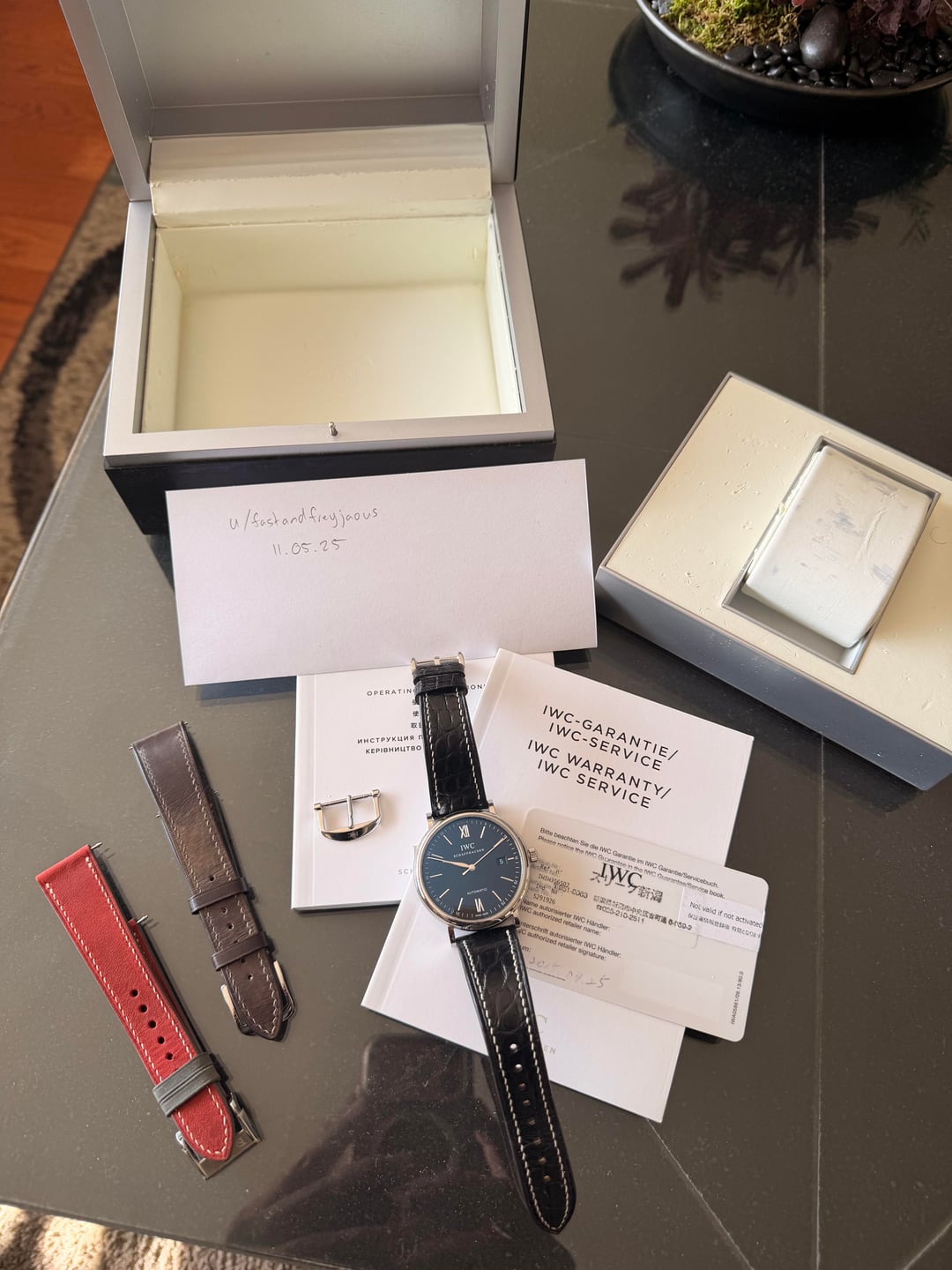 Happy Holidays all! For sale is a showstopper piece from none other than IWC. This is the Portofino Automatic Black Dial Reference IW356502. Of the Portofino collection, this is my personal favorite thanks to the inky black dial, the red "60" accent above the 12 o'clock index, and the iconic silver dauphine hand stack that makes the Portofino line immediately recognizable. This sale is for watch and full kit. Comes with box, papers, warranty card, and instruction booklet. The warranty card is dated 2015 but the watch was serviced within the last 3 years and is keeping +/- 6 spd face up. The OEM strap was pretty much at the end of its useful life, but the OEM clasp is included along with three (3) very high quality straps from Delugs, Has No Bounds, and the Strap Tailor. The straps altogether cost over $400 alone. **Link to Watch:** [https://www.iwc.com/us-en/watches/portofino/iw356502-portofino-automatic](https://www.iwc.com/us-en/watches/portofino/iw356502-portofino-automatic) **Price:** I am pricing this modern IWC well below comparables especially given its excellent 9/10 condition. For the full set with all photographed straps, I'm asking **$2,450 -> $2,399 or best reasonable offer.** I personally would like to hold on to the Strap Tailor black alligator strap so knock $100 off if you can do without that one (though it's the best pairing in my opinion). I may be open to trades though TV will be slightly higher. Please send full details of your trade along with photos! Please let me know if you have any questions and have a good day!