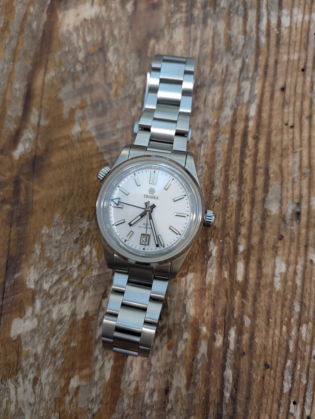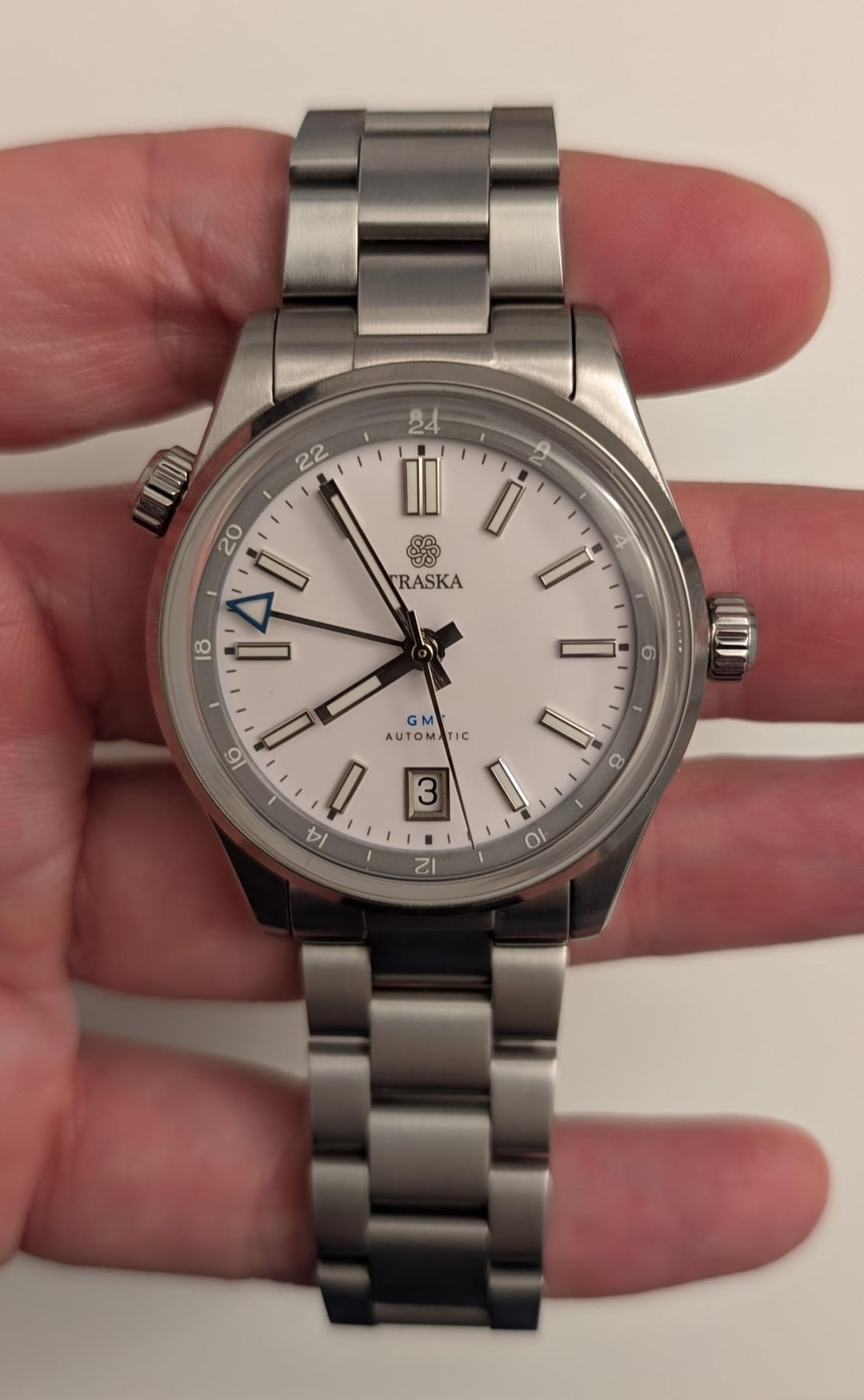 **For sale only. No Trades** Traska Venturer GMT in Arctic White color * 38.5mm diameter x 45.9mm lug to lug x 10mm thickness * Miyota 9075 Automatic True GMT with 42hr power reserve * 15 bar (150m) water resistance, screw down crown * 20mm lug width (bracelet tapers to 16mm) * Sapphire box crystal * Includes all boxes and papers as shown * Like new condition, one small scratch on bracelet (enlarged picture shown) * Shown on 6.25" wrist Video = [https://imgur.com/a/OWyRVzB](https://imgur.com/a/OWyRVzB) Willing to jump on video call if needed. Timestamp = [https://imgur.com/a/DC71QvY](https://imgur.com/a/DC71QvY) **PRICE - $625 shipped** (firm)**,** CONUS only