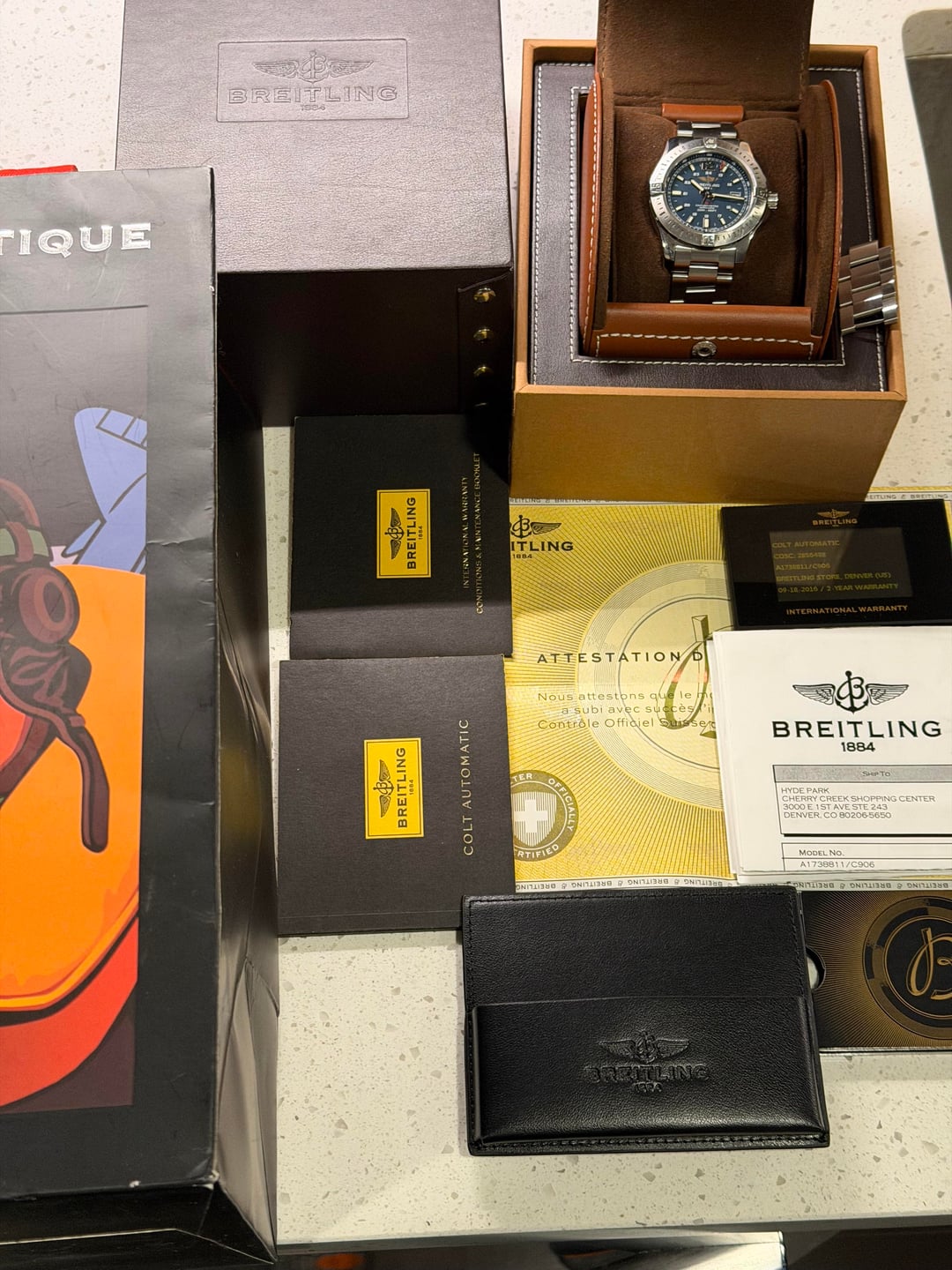Breitling Colt Blue 44 Completely full set (2016) with service paperwork from Breitling. **$1999** / Zelle, Venmo, or WU accepted. Timestamp: https://imgur.com/a/r5NdxRI I have **tons** of references on multiple platforms including WatchExchange. We also are a 5-STAR rated business on Google!