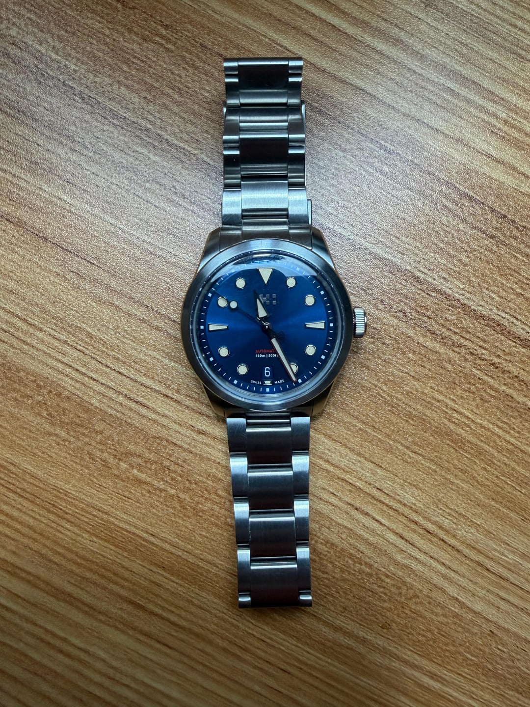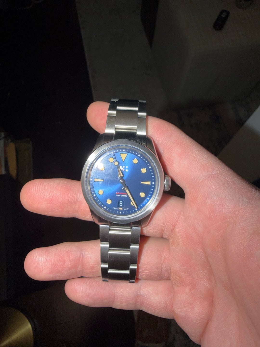 Hi everyone, looking to sell by Christopher Ward C65 Dune. Great watch and my first CW. Beautiful sunburst blue dial as well. Watch is in perfect working condition. Looking to sell as I have a rather big wrist and this comes in a bit small for me (38mm). Comes with full box and papers and a suede leather strap. The strap has a stain (pictured) and the watch itself/bracelet has a few scuffs on the steel but nothing major. Open to offers but only looking to sell at this time. Will ship free in CONUS. PayPal F&F or G&S (Buyer pays surcharge).