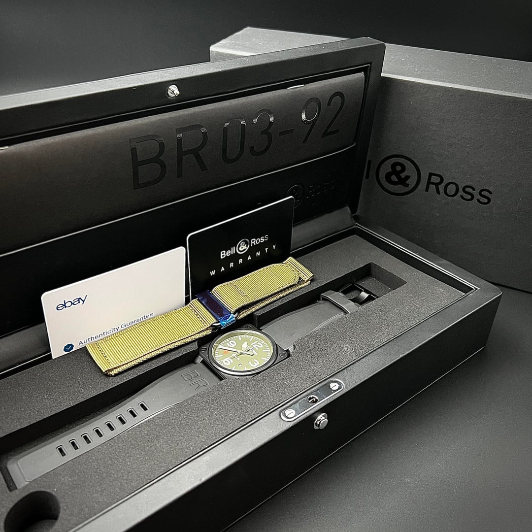 B&R BR 03‑92 Military Type BR0392-MIL-CE Set includes: outer and inner box, extra military green strap, Blank warranty card and f33bay authentication card. User manual. All tools and 2 pins for strap change. Condition: Watch is clean and runs strong. Black strap buckle has micro wear on it. Price: 2450+lbl The BR03-92 Military is a perfect first luxury watch. The matte black ceramic case feels premium and tough, and the green dial gives it a clean military look that stands out without trying too hard. It’s lightweight, reliable, and has that confident, purpose built feel that makes luxury actually worth it. Preferred Payment: Zelle, wire, PPg+s Facetime or ID exchange required Ships from Las Vegas: Will be shipped fully insured via Fed Ex and delivered to your nearest Fed Ex location. U.S. only.