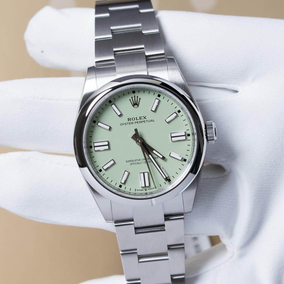 ![Thumbnail [WTS] Rolex Oyster Perpetual 41mm Ref. 134300 Pistachio Green Dial, BNIB w/FULL STICKERS! Complete Set 6](https://cdn-cf.watchpatrol.net/120x120/img/full/1e7fe77c428be56a4eabedcfdfa7d28b70406418.jpg)