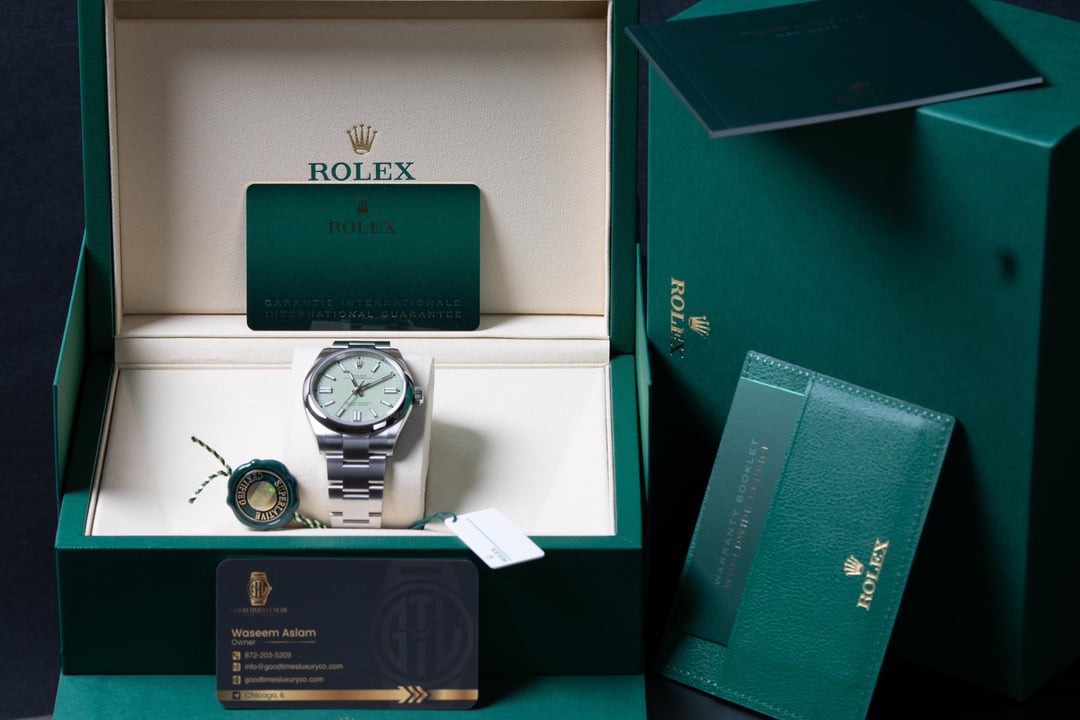 - Timestamp: https://imgur.com/a/scbmLg3 ******************************************************* * Reference: 134300 * Condition: Brand New with Full Factory Stickers! * Box and Papers? Yes, Complete Set * Warranty Card Date: OCT 2025 **Key Features:** - Model Reference: 134300 - Collection: Rolex Oyster Perpetual - Dial Color: Pistachio Green (Matte finish) - Case Size: 41mm Oystersteel case - Material: 904L corrosion-resistant stainless steel (Oystersteel) - Bezel: Smooth, polished steel bezel - Crystal: Scratch-resistant sapphire crystal - Movement: Perpetual, mechanical, self-winding Calibre 3230 - Power Reserve: Approximately 70 hours - Water Resistance: 100 meters (330 feet) - Bracelet: Three-piece link Oyster bracelet with Oysterclasp - Functions: Center hour, minute, and seconds hands; stop-seconds for precise time setting - Certification: Superlative Chronometer (COSC + Rolex certification after casing) - Key Feature: Clean, classic design highlighting modern elegance ******************************************************* 💳 Payment options: * All Credit Cards accepted. +4% Processing fees or 3% for first time clients at asking price * Bank Wire * Crypto For your convenience, you may divide payments into various forms of payment. ******************************************************* 💰Price $11,495 includes fully insured UPS or FedEx Shipping ******************************************************* 📍 Location: Chicago, IL 🚀 Shipping: Every package is insured for its full value and shipped via FedEx Overnight service to your nearest FedEx Office ********************************************************** 📩 Contact: * 📞 872-203-5209 Call/Text/Whatsapp ******************************************************* 📸 Insta: @goodtimesluxury ⭐️ Check Reviews on Google and Trust Pilot 🌐 Google us: Good Times Luxury Chicago 👨🏻💻 Website: goodtimesluxuryco dot com About me 🙋🏻♂️: My name is Waseem Aslam, Owner of Good Times Luxury. Please don’t hesitate to contact me with any questions. I’m happy to jump on a facetime call to show the watch and answer any questions you may have until you’re confident in your purchase. Talk soon, thanks! *******************************************************