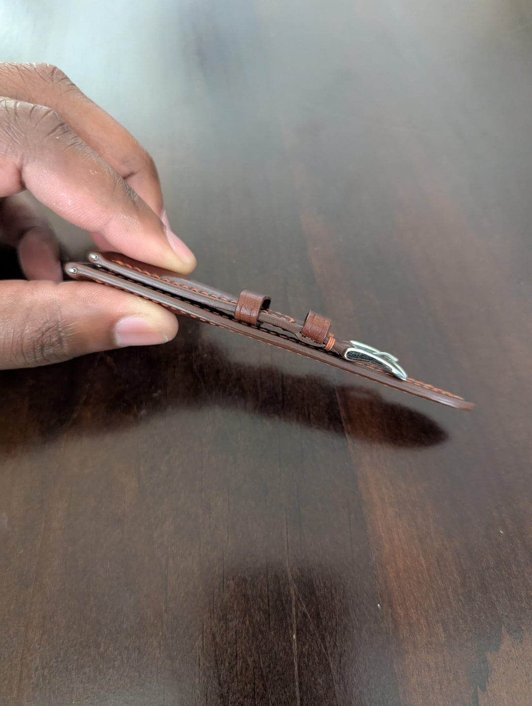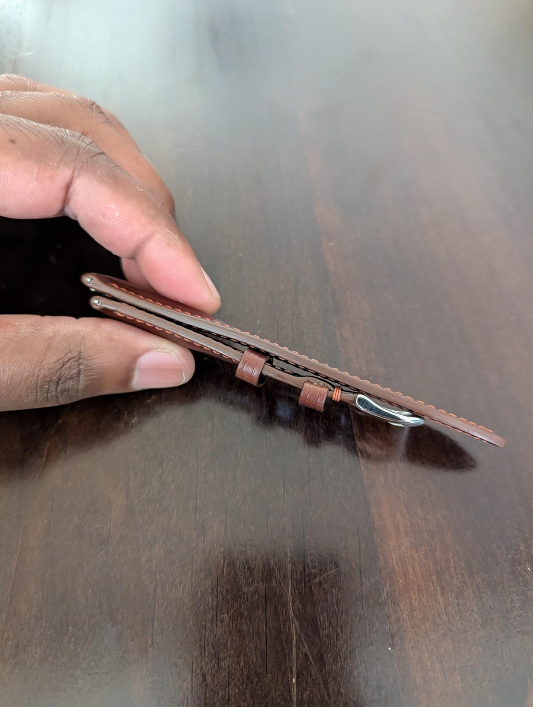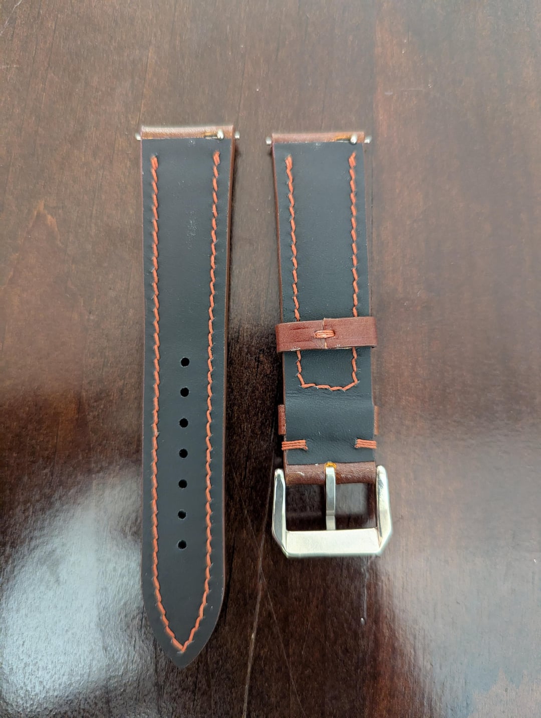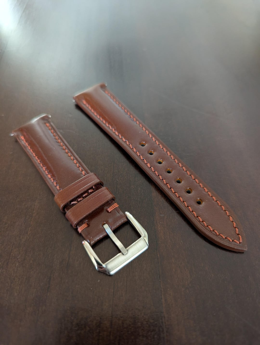 Selling a handmade watch strap in cognac Shinki Shell Cordovan. The strap is new and unworn, but there was a slight cosmetic error with the stitching near the buckle (I didn't notice it until it was too late to return). Width is 20mm and tapers to 18mm. Length is 75mm/115mm. Comes with quick release spring bars. I had this made by an Etsy seller in Vietnam, but wanted a darker shade of brown (like Horween Dark Cognac), so I'm listing it here. Paid $75, asking $55 shipped PayPal G&S (CONUS buyers only please). Feel free to contact me with any questions. Thanks Video Timestamp: [https://imgur.com/a/RMue3of](https://imgur.com/a/RMue3of)