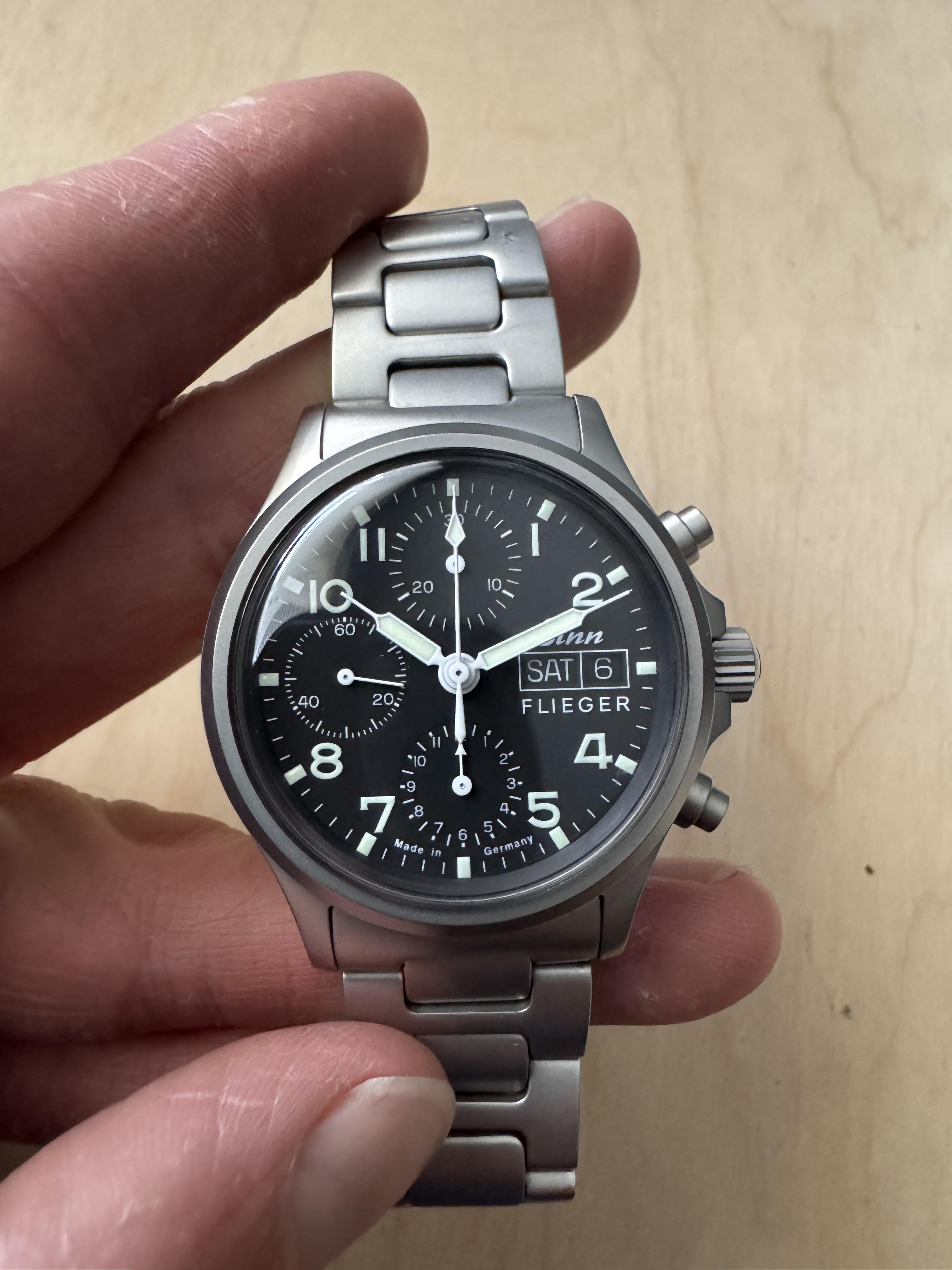 Posting my Sinn 356 Flieger for sale. Full kit including the new quick adjust bracelet clasp. Watch is is mint condition save for some surface level marks on the clasp and bracelet. Zero marks on back of lugs. I don't see a single mark on the watch head itself. This is the acrylic crystal version with solid caseback. Warranty card dated June 2025. Watch runs great, chrono functions reset perfectly. Watch is running a little fast at +13/day wearing all day and resting face up at night. I haven't taken it to a watchmaker to check for magnetism or to have adjusted as it hasn't bothered me. YMMV. The 356 is one of my favorites, just enjoying the hobby and trying new watches, and one in one out policy... Asking $2300 plus shipping (currently sold out on Watchbuys with retail of $3140). [pics and timestamp](https://imgur.com/a/z1sqVex)