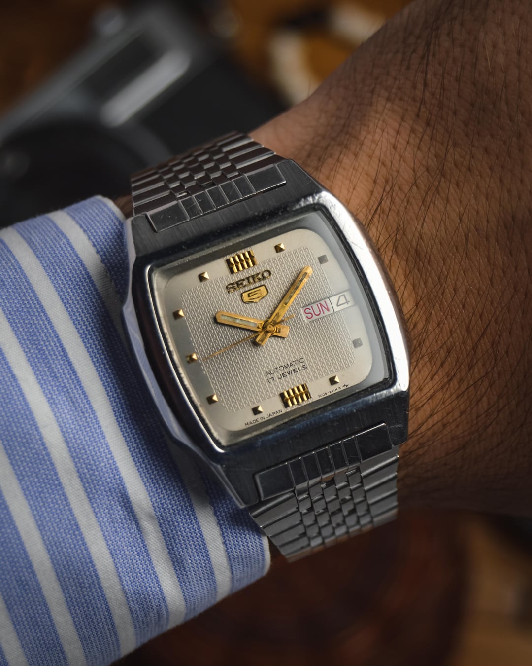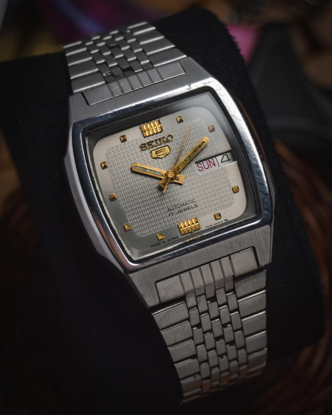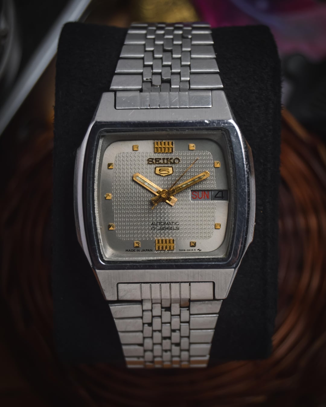 [Timestamp](https://postimg.cc/QVccktVK) Hey Watchexchange! This is the **Silver Guilloche TV**—a nickname we gave this automatic Seiko 5 to celebrate its striking **guilloche textured silver dial** set within the bold, geometric **"TV" cushion case**. Dating from **1981**, this watch is a fantastic example of late-70s/early-80s style, offering a great vintage look and reliable automatic performance. The dial is the star: a crisp **silver color** with a unique and refined **guilloche textured finish** (an intricate, repeated geometric pattern) that gives the watch quiet sophistication and depth. It features **gold-toned applied pyramid indices** and **baton hands**, which provide excellent contrast. The case features the iconic **TV shape** that was highly popular in this era, giving it a substantial wrist presence despite its modest size. The case is finished in stainless steel. Inside beats a dependable **17-jewel automatic Caliber 7009** movement, known as a true Seiko workhorse. It is currently paired with an original stainless steel bracelet and a brand new leather strap. **🔹 Key Dimensions** * **Case Diameter:** 36mm (without crown) * **Lug-to-Lug:** 40mm * **Thickness:** 10mm * **Lug Width:** 18mm 💵 **Price: $135 shipped!** 📦 **Payment: PayPal F&F** or G&S (**+4.5% fee by buyer**) or **bank wire (US banks accepted)** 📩 DM me for more pics or a custom timestamp. If you’re after a unique, geometric vintage Seiko 5 with a beautiful guilloche textured dial, this watch delivers classic style at an excellent price. Follow my [**Instagram**](https://www.instagram.com/everistwatches/) and **Reddit profile** for more **vintage drops**.