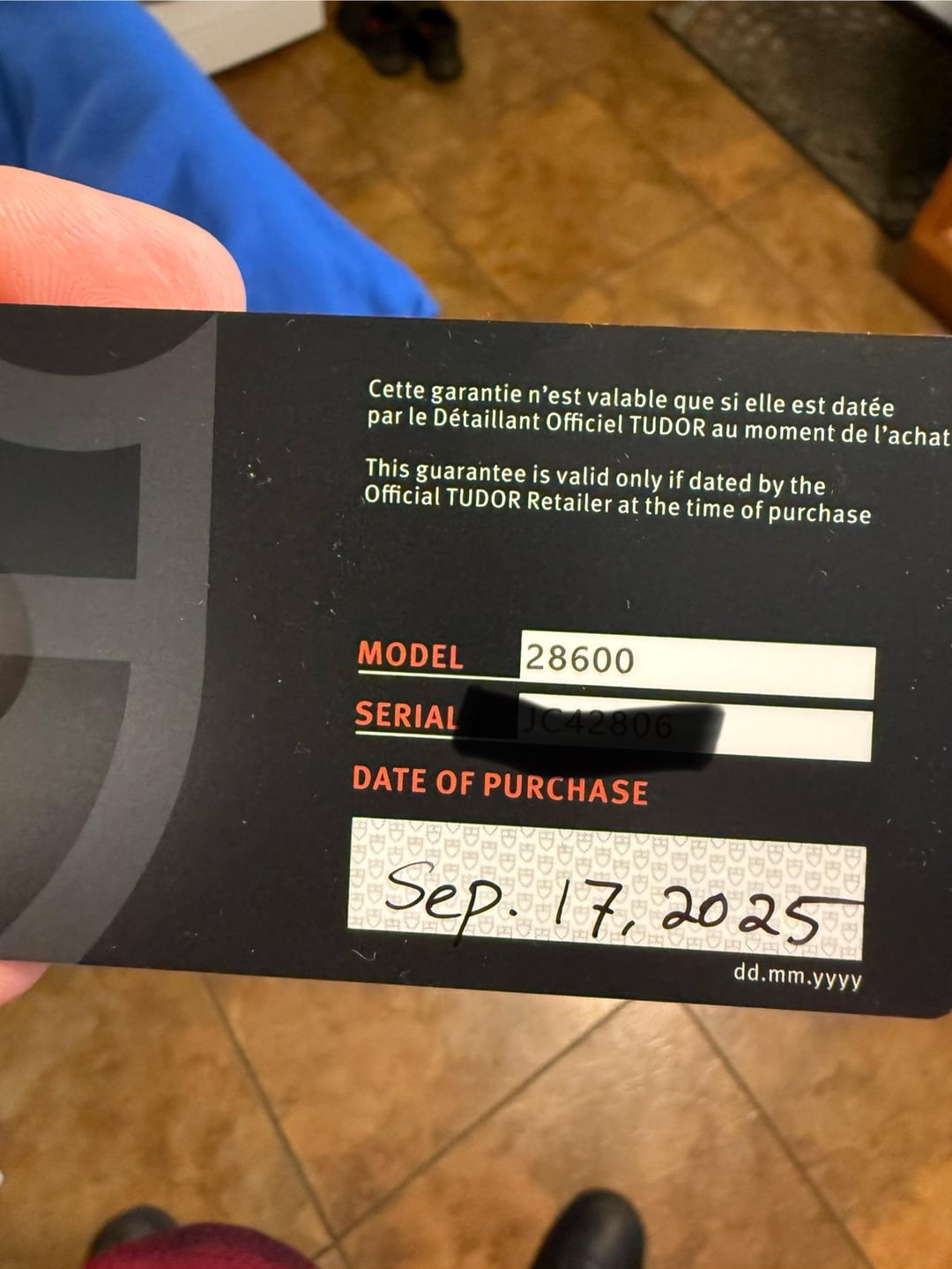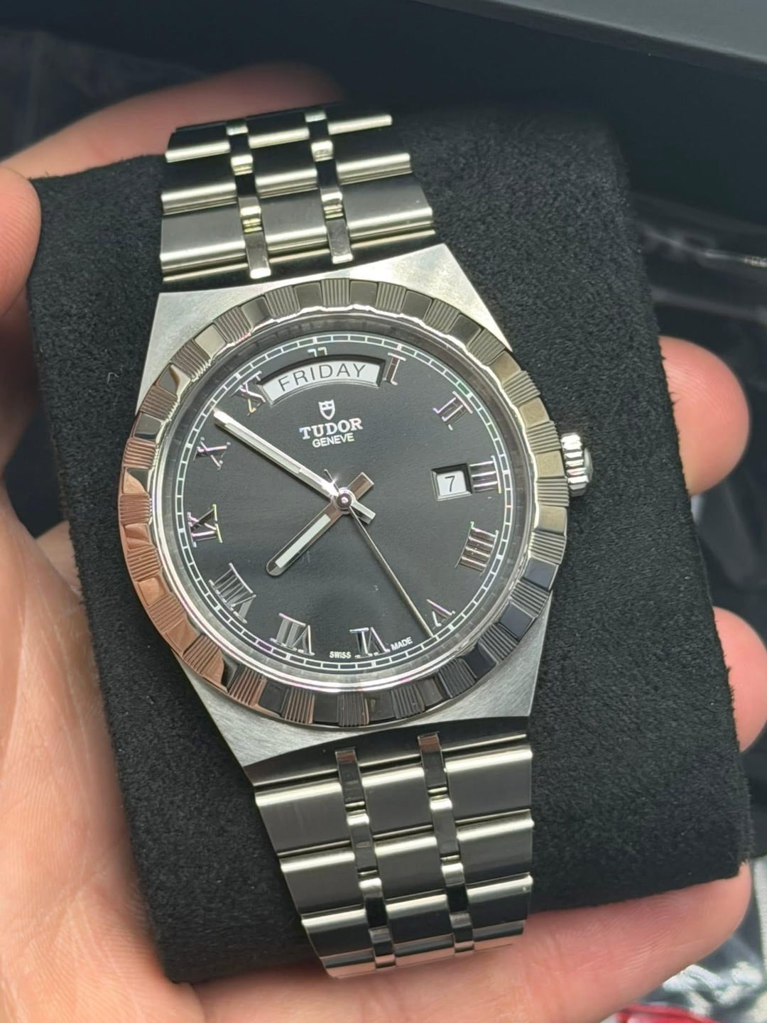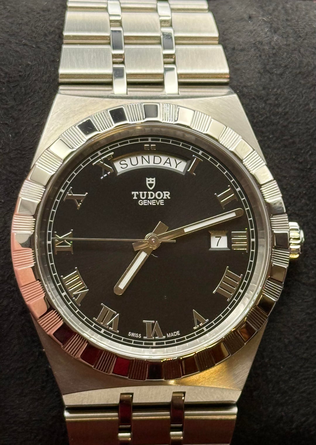 For sale: 2025 Tudor Royal Day Date 41 millimeter Reference 28600 0003 Roman black dial Full AD set dated September 2025 Timestamp: https://imgur.com/a/NmqHSQ0 Video: https://imgur.com/a/YtBkt8v What’s included: Card White serial tag Booklets Inner and outer boxes All links Watch Complete AD set Condition: Pristine condition and presents like new. No issues to note. Price: Asking $2600 plus shipping Buyer provides the overnight shipping label anywhere in the continental United States. Payment: Zelle or bank wire only. Details: This is the 41 millimeter Tudor Royal Day Date with the Roman black dial. Integrated bracelet design, day window at twelve, date at three, and a clean, sharp presence on the wrist. A strong value piece with solid build quality and a modern look. I am available to FaceTime and answer any questions. Happy to provide additional photos or video clips so the buyer can review every angle of the watch. Feel free to reach out with any questions.