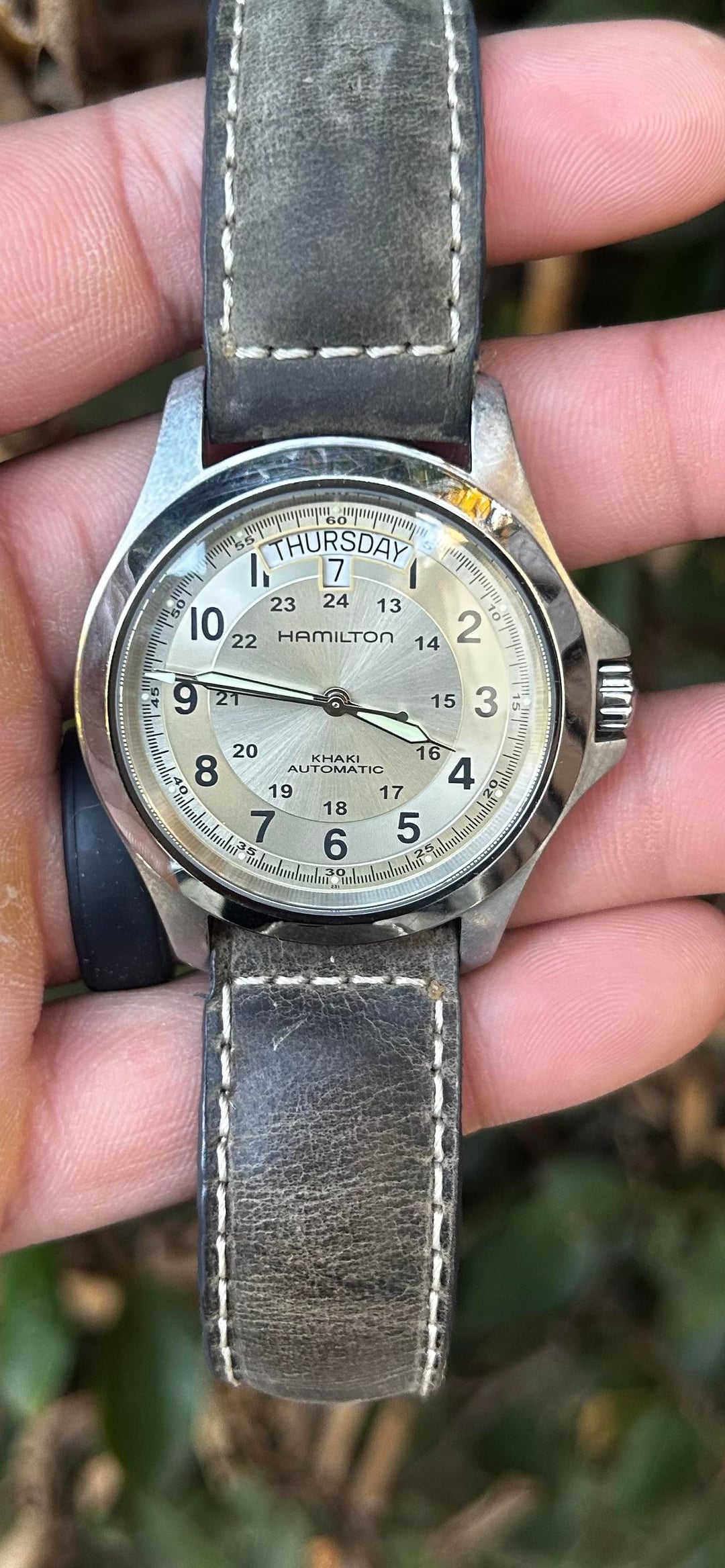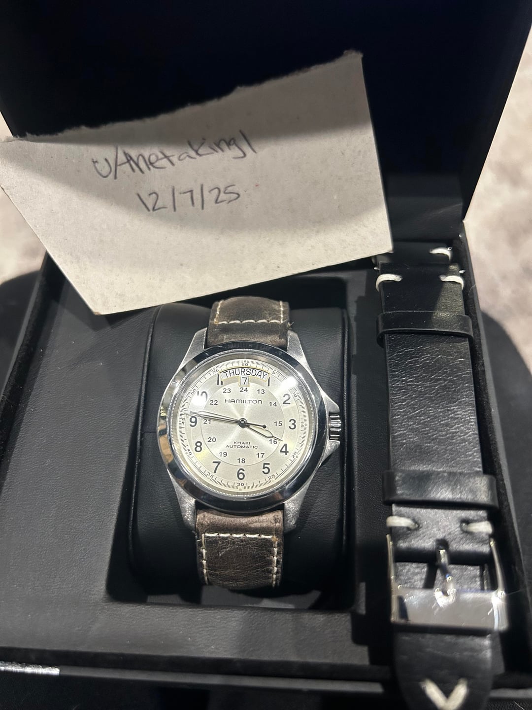 Up for grabs is a Hamilton Khaki King 40mm with that buttery-smooth beige dial that basically screams “I’m rugged…but I also drink good coffee.” Watch and box only, currently rocking an aftermarket strap, and I’ll throw in an extra black leather AM strap so you can swap vibes faster than a Reddit mod switching accounts. Running great, looks great, priced great. $395 + label costs.