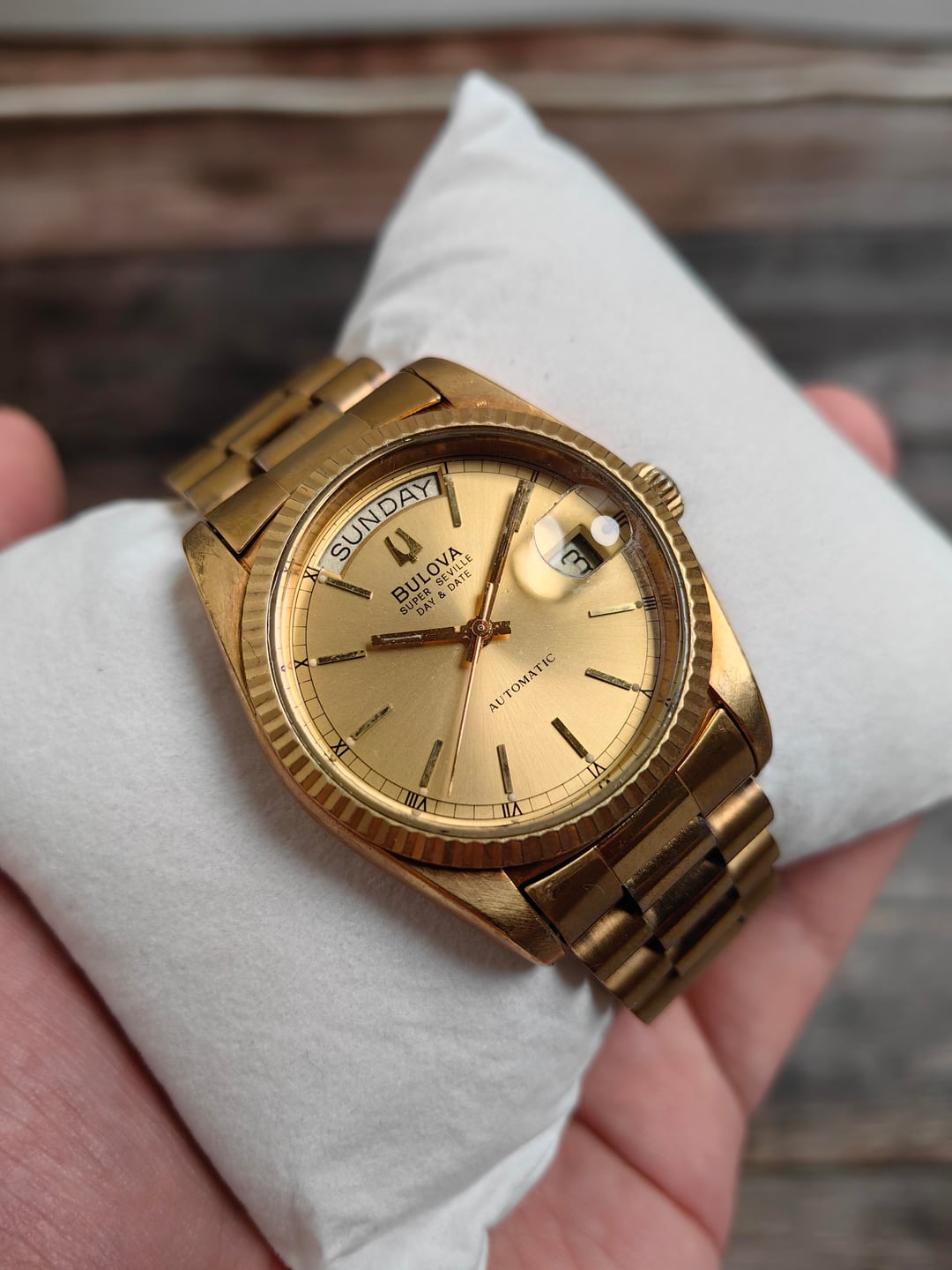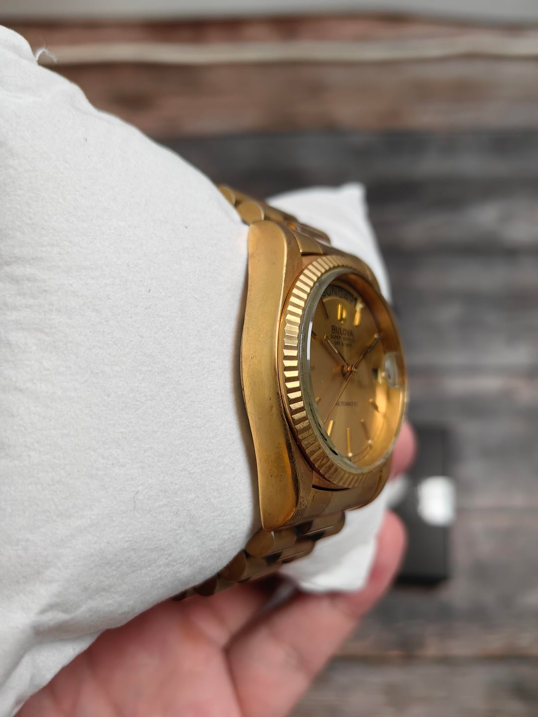 📍 MODEL: Bulova Super Seville Gold 📍 PRICE: $330 + Shipping OBO 📍 OVERVIEW Up for sale is a great condition Bulova Super Seville Gold. This watch measures at 36mm and has an automatic movement. 📍 EXTERIOR Would rate a conservative 8.8/10 and in good condition for it’s age. Case has peeling on the gold coating particularly behind the case, peeling also present on the gold plated bracelet. Minimal Patina present on the dial hands and indices. The watch has a gold-plated steel case and is strapped on original Bulova gold plated bracelet. Mineral glass crystal and all other parts are clean. Hairlines present on the caseback. 📍 FUNCTIONALITY All functions working well (Crown, Day-date working well, and timekeeping within standards). 📍 INCLUSIONS: Watch and replacement box only. 📍 SHIPPING: Will use Fedex Priority Shipping, watch will be shipped from the Philippines. Normal shipping time is 3-5 days globally. FOR USA BUYERS: Shipping time MAY take longer due to the recent closure of the De Minimis Exception and local package backlogs. I will gladly work with the buyer on any duties/tariffs involved and I will process all customs documentation. Have extensive experience going through US CBP. Buyers normally shoulder tariffs but we can work on a scheme where I shoulder the tariffs for faster customs processing. 📍 PAYMENT: Paypal ff or g&s (Buyer shoulders international transfer fee of 4.5%) 📍 ADDITIONAL PICS: Timestamp:https://imgur.com/RXzAMFT || SOLD "as is" with no personal warranty from me and I will not accept returns/refunds unless for an undeclared issue on my end. I will answer all your questions and can send videos of everything prior to ship out for your peace of mind. I am also giving a one week window upon receipt of the watch for the buyer to raise any concerns. I believe this is ample time to check any undeclared issues. For security purposes, I will no longer entertain complaints/concerns raised beyond the 1 week period.||