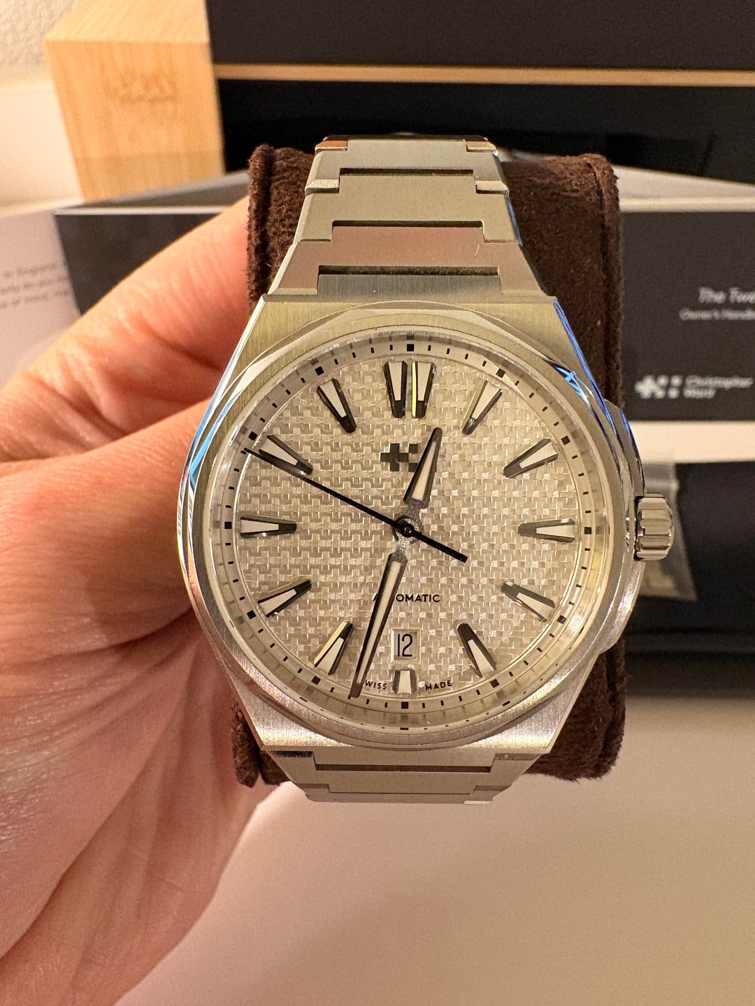 **\[WTS\] Christopher Ward, The Twelve, Arctic White, 40mm — $990 obo** **Item:** Christopher Ward The Twelve C12-40ADA1-S00W0-B0 (40 mm stainless-steel integrated bracelet automatic) **Condition:** Very good to excellent. Very light scuffs that are hard to photograph consistent with careful wear. No dings. **Includes:** box, warranty card - movement under warranty until 05/2028, and all links. The Twelve C12 stands out as a refined, modern “integrated-bracelet” automatic sports watch that blends everyday wearability with upscale finishing — polished and brushed steel, subtle luxe details, and a trusted Swiss movement under the hood. Its compact 40 mm case and clean dial make it versatile: dress-up or casual wear — ideal for someone wanting a “do-everything” watch with real style and quality. # Details & Features * **Movement:** Sellita SW200-1 — automatic, 26-jewel Swiss mechanical movement with \~ 38-hour power reserve. * **Case & Size:** Stainless steel case, 40 mm diameter, \~ 9.95–10.0 mm thickness — balanced and wearable for many wrist sizes with screwed-in links! * **Dial & Hands:** Clean dial in Arctic White with applied polished indexes and luminous hands/indices (Super-LumiNova® X1 BL C1), giving excellent legibility and classy finish. * **Crystal & Caseback:** Anti-reflective sapphire crystal up front; screw-down exhibition caseback to view the movement. If you look closely, you will see that there was engraving done by C. Ward. You will see “Hillcrest,” and “May 21, 2023.” I had this engraved for a special occasion, but I’ve moved on, and so has my attachment to this watch. * **Bracelet:** Marine-grade stainless-steel integrated bracelet with butterfly clasp / deployant, screw links, and quick-release compatibility. * **Water Resistance:** 100 m (10 ATM) — suitable for daily wear and water exposure (splashes, rain, light swimming). * **Functions:** Hours, minutes, seconds, date — straightforward, elegant, practical. **Price:** $990 (or best reasonable offer) **Shipping / Payment:** US only / PayPal / Venmo