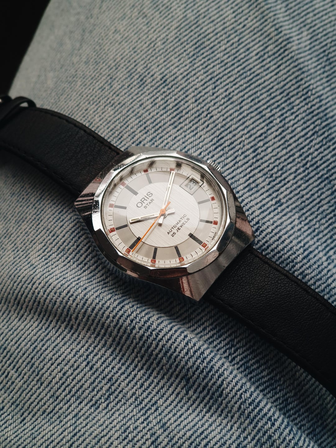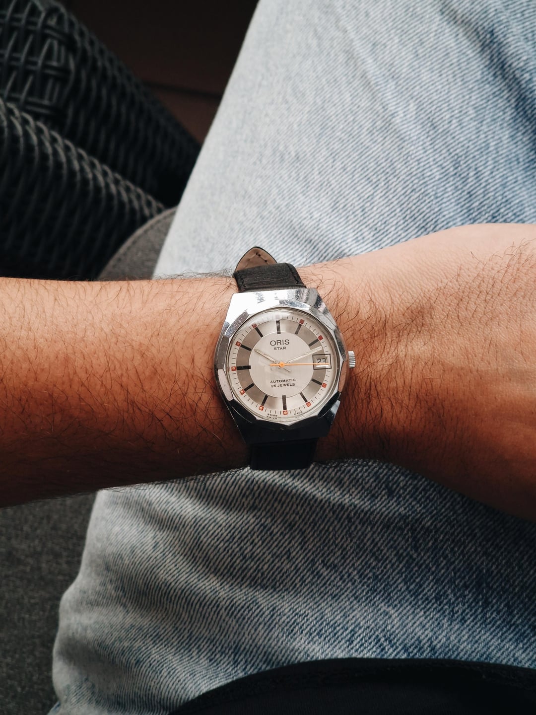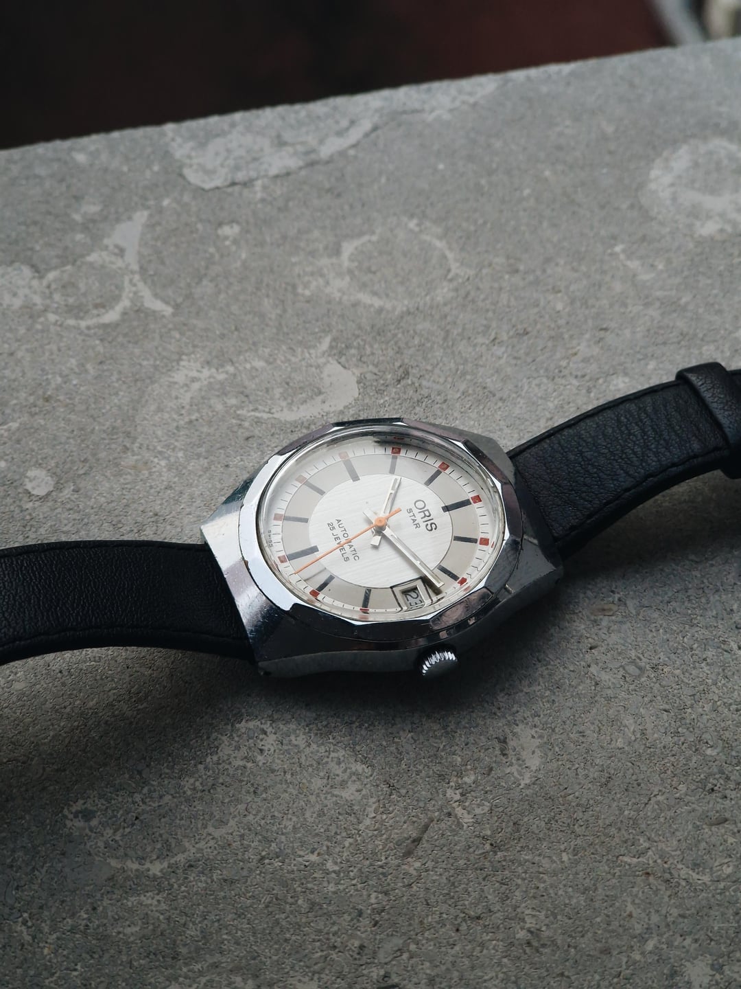 The Oris Star is peak ’70s charm: funky case, scalloped bezel, white/silver sector dial with red accents, and an orange seconds hand to further nail the vintage look. Plus, it’s powered by an Oris 645 automatic movement that looks incredibly clean for its age. **Condition:** Good condition for its age. Some markings on the case, but the crystal and dial look amazing. Please see the pictures for full condition and clarity. **Case Size:** 36 x 40mm with a thickness of 13.6mm and a lug width of 18mm. **Movement:** Oris 645 KIF, automatic with 25 jewels, 18,000 bph, and a power reserve of 45 hours. Service history is unknown, but everything is working as it should. **Price:** Asking $300. Please add $20 for worldwide shipping. Payment methods include Wise, ACH transfer, Revolut, Bitcoin (On-Chain or Lightning), or PayPal G&S for buyers with solid references. Add +7.5% for currency conversion fees on the latter. Portugal has suspended all local post shipments to the US, but I can still ship with UPS ($100). Established seller with over 220 transactions – buy with confidence! Make sure to follow me on Instagram (@daily.worn) to check out the newest additions. [Pictures](https://imgur.com/a/42DikIj) [Timestamp](https://imgur.com/a/qjUKNyw)