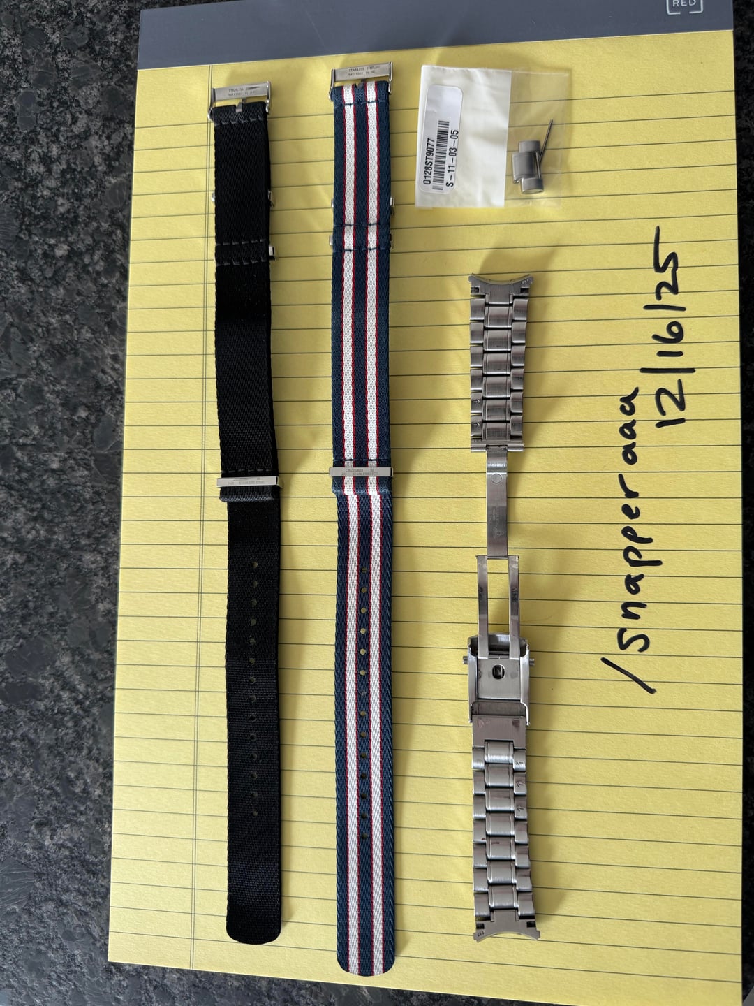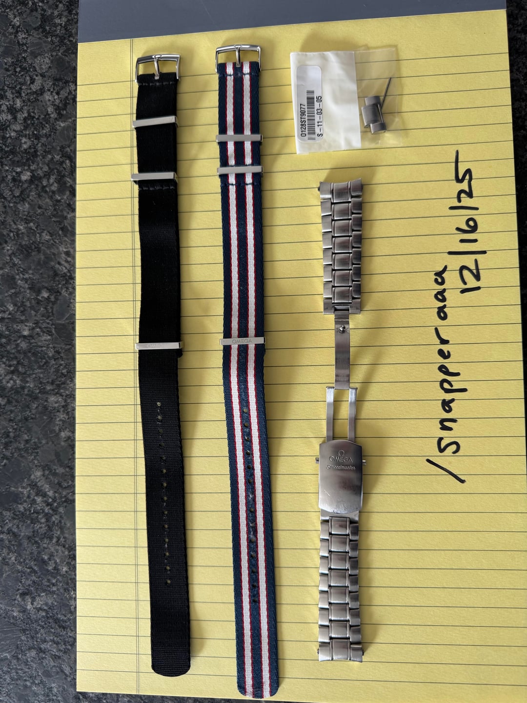 **For Sale: Omega Bracelet & Straps — Original / Lightly Used** Selling a few genuine Omega pieces — all in great condition because I'm not making use of them. **1) Original Omega 1620/887 Bracelet** * Genuine Omega steel bracelet (fits Speedmaster lug 20 mm) * Lightly used, excellent condition * Length \~ approx 7.5 inches * 20 mm at lugs, tapers to 18 mm at clasp * Asking **$700** * Bracelet reference: **1620/887**; clasp ref often seen as **117ST1620887** **2) Unused Omega Spare Link** for 1620/887 * Genuine Omega link for the same bracelet * New / never installed * Asking **$50** * Fits 1620/887 bracelets (link part compatible with model) **SOLD. 3) Genuine Omega Black NATO Strap** * Very lightly used * Omega NATO 19-20 mm, fits most Speedmasters and 20 mm lug watches * **SOLD** **4) Omega Blue/Red/White NATO Strap** * Very lightly used * Omega NATO 19-20 mm, fits most Speedmasters and 20 mm lug watches * Asking **$110** **Notes:** – Prices flex if you make an offer to buy the whole LOT. – Zelle, PayPal and Venmo accepted. USPS Priority Mail included. . – Photos available on request. – U.S. only. PM me if interested or for more pics, specs, etc. Thanks.