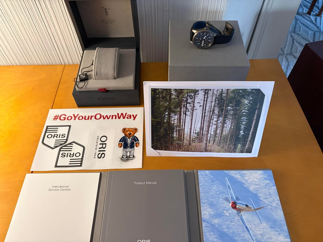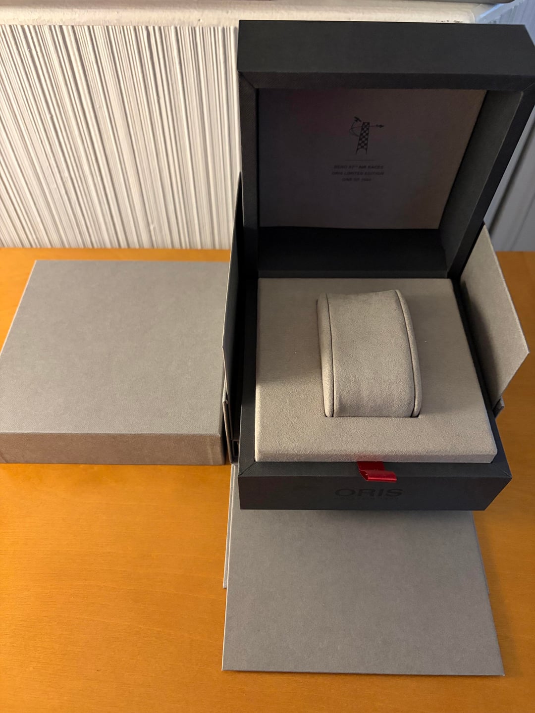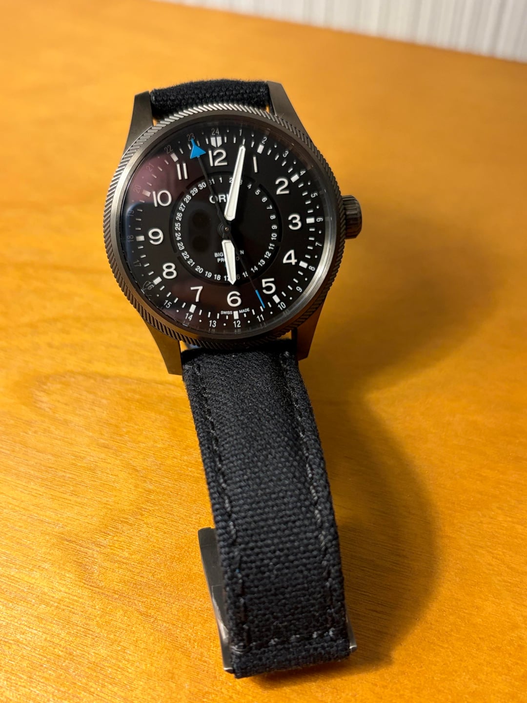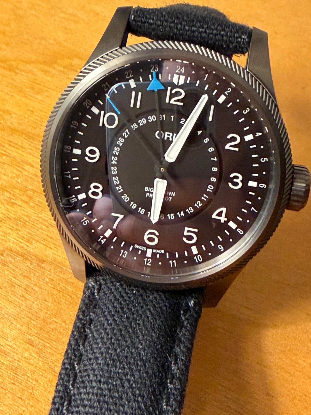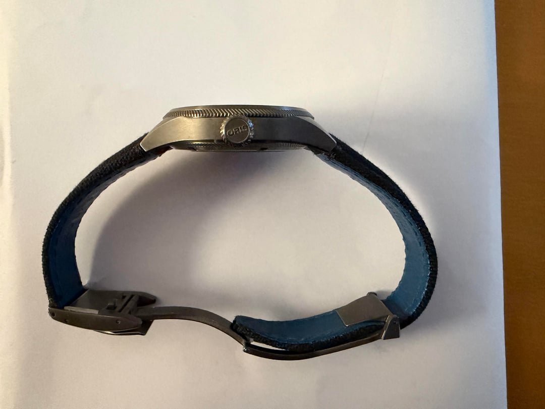 I'm selling this Oris Big Crown Propilot 57th Reno Air Races limited edition GMT. The watch was bought by its first owner in 2020, and I bought it from him in early 2021. The edition was 1,000 pieces and the certificate is included showing that this watch is number 000x out of the 1,000. Overall condition is excellent. Sale includes the full kit including boxes, manuals, certificate, warranty card, and a sheet of stickers. The 41 mm stainless steel case is finished in a gray PVD coating; the clasp on the strap has the same finish. The black dial has the full numerals characteristic of the Propilot series, along with minute markers and an outer numeral track indicating 24-hour time for the GMT function. The inner ring indicates the date with a blue arrow. The GMT hand and the second hand have blue tips. The adjustable black textile strap is lined in blue (leather? synthetic? I don't know). Original list price for this watch was almost $3,000. I'm asking a negotiable $1,500, but please don't waste my time or insult me with lowball offers. Oris product info page: [https://www.oris.ch/en-US/product/watch/propilot/57th-reno-air-races-limited-edition/01-798-7768-4284-Set](https://www.oris.ch/en-US/product/watch/propilot/57th-reno-air-races-limited-edition/01-798-7768-4284-Set) Please leave a comment here before messaging. Not interested in trades. I've been active on WatchExchange since 2019 and have built up positive feedback as both seller and buyer. I've been on eBay since 1999 and have 100% feedback as both seller and buyer (more than 600 transactions). I also have over two dozen sales on Grailed with positive feedback from buyers (message me for my user ID if you want to review either of those). Please get in touch if you want more info or pics. Given increased recent reports of fraud/attempted fraud on this sub, I'm happy to provide a custom timestamp, or do whatever I can to make you comfortable.