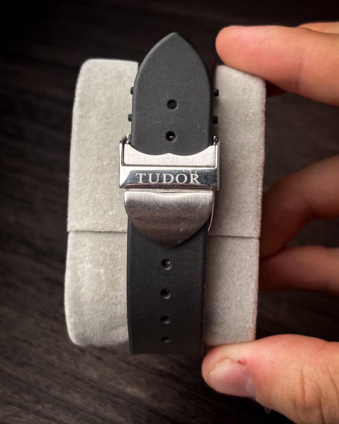 Condition — Very good overall with honest wear. Stainless steel case shows visible surface scuffs and brushing wear along the lugs and case sides, consistent with regular use and visible under direct light. Case edges remain well defined with no dents or deep gouges. Black aluminum bezel shows light wear with small marks around the insert; numerals and minute markers remain clear and intact. Domed sapphire crystal appears clean with no chips or scratches visible; minor reflections present at certain angles only. Black gilt dial is excellent — text is crisp, lume plots are full and evenly colored, and hands show no corrosion or damage. Crown operates smoothly and threads properly. Caseback shows surface wear and hairlines consistent with use. Currently fitted on an aftermarket rubber strap, paired with the original Tudor signed clasp, which shows visible scuffing and surface marks from wear. Box & Accessories – Watch only. Price – $2,099 shipped (Zelle / Wire preferred). Apple Pay / Venmo +15. Sales tax required for GA buyers without resale certificate. Shipping – Fully insured FedEx 2-Day within 24 hours of cleared payment. Timestamp – Included in photos. Overview – Tudor Black Bay (Ref. 79230N). 41mm stainless steel case, black gilt dial, black aluminum bezel, screw-down crown, 200m water resistance, COSC-certified automatic movement, and classic Black Bay proportions with strong wrist presence.