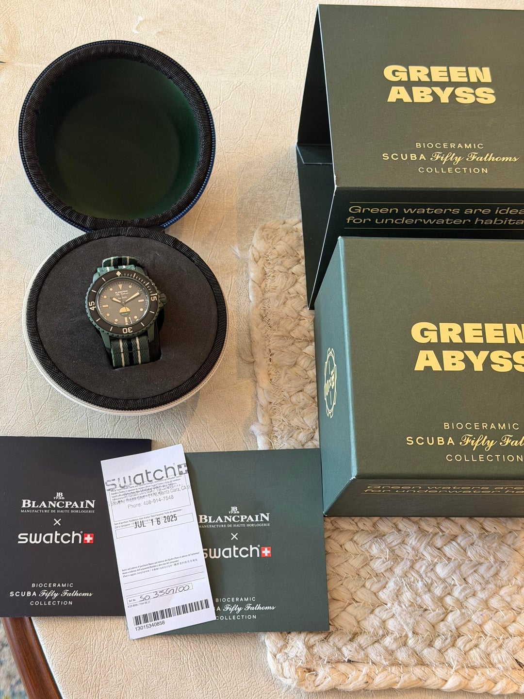 Swatch X Blancpain Green Abyss Completely full set + Topper warranty **$399** / Zelle, Venmo, or WU accepted. Timestamp: https://imgur.com/a/rInIM9A I have tons of references on multiple platforms including WatchExchange. I am more than happy to show these.