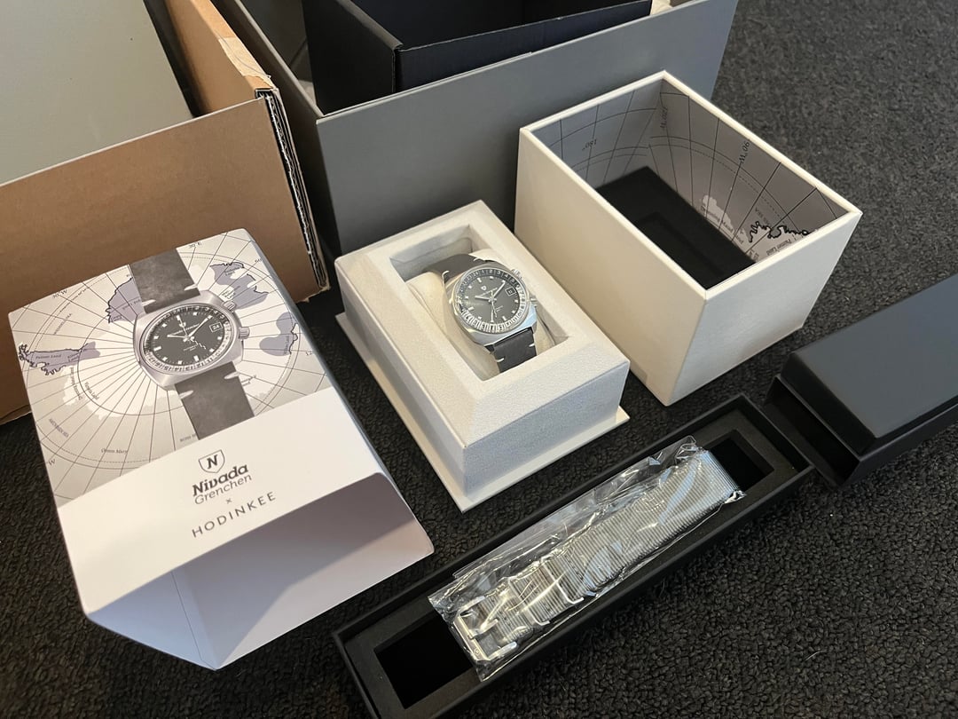 This is a truly special (and very hard to find) numbered LE from Hodinkee. There’s not much I can say about the watch that beats Hodinkee’s description, so I have that pasted below. NG is a super cool brand, and this is my personal favorite watch in their catalog (although, no longer available, as it sold out in ~24 hours). The watch is in near perfect condition, with the exception of some light surface marks on the non-crown side of the case. I wore this watch a handful of times on a DeLugs rubber strap, which means it was *never* worn on either of the original straps. So, those are brand new. It’s the absolute PERFECT size. Selling as I’m making room for other stuff. The watch comes with everything it came with brand new, including all boxes. I’m asking $2,700 (inclusive of overnight, fully insured shipping), but open to offers, so just send me a chat! I’m sure this one will go quick. From Hodinkee: Our Limited Edition is a thoroughly modern and Hodinkee-tweaked take on the original reference 87013. Guillaume Laidet, Co-Founder and Chief Brand Officer of the revived Nivada Grenchen, points to that same 1960s example as the direct inspiration for the resurrection of the Antarctic GMT line. The mainline version arrived in 2024, but as always, we found room to make it our own.At 36mm in diameter and 40mm lug-to-lug, the previous black and tropical dial variants have proved to be a success with collectors. This 225-piece limited edition builds on the motifs from the "Grey Glow" Hodinkee exclusives, while high-contrast design changes simplify the look and make for a more robust, go-anywhere GMT.What stays is the reliable, automatic, and self-winding SOPROD C125 movement, with 42 hours of power reserve and a frequency of 4Hz. With that comes a 24-hour rotating inner bezel, adjusted via the crown at 2 o’clock. The crown at 4 o’clock independently adjusts the GMT hand and date in the first position and the 12-hour time in the second. Most importantly, we’ve upgraded the crystal to sapphire, which doubles the water resistance from 50 to 100 meters, a feature exclusive to our Limited Edition and more in line with the Antarctic’s hard-wearing history. On the dial, keen eyes will pick up the change in branding as the full Nivada Grenchen logo is now on display at 12 o'clock, while a modest "AUTOMATIC GMT" completes the look on the bottom half. Forgoing the script "Antarctic" altogether, the resulting look is perfectly balanced. Matching the applied hour markers, nearly every part of the watch that is white, including the applied writing, the inner GMT bezel, and the handset, is finished in Super-LumiNova, which glows bright green in low light.The case is equally considered. The top portion is vertically brushed as opposed to the polished finish of the mainline Antarctic GMT, tying the Hodinkee version further to the original brushed compressor case that was supplied by Ervin Piquerez S.A. (EPSA). The case thickness is a svelte 11.1mm, a nearly 2 mm reduction from the 12.75mm of the original and the caseback offers a further nod to the vintage example, with a stainless steel penguin engraving on a steel medallion instead of gold. The piece is completed with the option of two straps — a hard-wearing grey NATO and an equally robust grey leather strap.