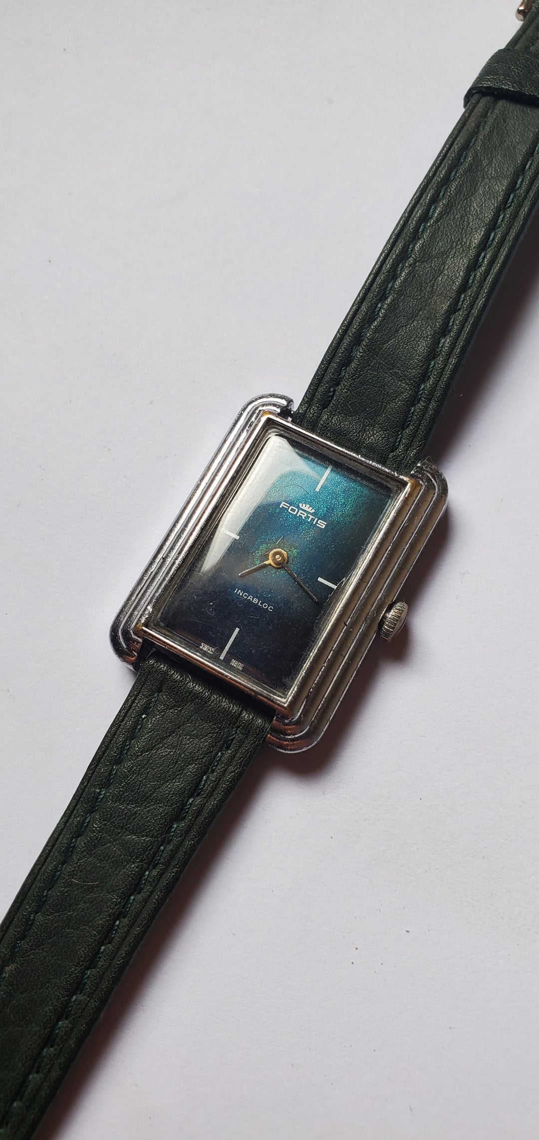 [Timestamp](https://postimg.cc/5Qpcz43Q) Hello everyone, I am selling this simple and lovely piece: • Fortis tank • Manual winding • Blue/green dial • Case size: 27 × 37mm • Watch only $110 USD shipped worldwide from Egypt (add $25 for Australia and New Zealand) Payment: PayPal FF / GS + fees DM for photos or videos!