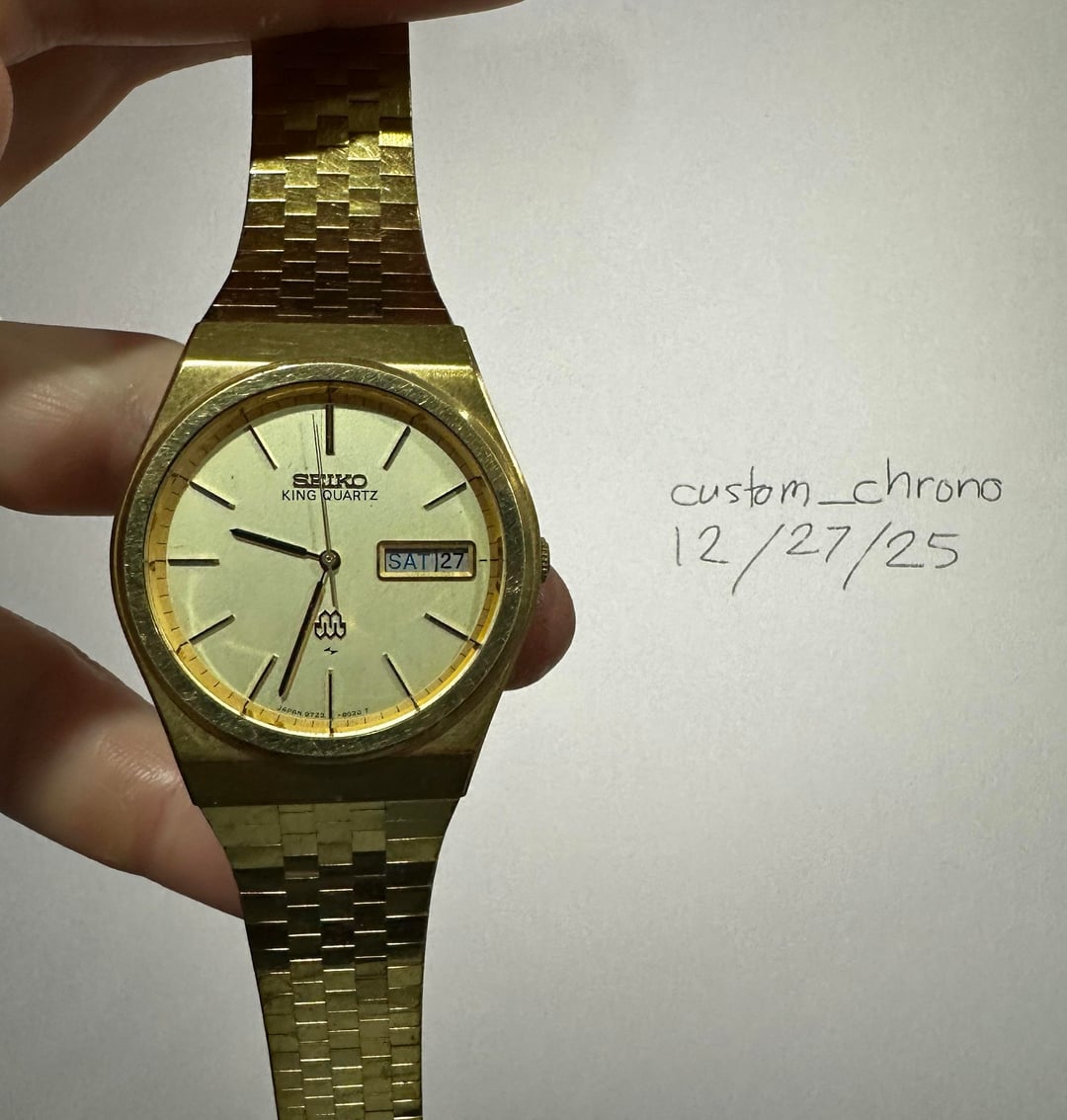 hello all i have an awesome gold seiko king quartz 9723-8030 up for sale. over all the watch is in beautiful condition- especially the dial. there is some slight wearing of bracelet on the clasp side, but not unexpected for a watch this age. it measures 35.2mm diameter, 8.3mm thick, and a 40.3mm lug to lug. lug width is pretty negligible because of the semi-integrated bracelet design. this’ll wear great on wrists big or small! asking $265 shipped CONUS via USPS priority shipping. i take paypal and just add 3.5% to the total if you use the Goods and Services option. let me know if you have questions, thanks!
