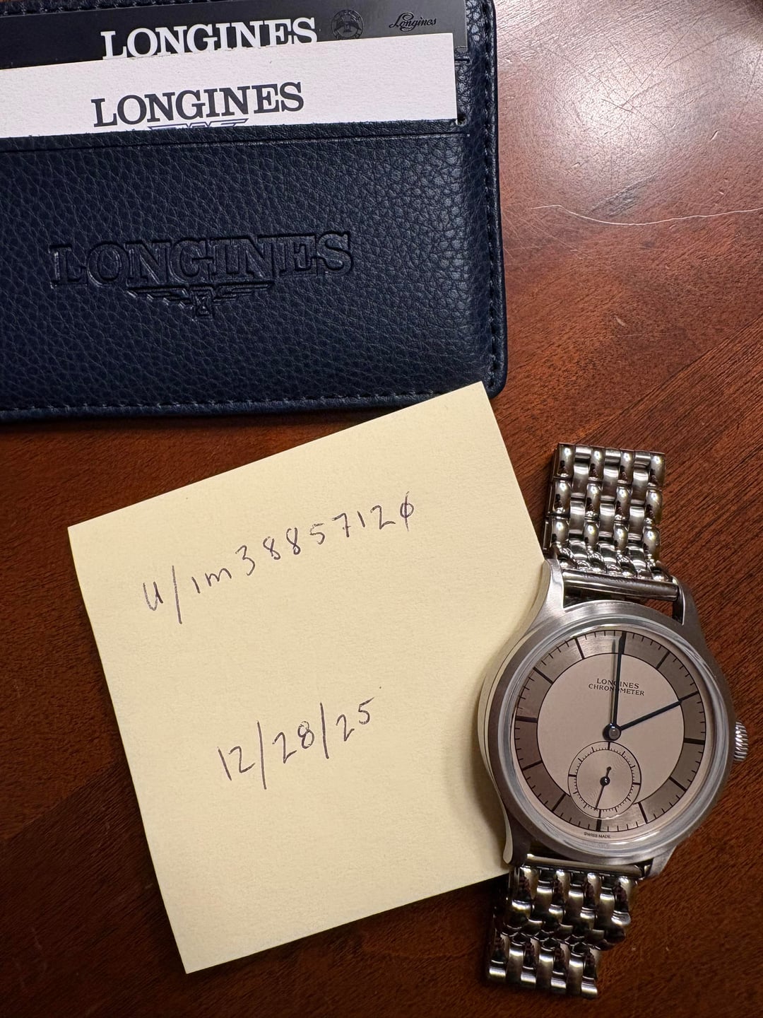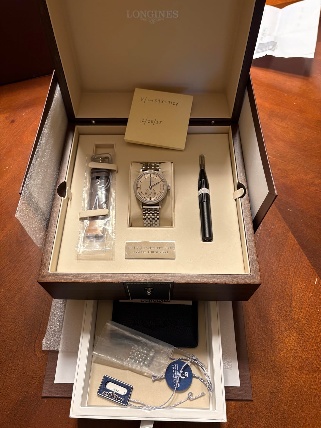 [Album and timestamp](https://imgur.com/a/ZmJ43xU) Hey Watchex, today I’m selling a Hodinkee Heritage Classic in fantastic condition. Most enthusiasts know about this one, but full details are here: [Longines | Limited Edition for HODINKEE | HODINKEE](https://limited.hodinkee.com/longines/) This comes as a full set and includes the original pick ticket from Hodinkee. Strap is unworn and bracelet and case show very little wear. I’m selling to fund another purchase, so no trade offers please. Asking $2500 by wire, Zelle, Venmo, or PayPal FF with shipping included. CONUS only please. Feel free to reach out with questions.