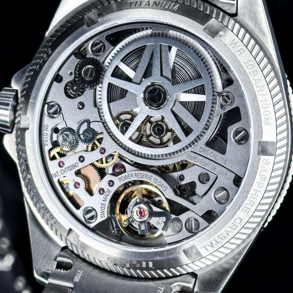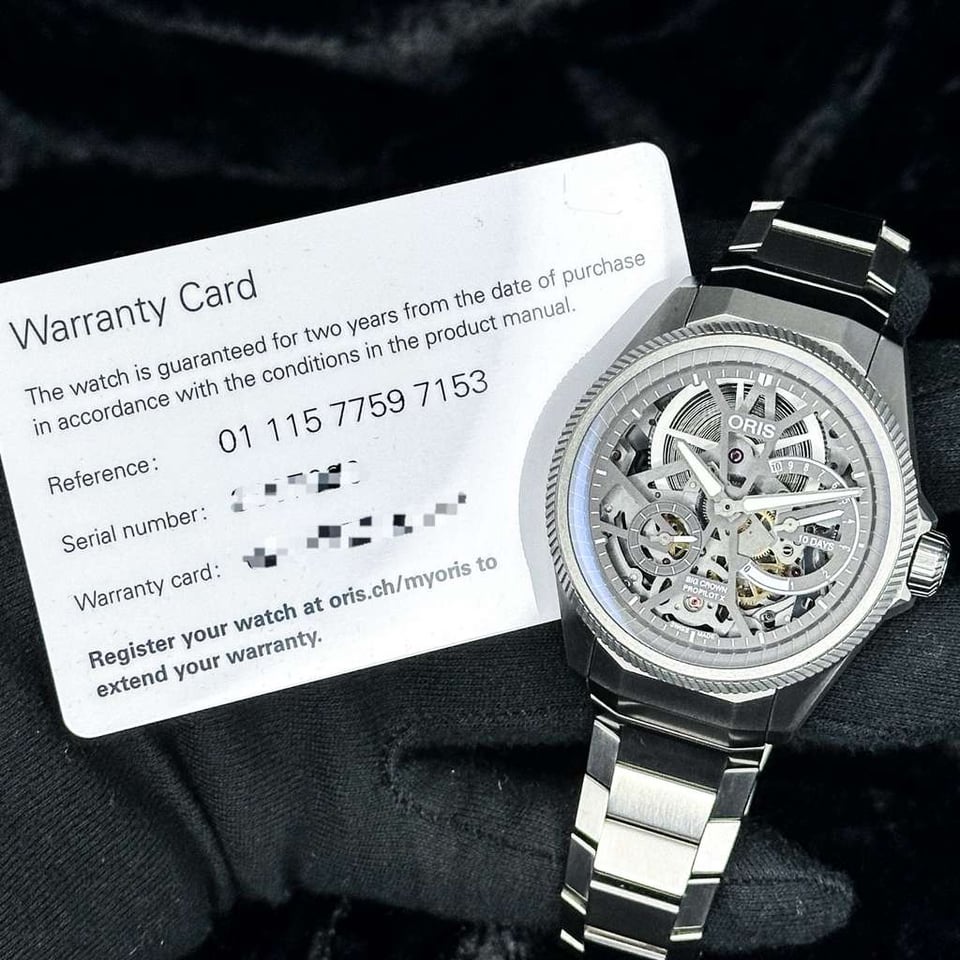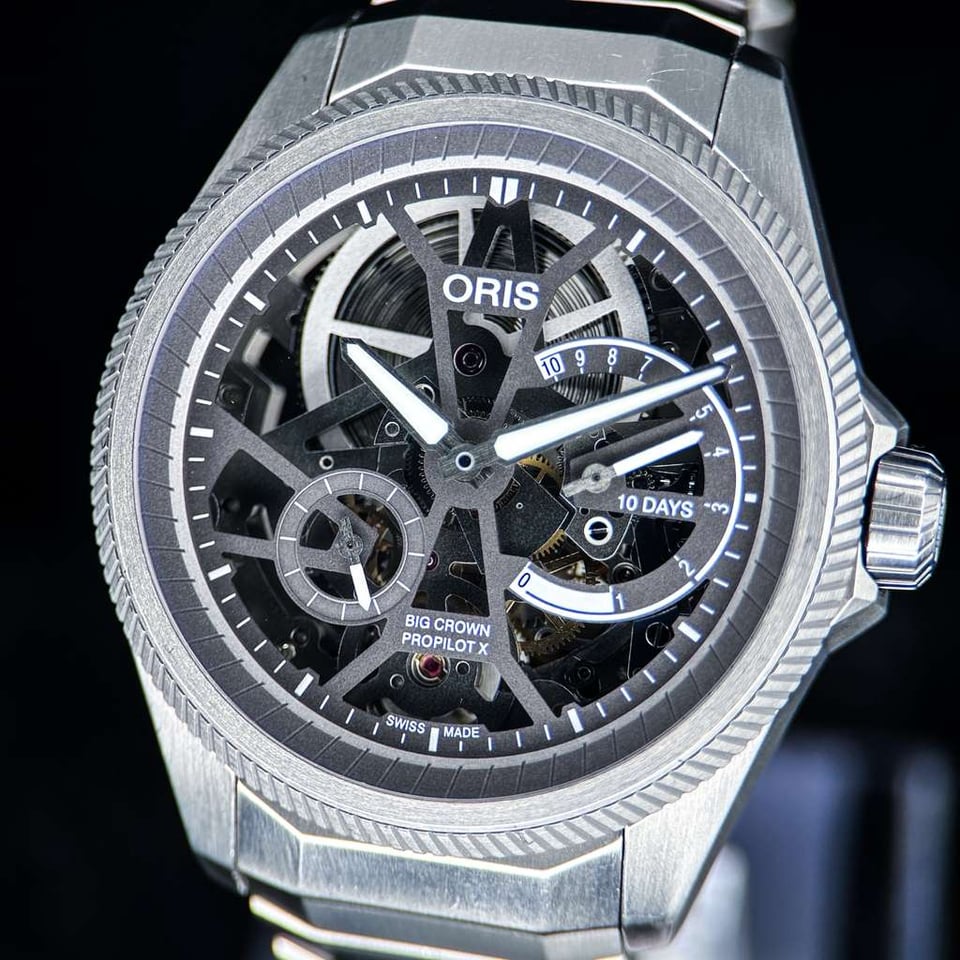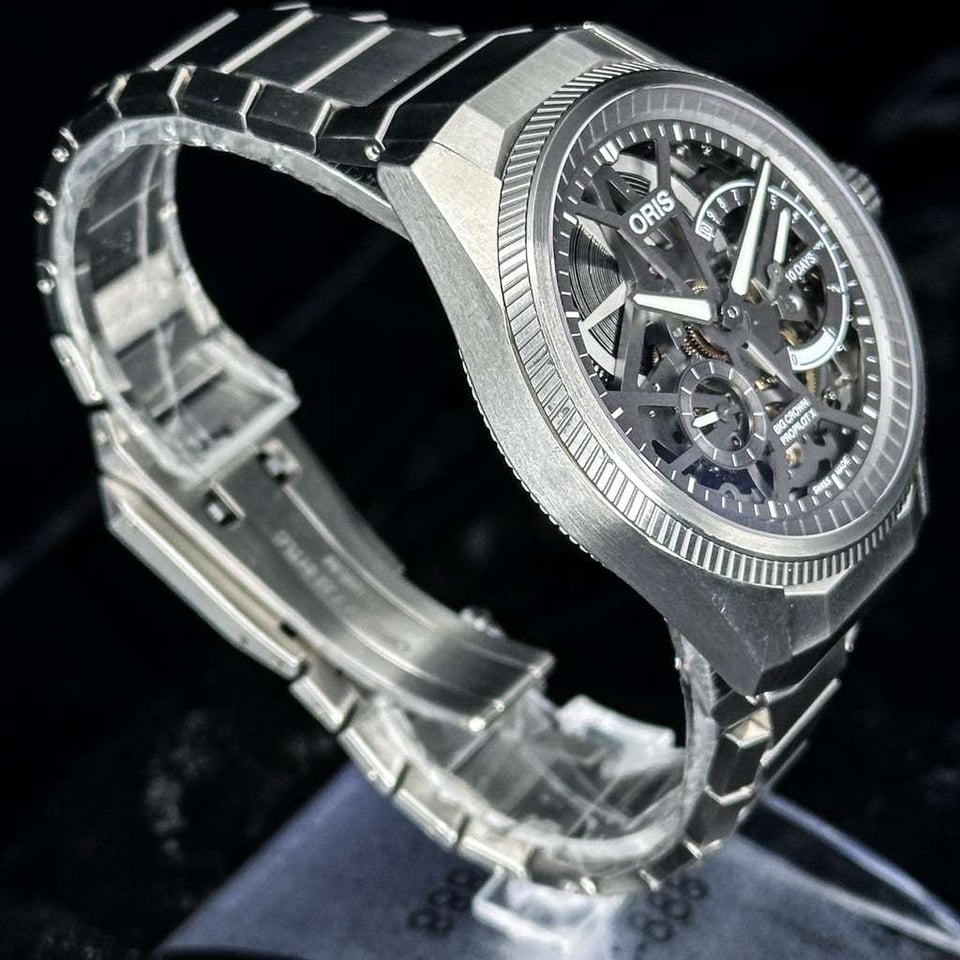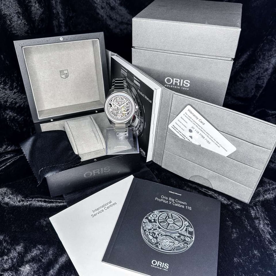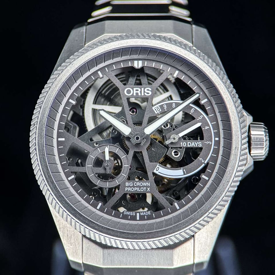 **Oris ProPilot X Calibre 115 | Titanium Skeleton** **Ref. 01 115 7759 7153 | 44mm | Titanium | Full Set | Skeleton Dial** **Price: $5,840** The ProPilot X Calibre 115 is a bold architectural statement that redefines the modern pilot’s watch through the lens of industrial transparency. Its fully skeletonized design invites the wearer to explore the mechanical soul of the timepiece, stripping away the traditional dial to reveal a complex landscape of sandblasted bridges and gears. Crafted from lightweight, multi-piece titanium, this watch offers a commanding yet weightless presence, appealing to the collector who prioritizes avant-garde aesthetics and the raw honesty of independent Swiss watchmaking. Beneath the multi-faceted titanium case lies the **In-House Calibre 115**, a manual-wind masterpiece featuring a staggering **10-day (240-hour) power reserve** from a single oversized barrel. This power is monitored by a patented non-linear indicator at 3 o’clock, which tracks the remaining energy with increasing precision as the wind winds down. The integrated titanium bracelet is engineered for superior ergonomics, secured by Oris’s "LIFT" clasp, while the 100-meter water resistance ensures that this high-horology instrument remains remarkably practical for daily wear.
