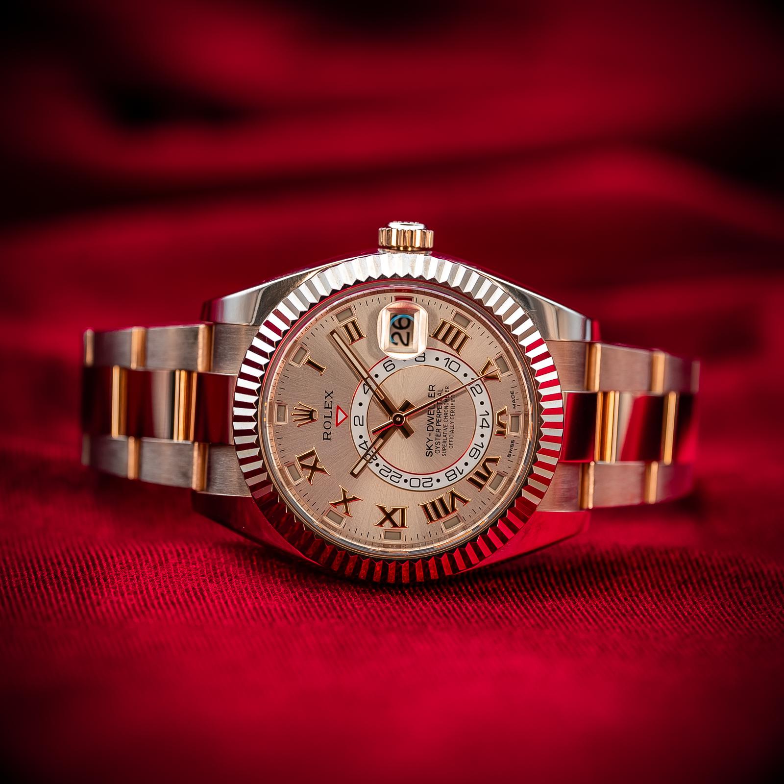 A personal favorite statement piece of mine, the Rolex Sky-Dweller in striking 18kt rose gold has a stunning wrist presence that is hard to beat. The gold case and bracelet, along with the brilliant sundust dial and the fluted bezel all combine to create a level of shine that few other timepieces can match. For world travelers, the dual time zone and annual calendar features are not only stylish but functional as well. This watch presents in excellent condition, with little to no signs of wear. Please reference the photos for the most accurate representation of the condition of the watch. We do our best to emphasize, rather than diminish any flaws through our macro photography. This timepiece comes as a complete set with its inner box, outer box, booklets, green tag and warranty card dated 2018. Price is **$42,595**, which includes **free overnight CONUS shipping**. Forms of payment accepted: **Bank wire, Crypto (+2%), Credit Card (+3.9%), Affirm (+6.9%)** We ship **fully insured overnight via FedEx or UPS**. We are happy to hop on a call or FaceTime to show you the watch or answer any questions - please do not hesitate to reach out. We stand behind our watches being as described and authentic – we are very customer service focused and strive for 100% positive transactions each and every time. Thank you for your time! **Pictures:** https://imgur.com/a/UVipUMQ **Timestamp:** https://imgur.com/a/79WSNB1 Find us on Instagram **@TheStellarisCollection** --------------------------- Brand: Rolex Model: Sky Dweller Reference Number: 326935 Movement: Mechanical (Automatic) Movement Caliber: Rolex Calibre 9001 Number of Jewels: 40 Power Reserve: 72 hours Case Size: 42mm Case Material: 18k Everose Gold Bezel Material: Fluted 18k Everose Gold Dial: Sundust w/ Roman Numerals Year of Production: 2018 Original Box: Yes Original Papers: Yes Water Resistance: 100m (10 ATM) Crystal: Scratch Resistant Sapphire Crystal Bracelet Material: 18k Everose Gold Clasp: Foldover clasp Clasp Material: 18k Everose Gold Crown: Screw Down Functions: Date, GMT, Annual calendar Gender: Men’s Watch/Unisex ---------------------------